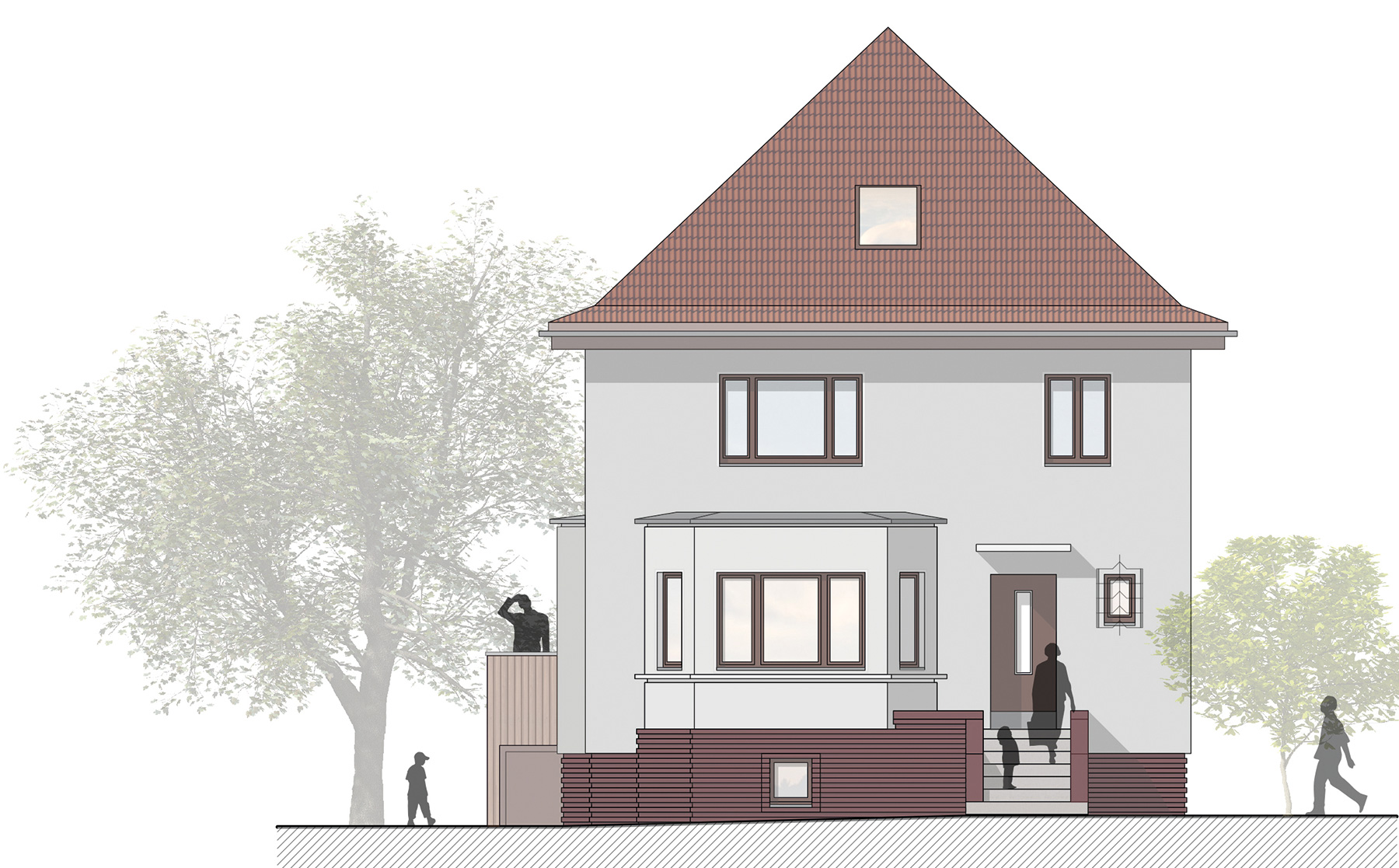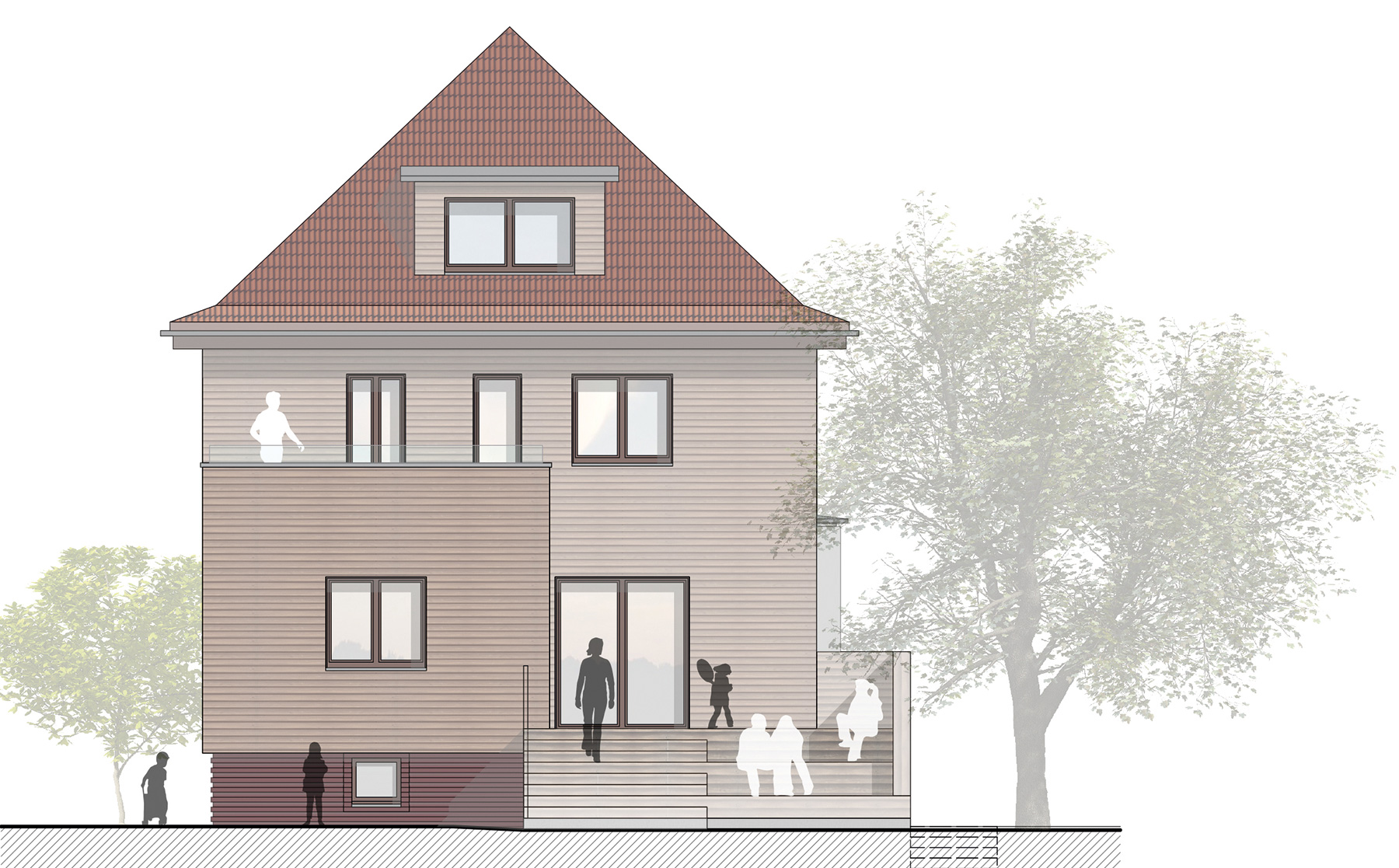 Zielsetzung war, die guten Proportionen und Details, Materialien und Oberfächen des Bestandsgebäudes weitgehend zu erhalten. So wurde der Hohlraum des zweischaligen Mauerwerks für eine Einblasdämmung genutzt und zum Teil kam eine Innendämmung zum Einsatz. Dadurch bleibt der straßenseitige Erker wohlproportioniert und wird trotzdem energetisch ertüchtigt. Im Kontrast zur verputzten Straßenseite erhält die Gartenseite eine hinterlüftete Holzfassade, die mit der neuen Holz-Terrassenanlage korrespondiert.