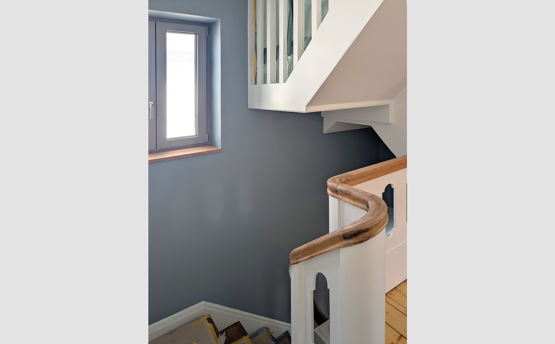 Im Inneren wird es an den Wänden dezent farbig, wodurch die aufgearbeiteten Originalböden aus Holz und Terrazzo und die bauzeitliche Holztreppe besonders gut zur Geltung kommen. Manche historischen Details wurden aufgegriffen und neu interpretiert - so taucht das Motiv der Fenstergitter, die aufgearbeitet wieder zum Einsatz kommen werden, auch an der neuen Brüstung der Dachterrasse auf.