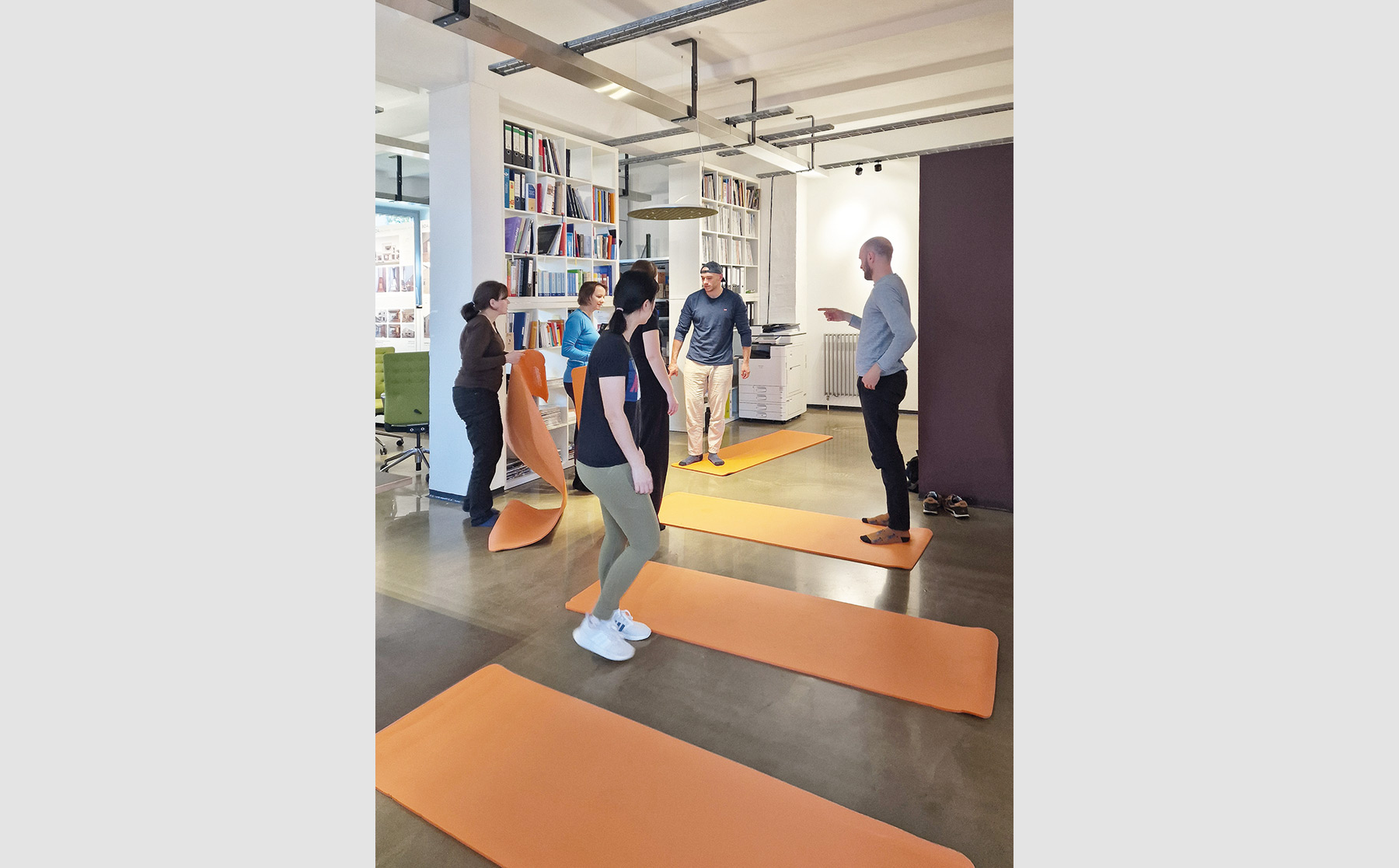 Die orangefarbenen Matten liegen bereit und werden einmal die Woche ausgerollt. Dann geht es los mit dem Dehnen, Strecken, Stützen, Kreisen - und was Benno sonst noch so einfällt, um uns fit zu halten. Die 45 Minuten können ganz schön schweißtreibend sein, aber danach geht es umso entspannter wieder zurück an den Schreibtisch.