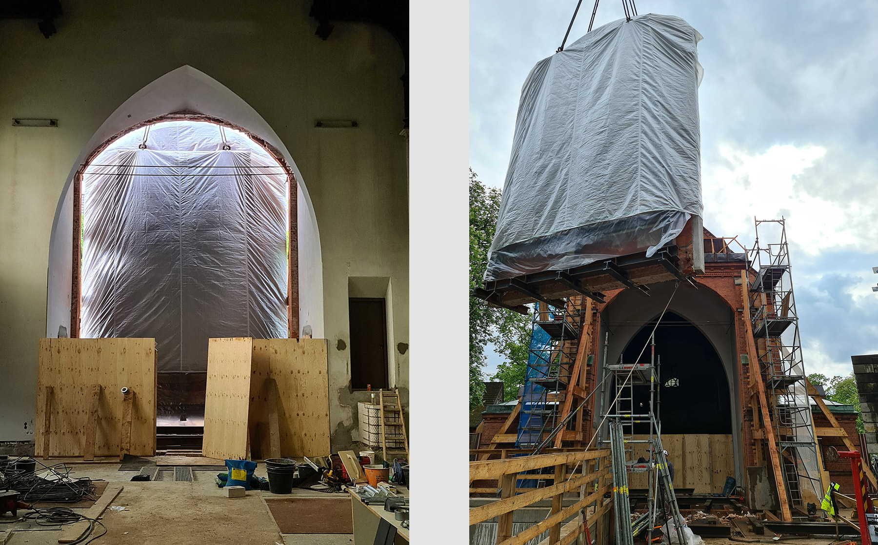 Nach dem Verschieben folgte das Anheben, Drehen und Absenken der 56 Tonnen schweren Chorwand mit dem Altarbild von 1938. Die Mannschaft und der 500-t-Kran arbeiteten zügig und behutsam, bis die Last sicher und passgenau in der Grube zum Stehen kam. Diese wird Kernstück des neuen Lern- und Gedenkortes für die Alsterdorfer Opfer der Euthanasie. Ein großes Lob für die Translozierungs- und Denkmalschutz-Fachfirma Bennert und ein großer Dank unserer Bauherrin, der Evangelischen Stiftung Alsterdorf.