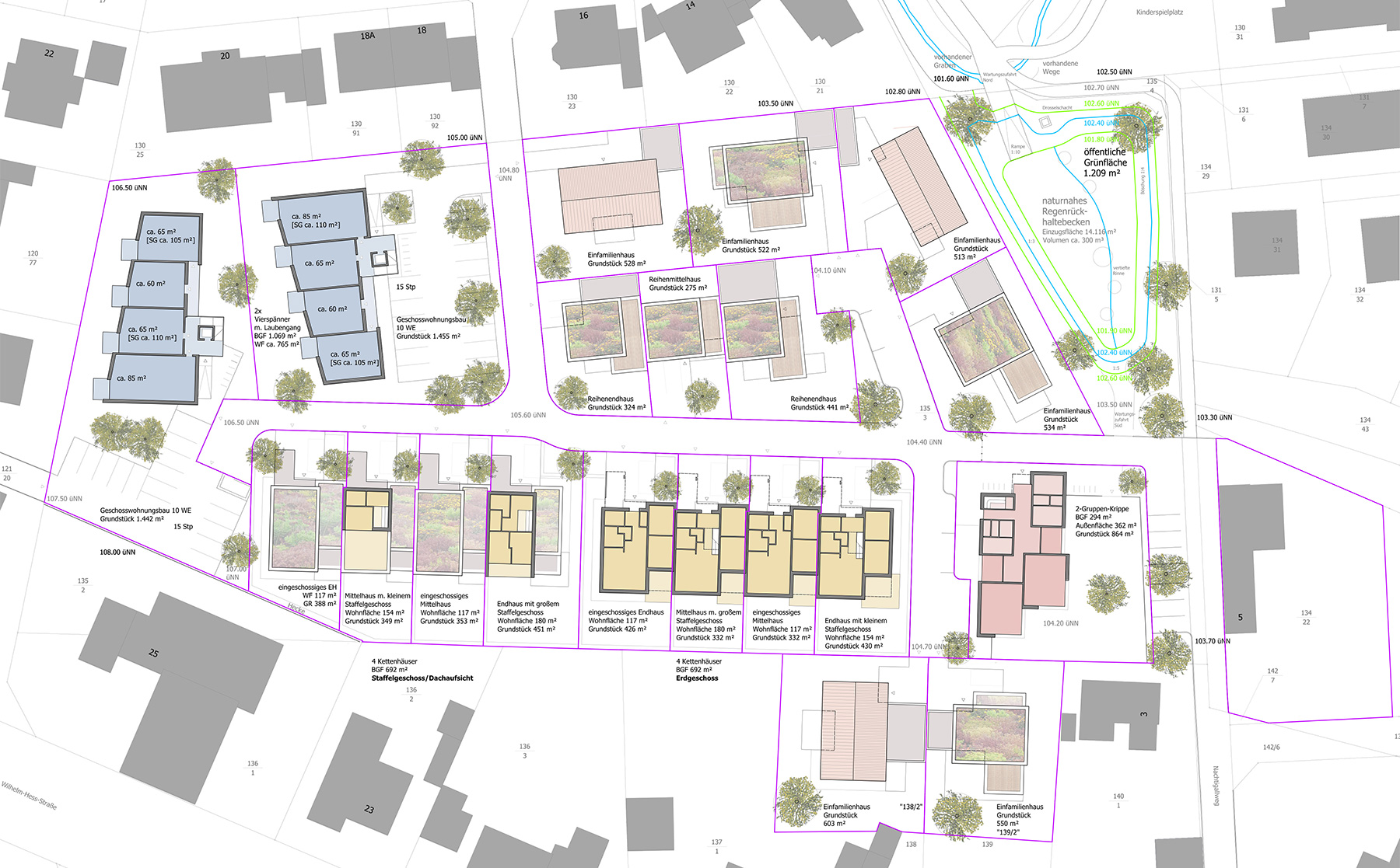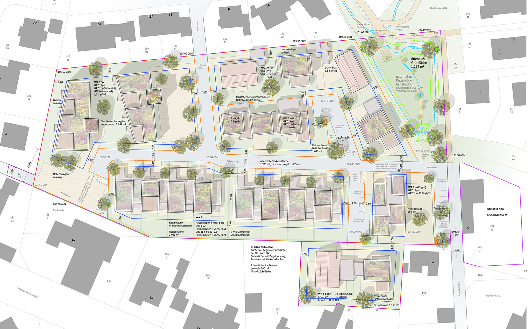 Die exemplarisch dargestellten Baukörper der Geschosswohnungsbauten und der Kettenhäuser reagieren durch Höhenstaffelung auf vorhandene Gefälle des Baugebiets. Die im Nordosten des Baugebietes vorgesehene, ca. 1.300 m² große öffentliche Grünfläche vervollständigt die vorhandenen Grünverbindungen vom Bullerbach zum Siedlungsrand der Kernstadt.