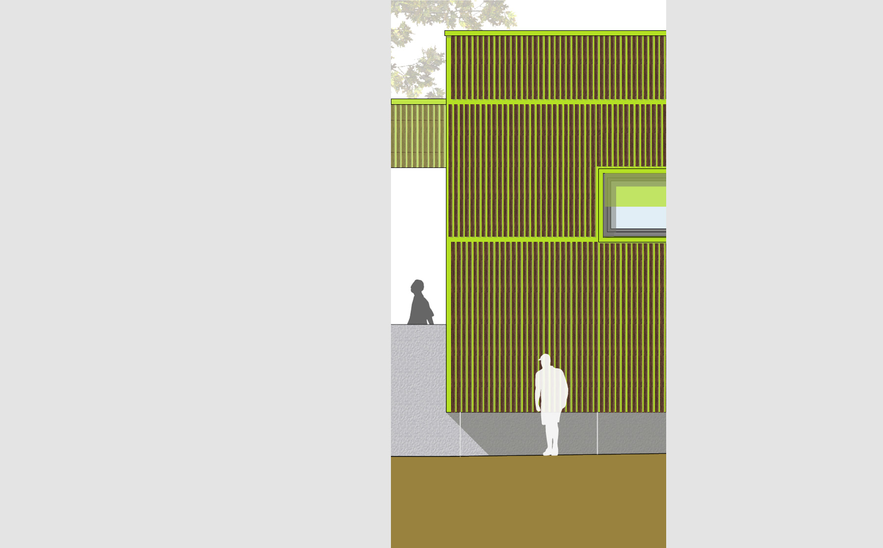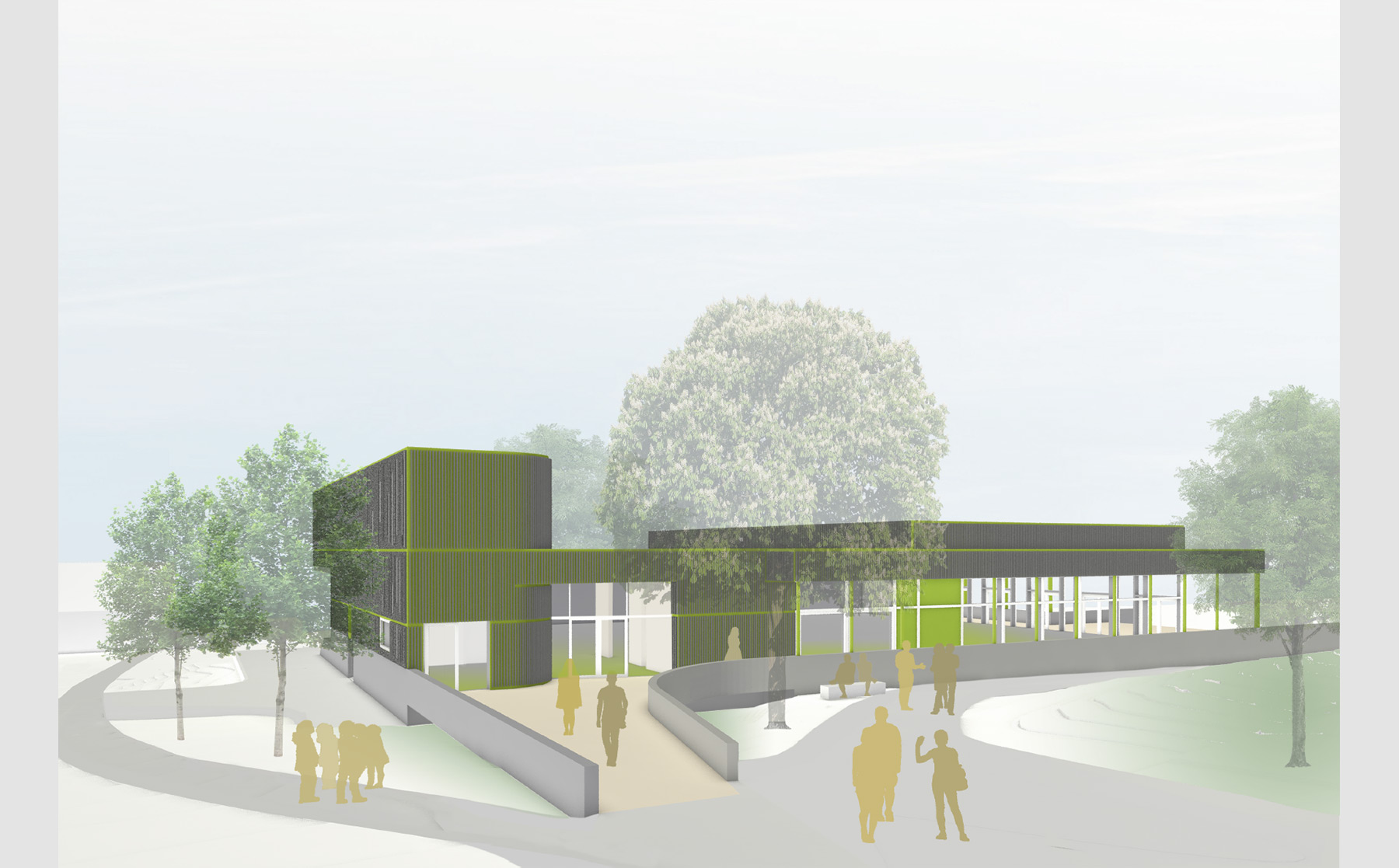In diesem Entwurf ist für den Mensaneubau ein klarer und kompakter Baukörper vorgesehen. Der Solitär ergänzt die S-förmige städtebauliche Figur des bestehenden Schulcampus und ist zwischen den Baumbestand in die nach Südosten abfallende Topographie eingepasst. Über eine Zugangsbrücke ist der Haupteingang des Mensagebäudes an den Vorplatz des Schulcampus angebunden, an dem sich knotenartig die vorhandenen Fußwege und Zufahrten treffen.
