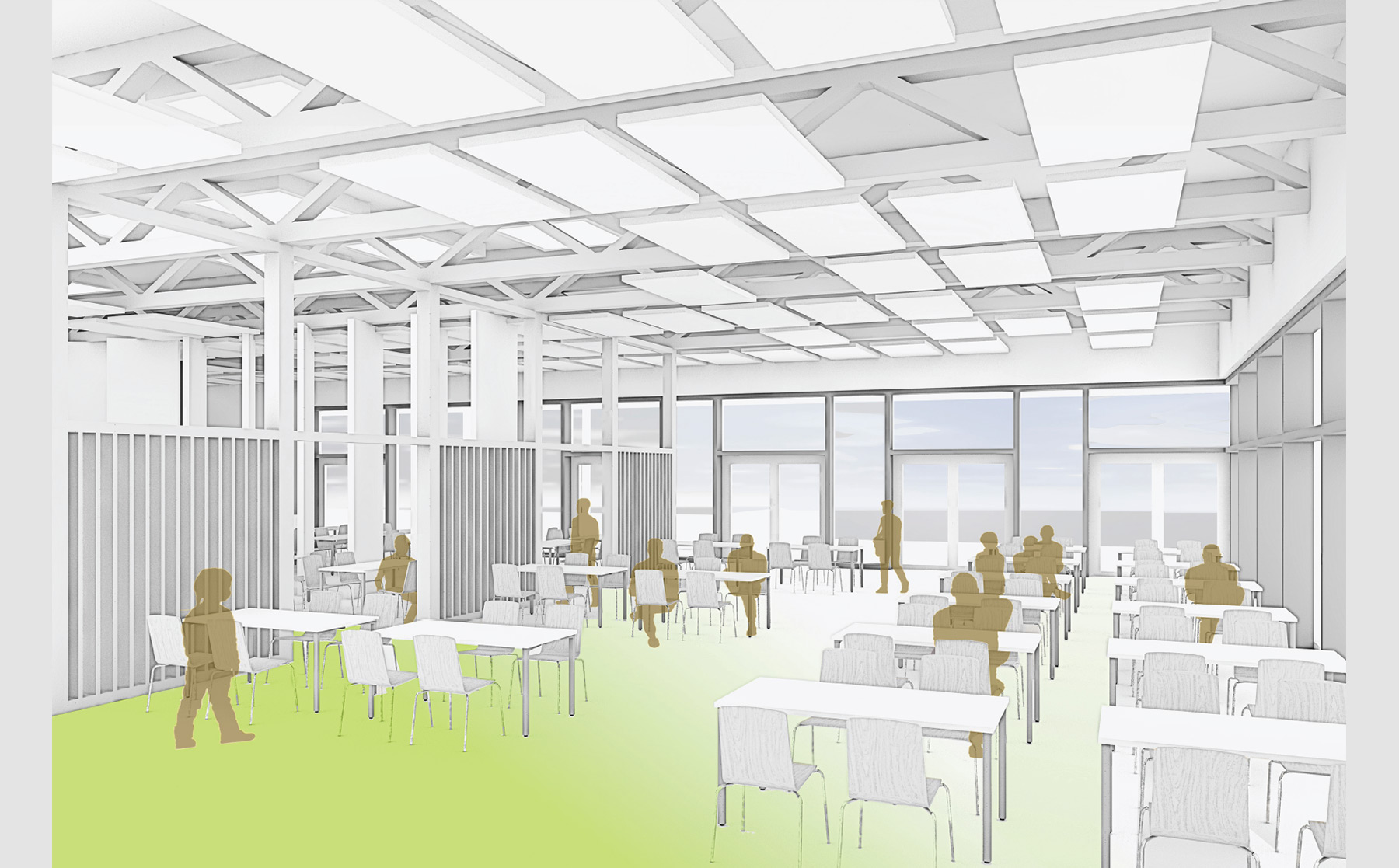 Das Foyer im Erdgeschoss verbindet die öffentlichen Funktionen des Gebäudes – von hier aus sind Jugendarbeitsbüro, Mehrzweckraum, Lounge und Gastbereich erreichbar. Die Raumstruktur des Gastbereichs mit seinen 200 Sitzplätzen vereint die Anforderungen an eine klare und effiziente Wegeführung, an die Zonierbarkeit in drei Bereiche für den alltäglichen Mensabetrieb und an die Flexibilität für großflächige Veranstaltungen. Das Obergeschoss dient als Technikgeschoss, im Untergeschoss befinden sich Nebenräume.