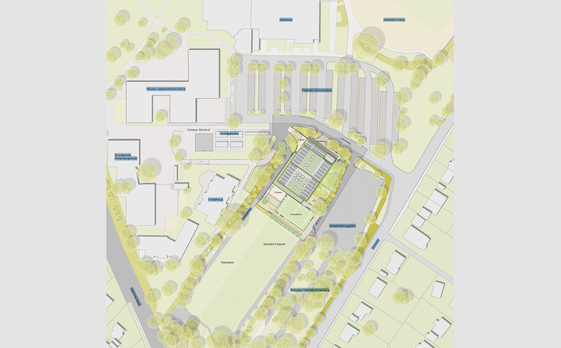 Auf dem Hohenberggelände in Rottenburg am Neckar soll eine Campusmensa für drei auf dem Schulcampus befindliche Schulen errichtet werden, die für ihren Ganztagsbetrieb eine gemeinsame Mensa benötigen.