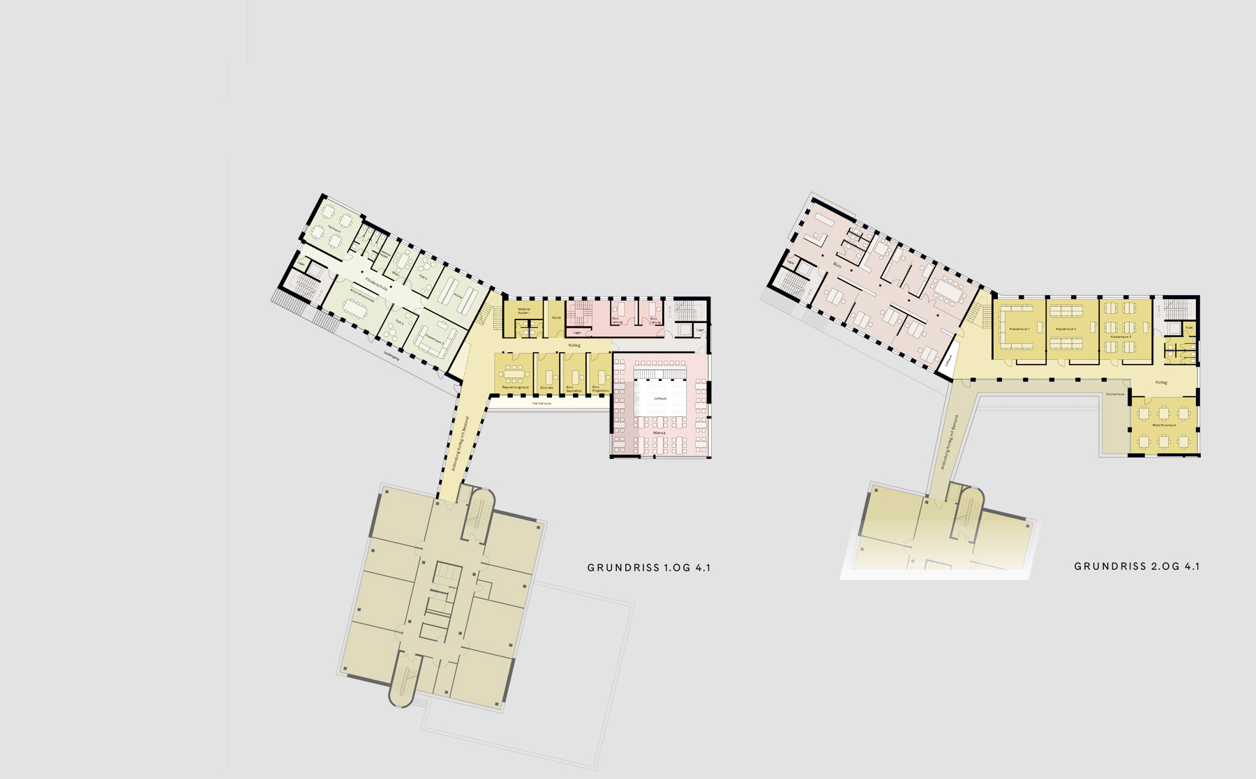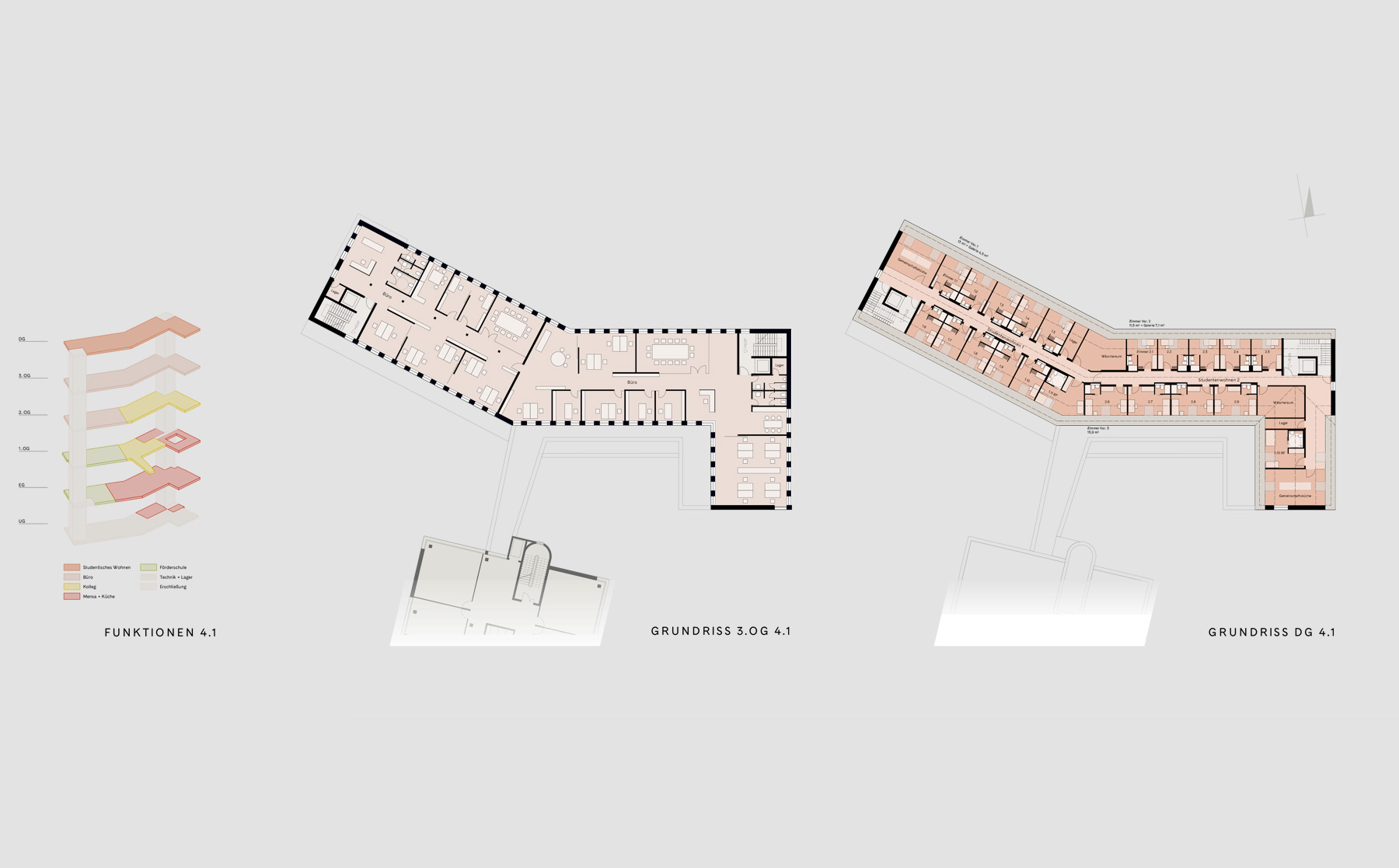 Zwischen dem Bestandsgebäude und den beiden neuen Baukörpern entsteht im Übergang zum Quartiersplatz die „Piazza“ als Mittelpunkt eines Campus aus den beiden Kollegbereichen, der Mensa und der Sporthalle, mit wichtiger Gelenkfunktion für das gesamte Quartier. Selbstbewusst zeigt sich der Südgiebel von 4.1 der Piazza und der Gasse zwischen Kolleg und 4.2. Die Erschließung von Mensa, Tagesförderung und Sporthalle erfolgt über die Piazza.