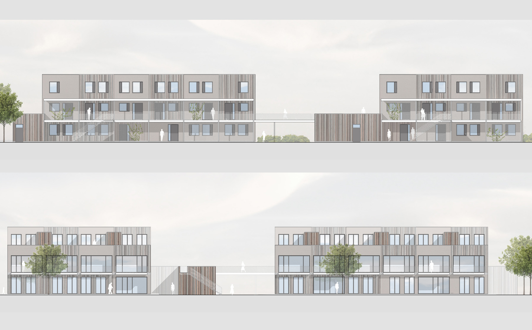 Grundlage der zwei unterschiedlich langen Flachdach-Riegel mit jeweils zwei Vollgeschossen und Staffelgeschoss ist ein gleichmäßiges Reihenhaus-Schottenraster. Die reihenhausartige Gliederung der einzelnen Einheiten erfolgt durch zwei Fassadenmaterialien: eine vertikal angeordnete Holzlattung und Putzflächen in warmem Grauton. Die Stahlkonstruktion des Laubengangs wirkt durch die weiße Fassung und das filigrane Gewebe als leichter und transparenter „Schleier“.
