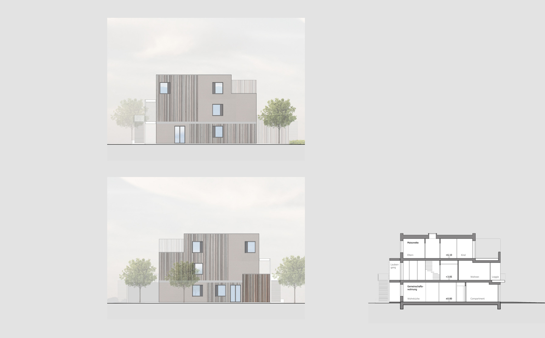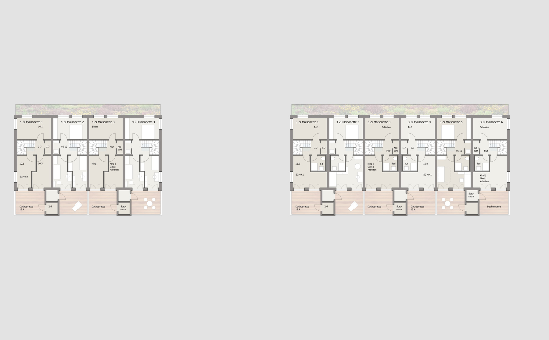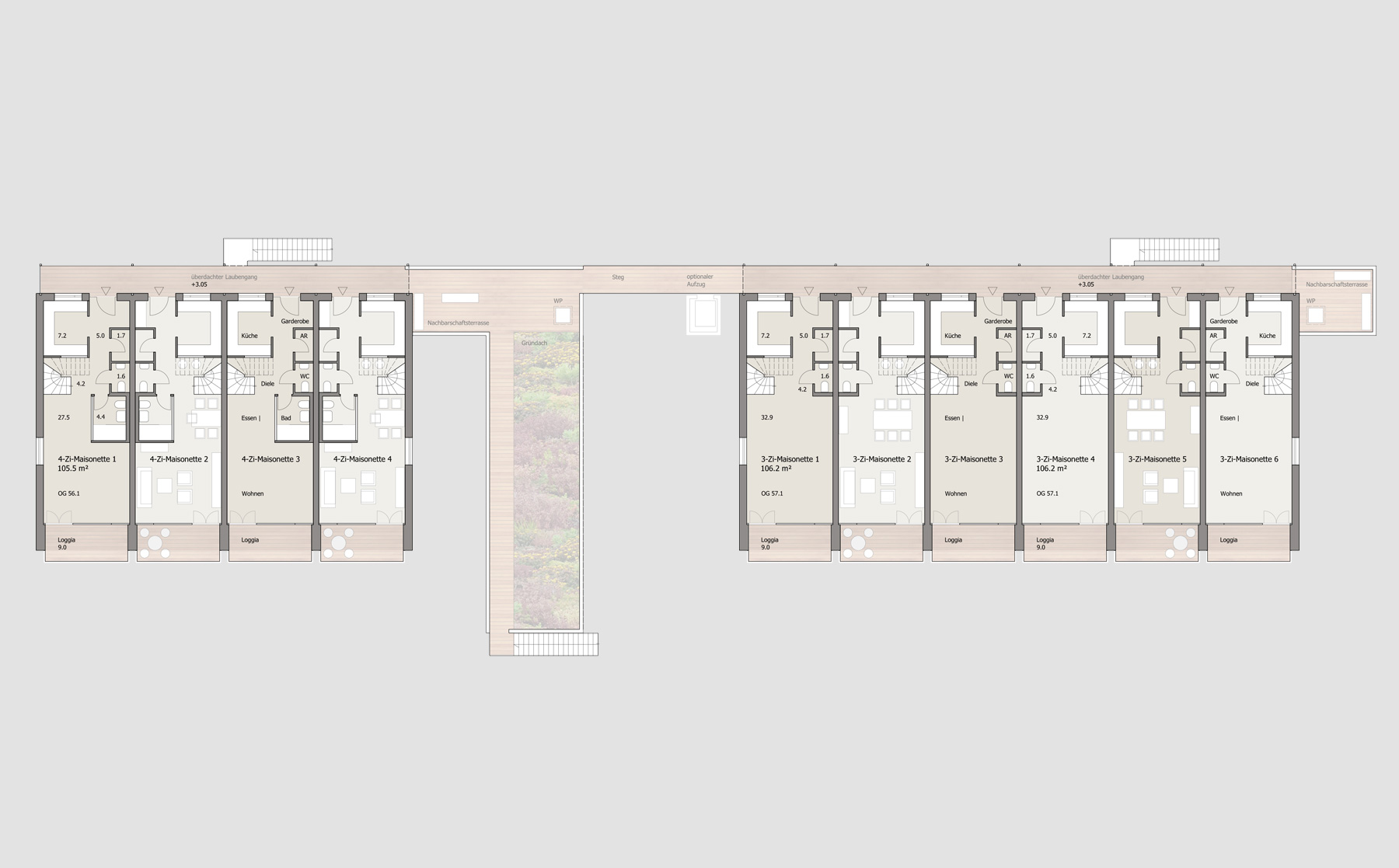 In den Obergeschossen orientiert sich das Wohnraumangebot an den Bedürfnissen des Familien- und Paarwohnens. Hier entstehen zwei unterschiedliche Typen von Maisonette-Einheiten, die über den Laubengang durch eigene "Hauseingänge" erschlossen werden und jeweils über südseitig ausgerichtete Loggien und Dachterrassen verfügen.