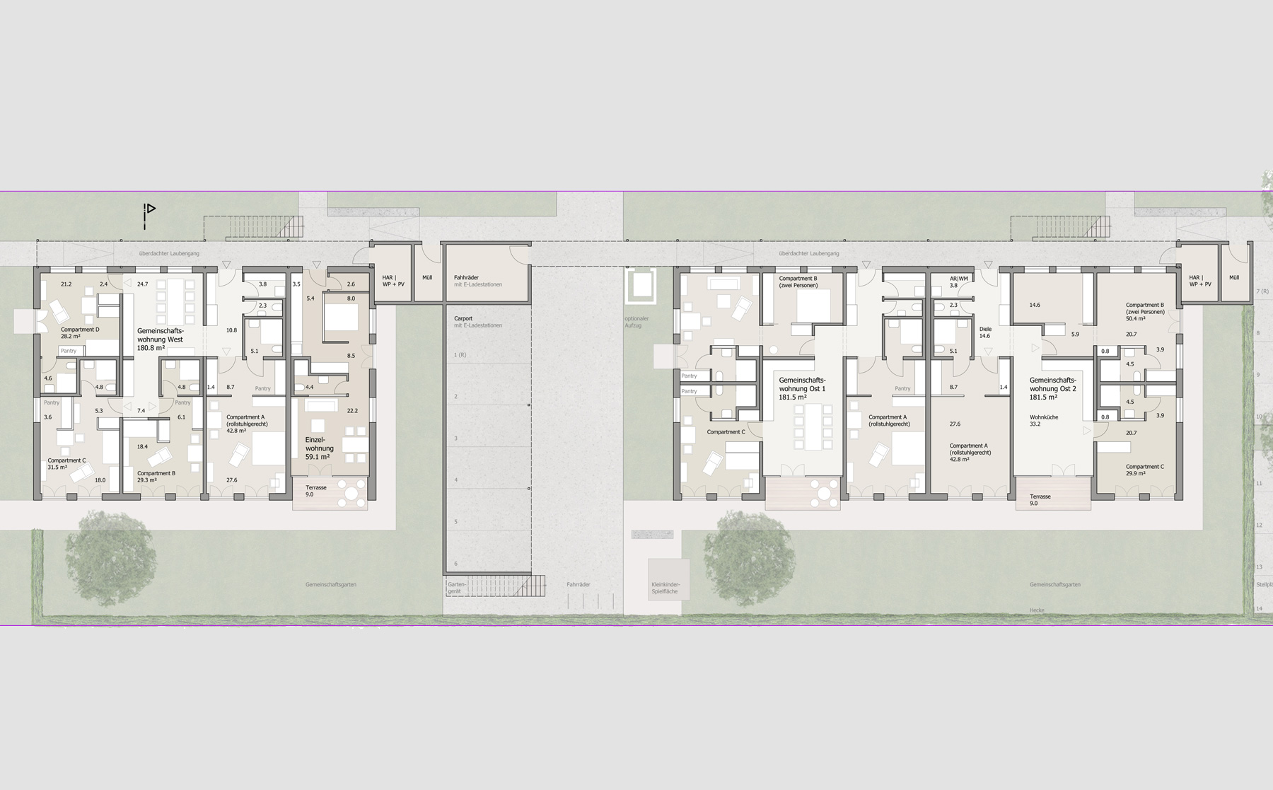 Das Konzept sieht vor, im Erdgeschoss Wohnraum für ältere Menschen zu schaffen,die die Gemeinschaft und die damit verbundenen Möglichkeiten nutzen möchten. Zu diesem Zweck verfügt jede Einheit über einen gemeinschaftlichen Bereich, bestehend aus einem großzügigen Eingangsbereich, Gäste-WC, Abstellraum und Essküche. Darüber hinaus bietet die gewählte Struktur ein hohes Maß an individueller Privatheit in sogenannten "Compartments". Diese verfügen jeweils über einen kleinen Kochbereich, Abstellraum, Wohn-/Schlafraum und ein Badzimmer.