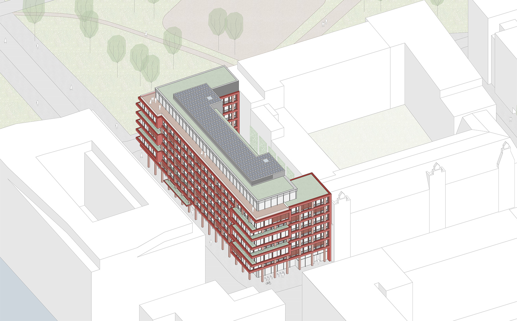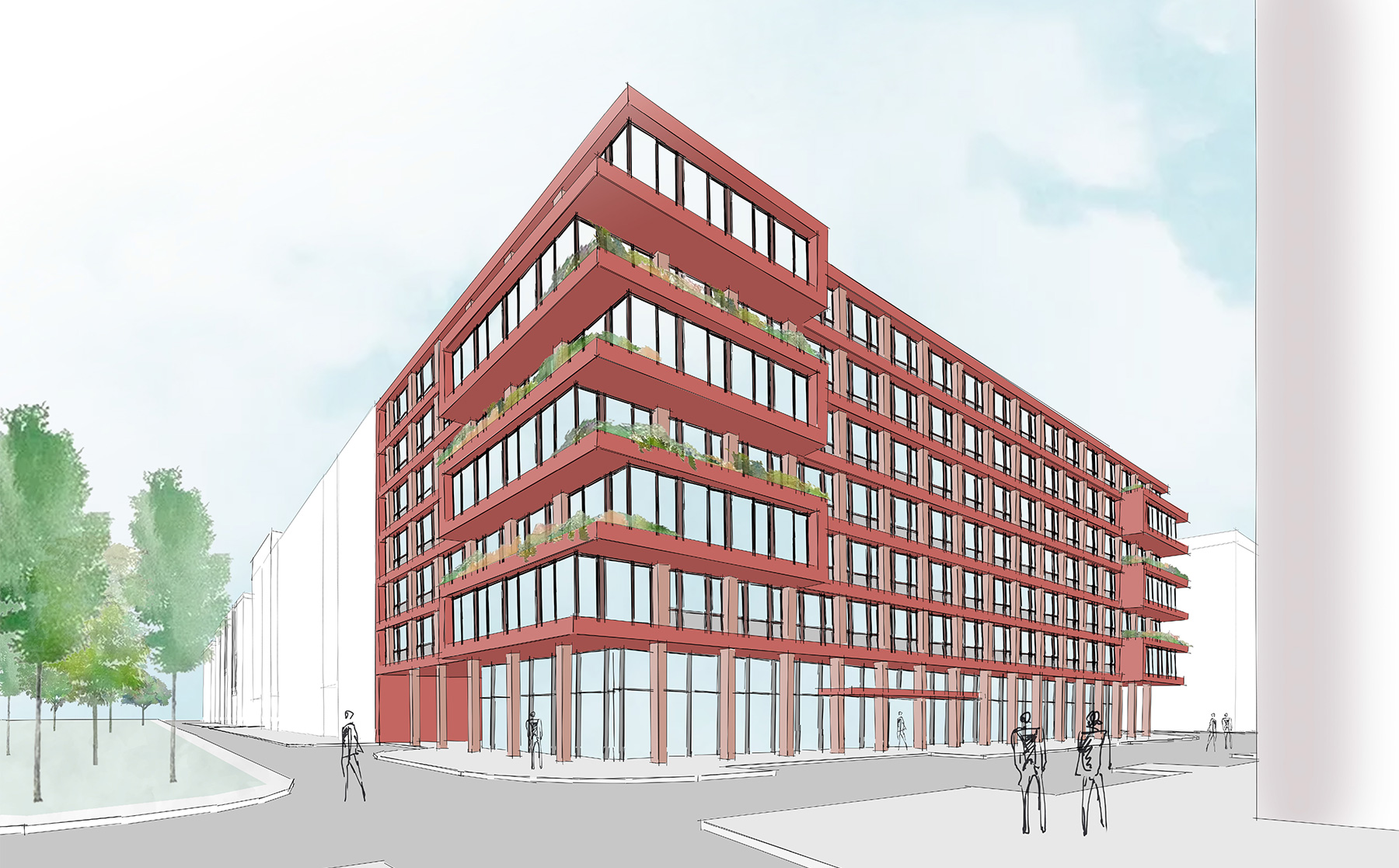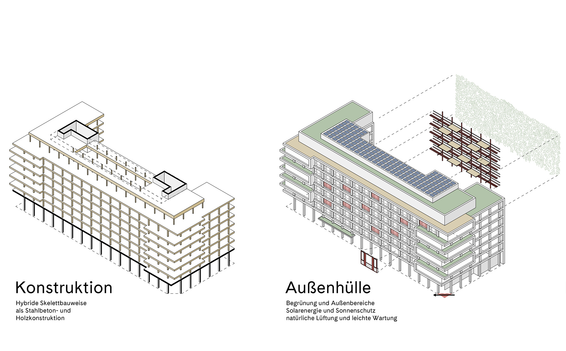 Mit dem Neubau sind anspruchsvolle Zielvorgaben an Energieeffizienz und Nachhaltigkeit verbunden. Somit wird für das Skeletttragwerk eine hybride Konstruktion aus Stahlbeton-Elementen und einer feuerbeständigen Holzkonstruktion vorgesehen. Durch den vorgeschlagenen Innenausbau wird eine räumliche Flexibilität gewahrt. Anstelle von Abhangdecken kommen Akustiksegel zum Einsatz, die gleichzeitig die Funktionen Heizen, Kühlen und Beleuchtung übernehmen.