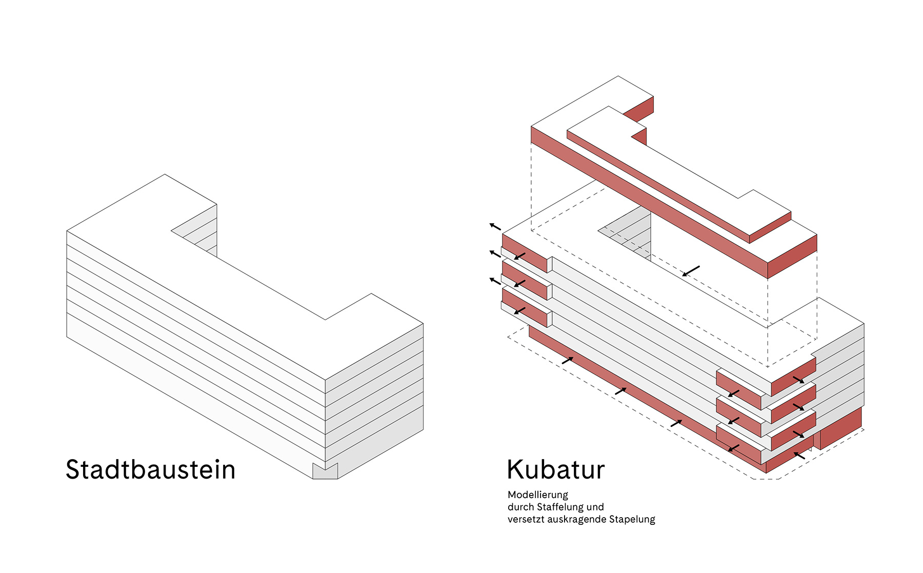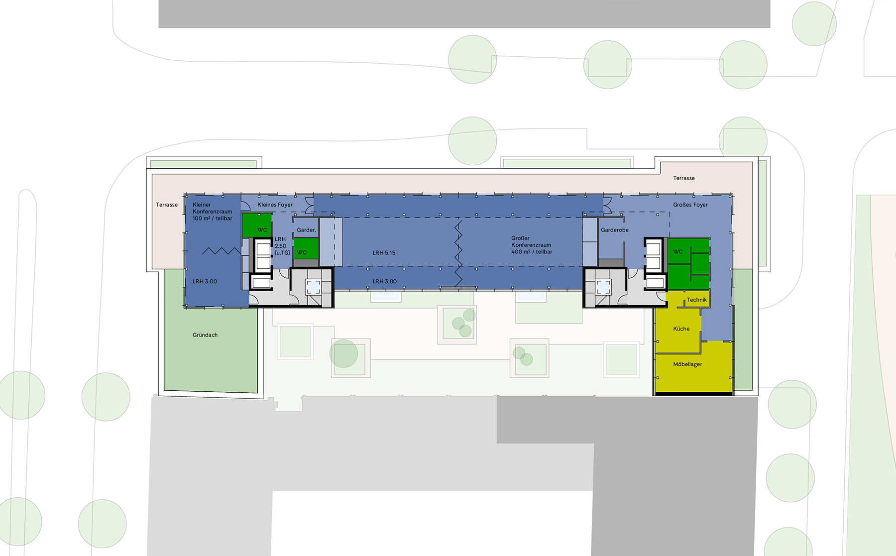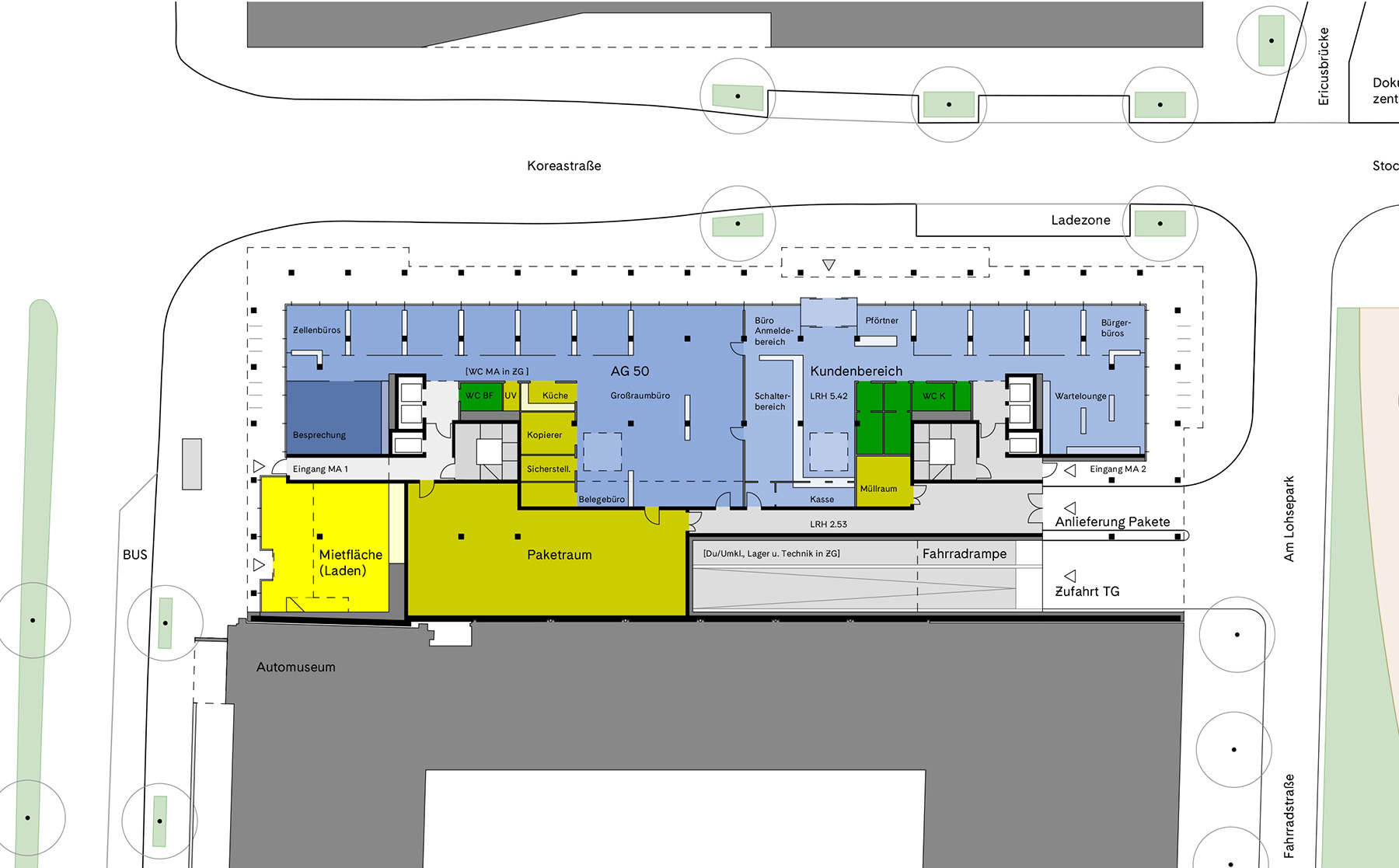 In diesem Entwurf ist für das Erdgeschoss des Neubaus ein öffentlicher Bereich mit Foyer und Paketabholung und ein interner Bereich mit Büroräumen vorgesehen. Im Zwischengeschoss sind Umkleidebereiche der Mitarbeitenden sowie Lager- und Technikflächen untergebracht. In den darüber befindlichen Regelgeschossen erlaubt das geplante Gebäuderaster eine flexible Raumaufteilung, die sich für die gewünschte Büronutzung optimal eignet.