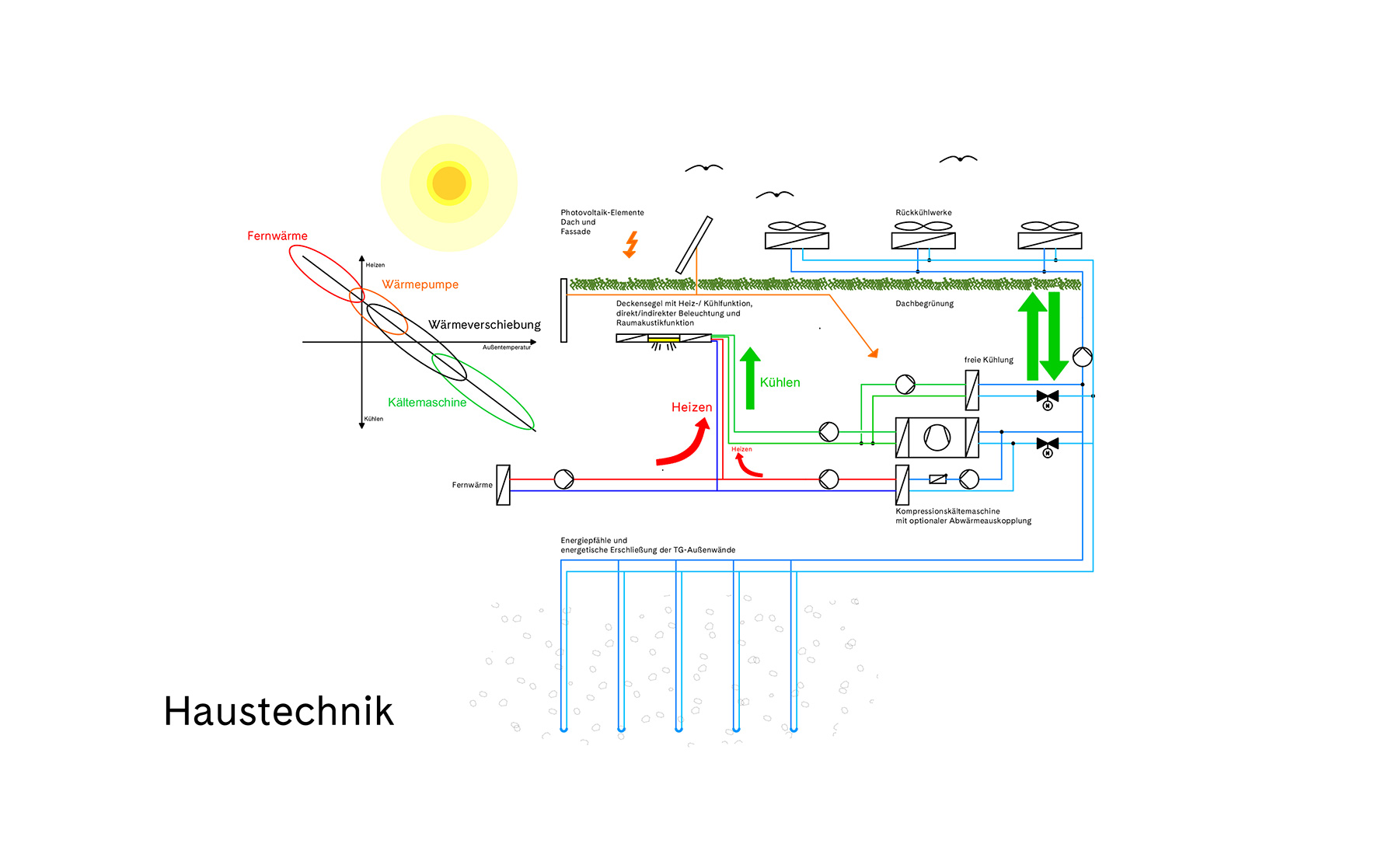 Die Fassade wird hochgedämmt, eine geschlossene „Energiebrüstung“ nimmt ein Photovoltaik-Paneel auf. Eine der Dachflächen ist mit PV-Elementen belegt, die anderen sind intensiv begrünt. Für die Gebäudebelüftung ist im Sinne des Low-tech-Prinzips weitestgehend eine natürliche Belüftung über die Fensterflächen geplant. Nur ausgewählte Bereiche wie die Konferenzräume erhalten eine mechanische Belüftung mit hochwertiger Wärmerückgewinnung und adiabater Abluftbefeuchtung zur Vorkühlung der Zuluft im Sommer.