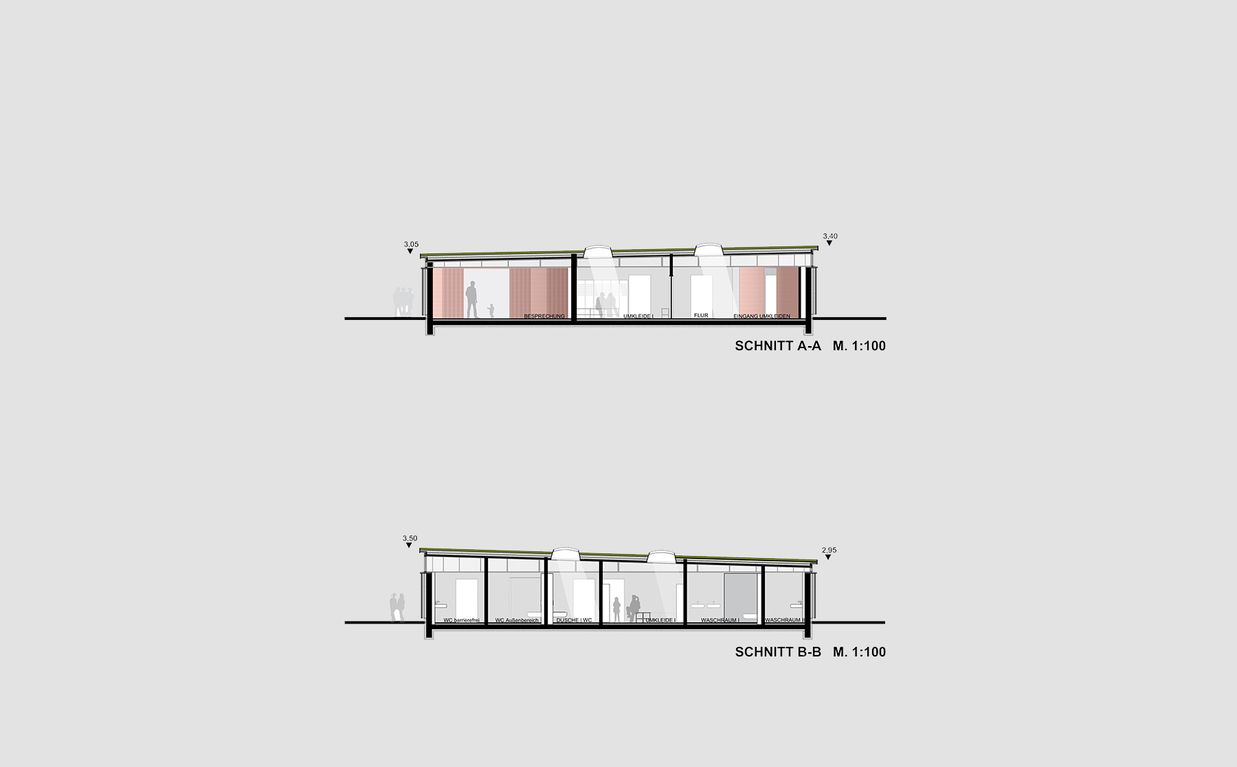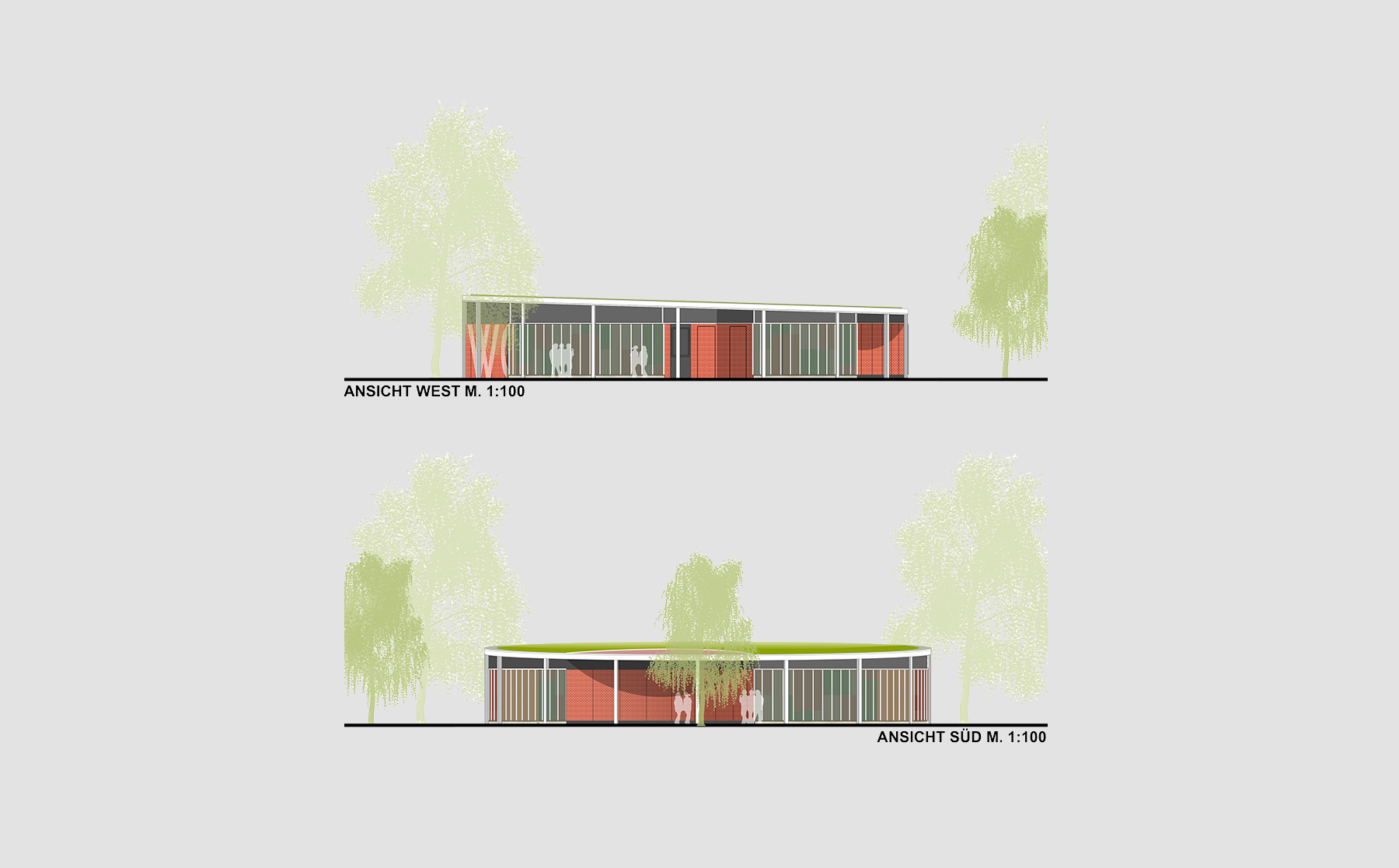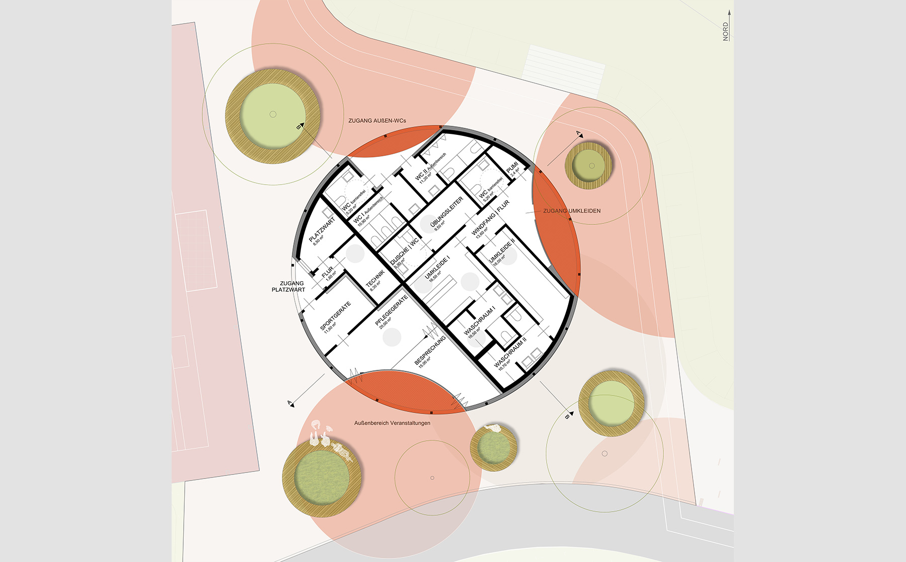 Die gewählte Kreisform des neuen Pavillons schafft dem Gelände einen selbstverständlichen Mittelpunkt in alle Richtungen, der Zylinder einen Baukörper von maximaler Kompaktheit. Der Pavillon ermöglicht die klare Trennung der einzelnen Funktionsbereiche, die schnell aufgefunden werden können und separat von außen zugänglich sind. Die kreisrunden Dacheinschnitte und Belagsflächen sowie die farbliche Akzentuierung der konkaven Fassadenbereiche betonen die überdachten Zugänge.