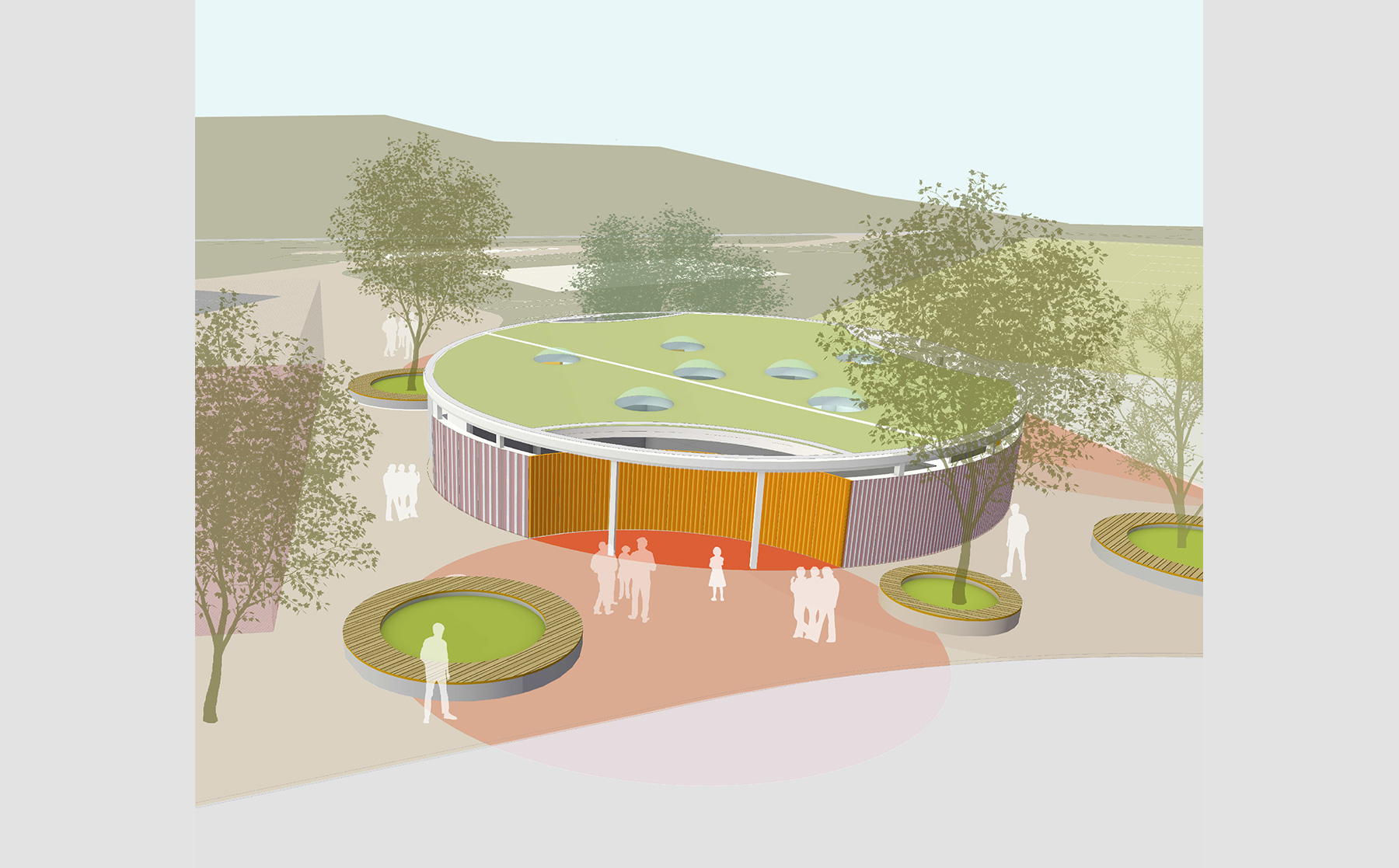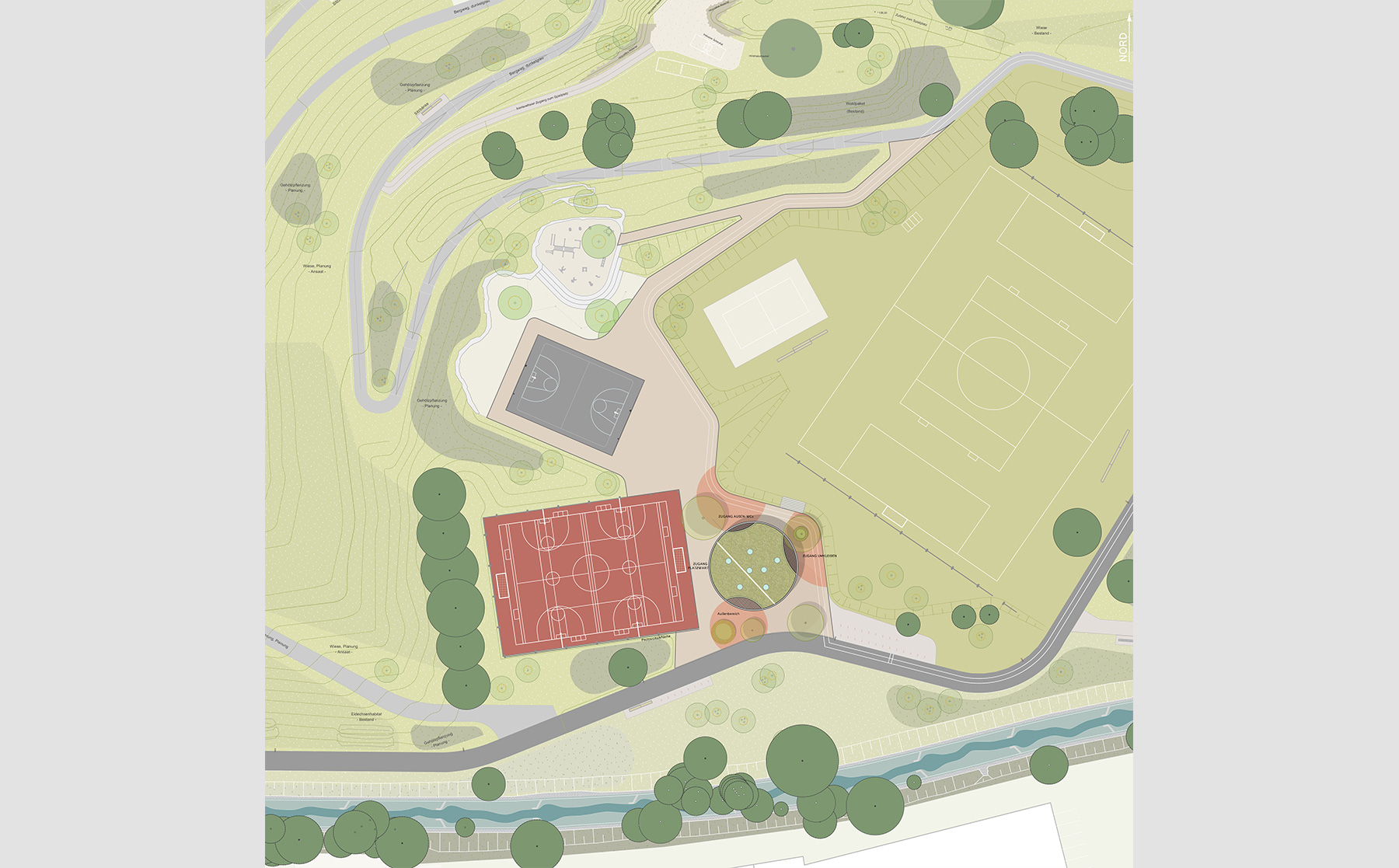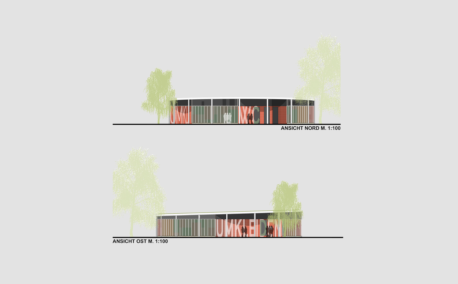 Die gewählte Kreisform des neuen Pavillons schafft dem Gelände einen selbstverständlichen Mittelpunkt in alle Richtungen, der Zylinder einen Baukörper von maximaler Kompaktheit. Der Pavillon ermöglicht die klare Trennung der einzelnen Funktionsbereiche, die schnell aufgefunden werden können und separat von außen zugänglich sind. Die kreisrunden Dacheinschnitte und Belagsflächen sowie die farbliche Akzentuierung der konkaven Fassadenbereiche betonen die überdachten Zugänge.