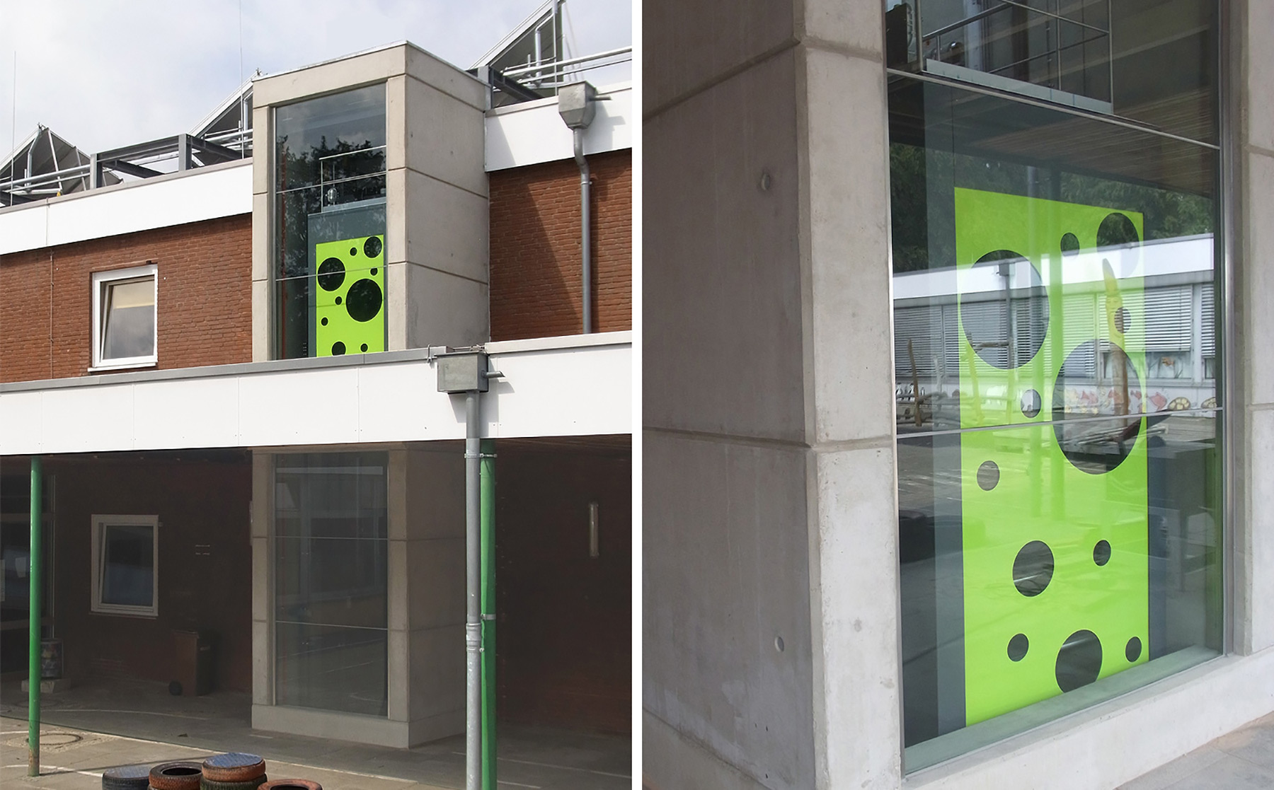 Die grüne Kabinenwand besitzt kreisförmige Klarglasausschnitte, die aus unterschiedlicher Sichthöhe während der Fahrt Ausblicke auf den Schulhof ermöglichen. Der Zugang zum Aufzug erfolgt auf beiden Ebenen über vergrößerte ehemalige Flurfenster.