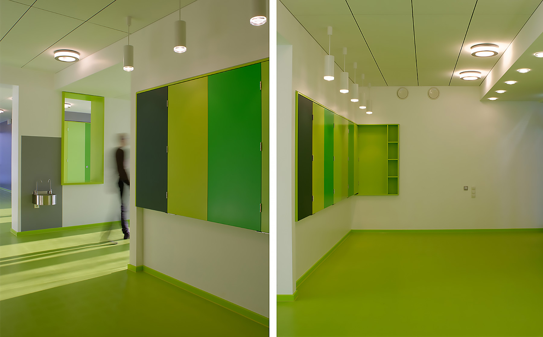 Trotz begrenztem Platzangebot und engem Budgetrahmen ist durch optimale Raumausnutzung, unterschiedliche Durch- und Ausblicke und die intensiv-grüne Farbgestaltung von Bodenbelag und Faltelementen ein spannungsreiches und lebendiges Raumgefüge entstanden.