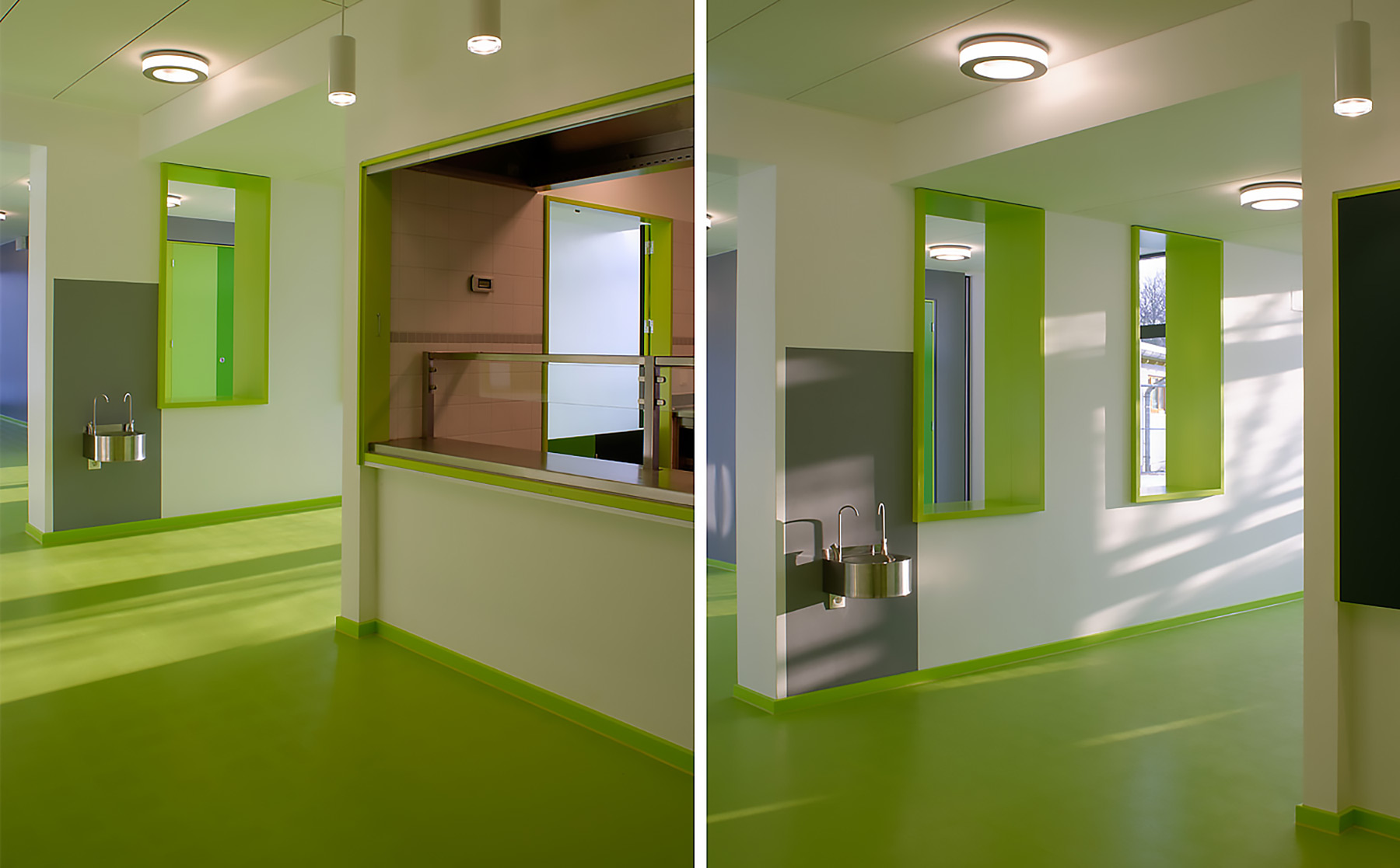 Die im Bestand zur Verfügung stehenden Flächen wurden durch einen Anbau in Holzbauweise erweitert. Der in zwei kubische Baukörper gegliederte Neubau ist als Gelenk zwischen Sporthalle und Schulgebäude platziert.
