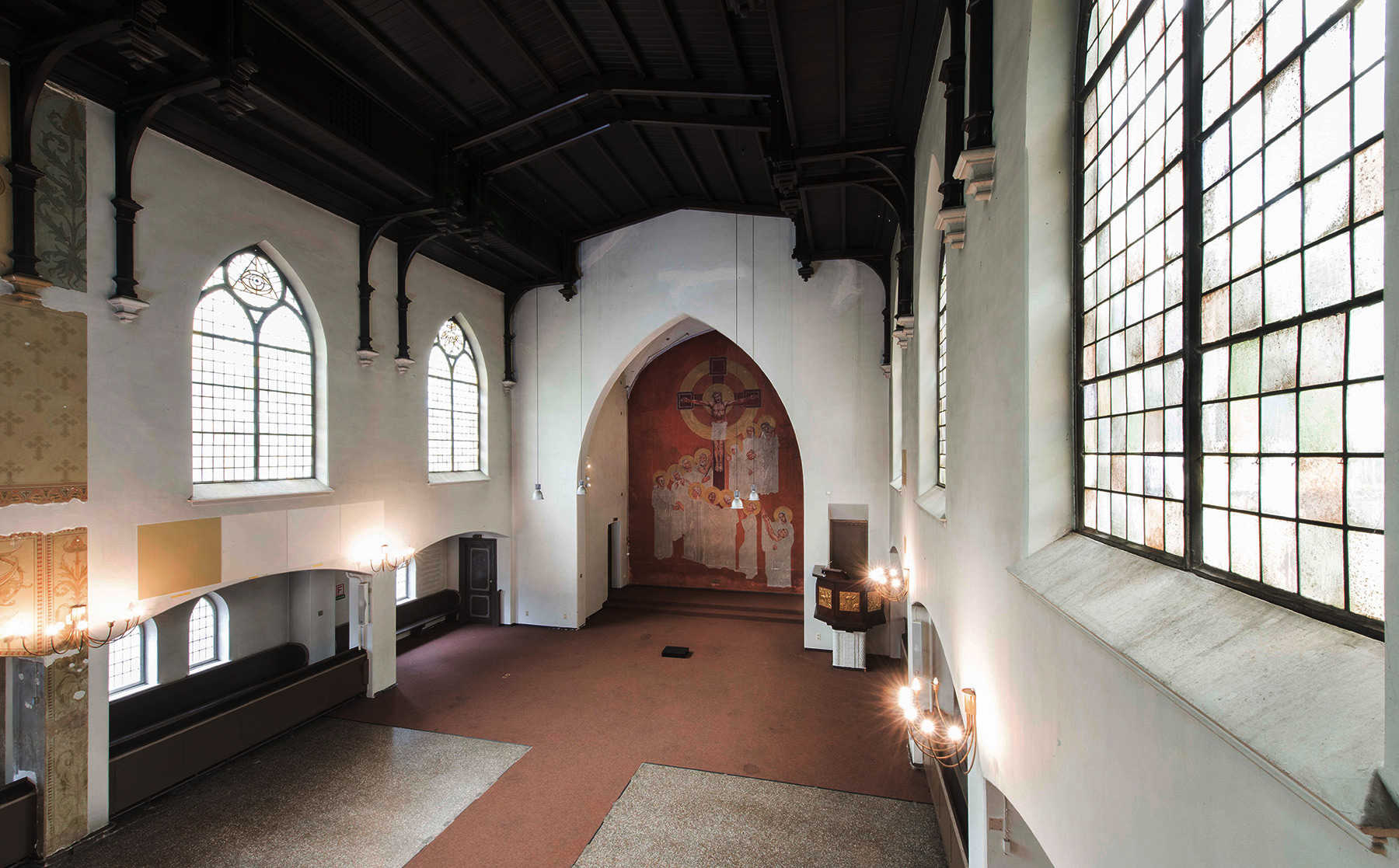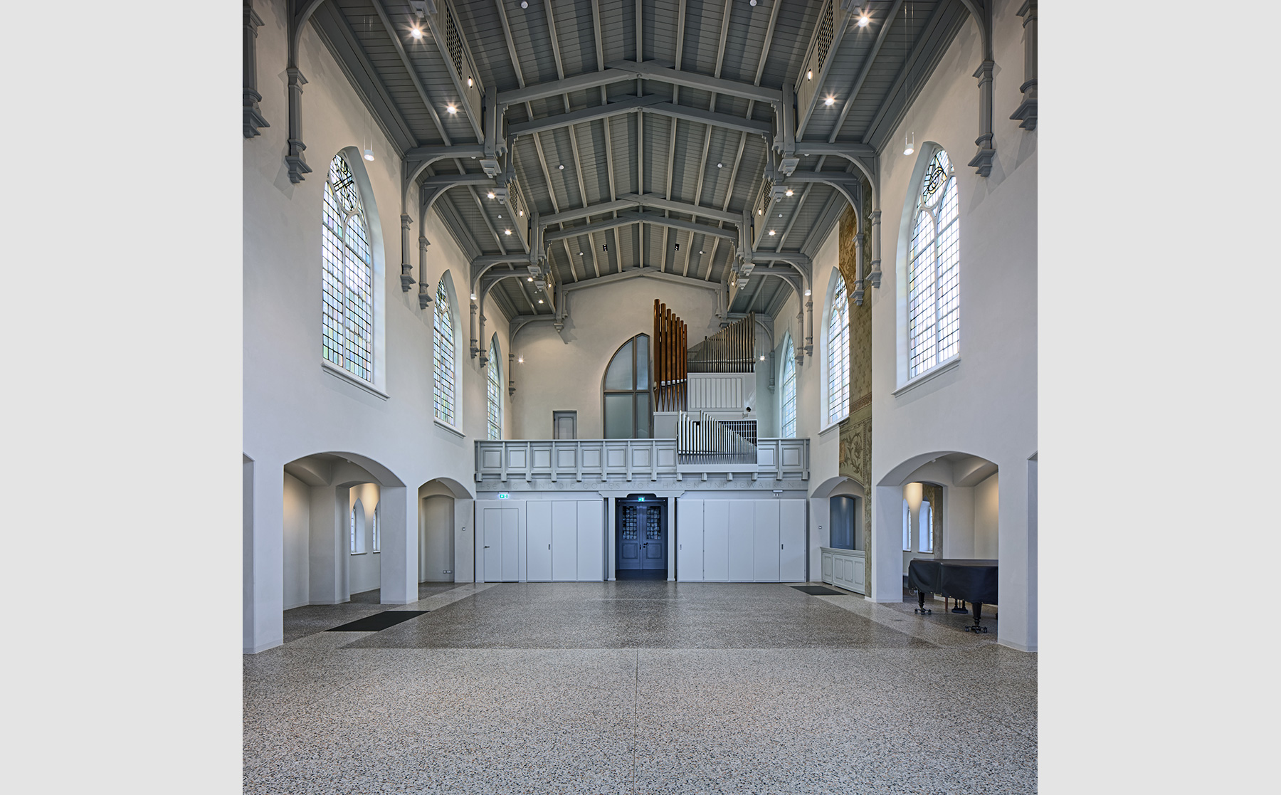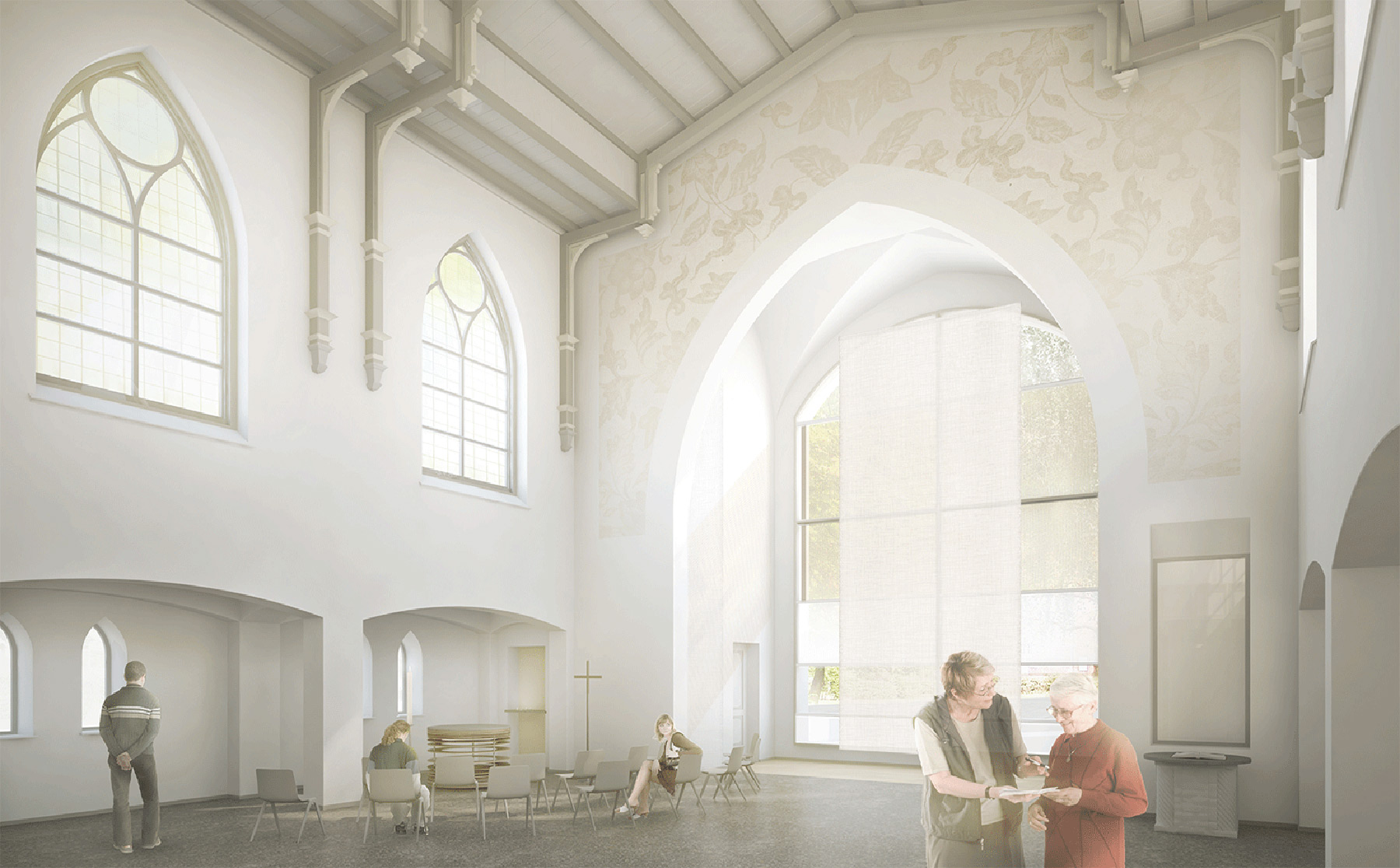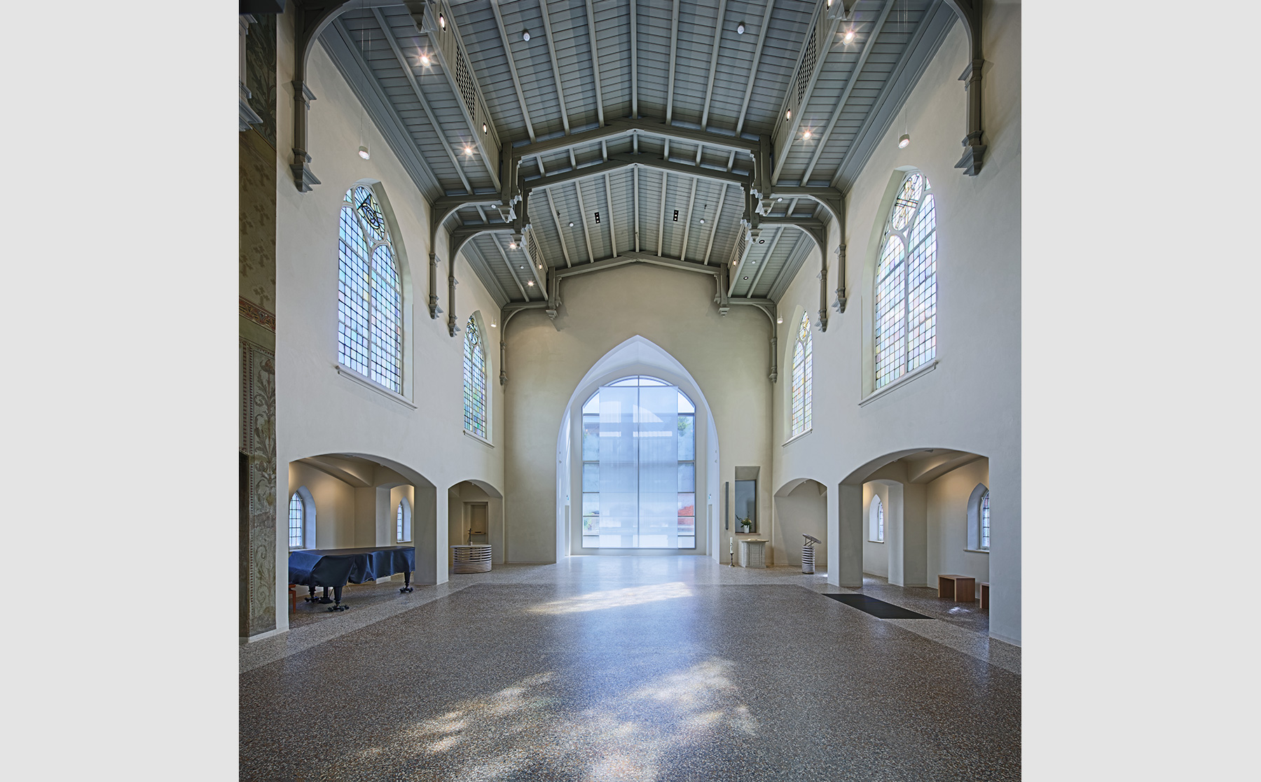 Der Raum unter der Empore erhielt Einbauten für die Nebenräume – Küche, Seelsorgeraum Garderobe, Stuhllager und barrierefreie WC-Anlage –, der Hauptraum mit den Nischen der Seitenschiffe wurde so auf nahezu quadratischem Grundriss zentriert.