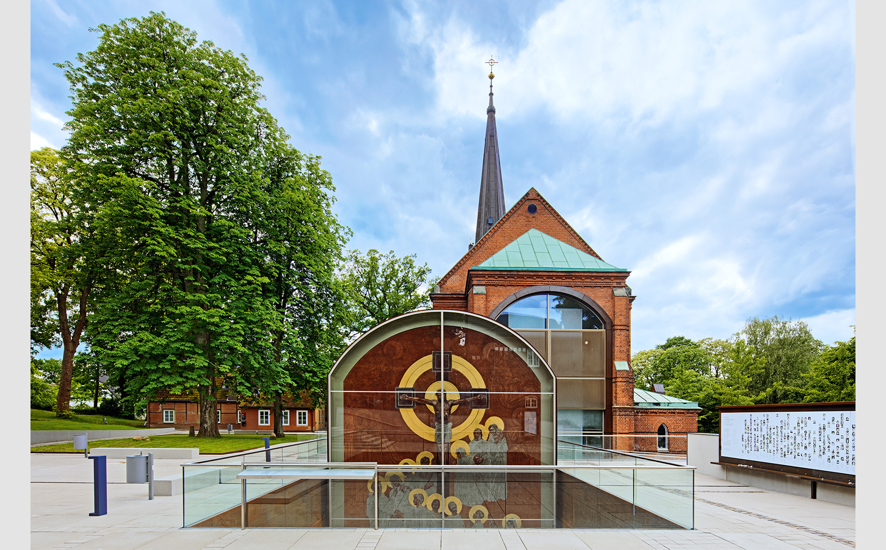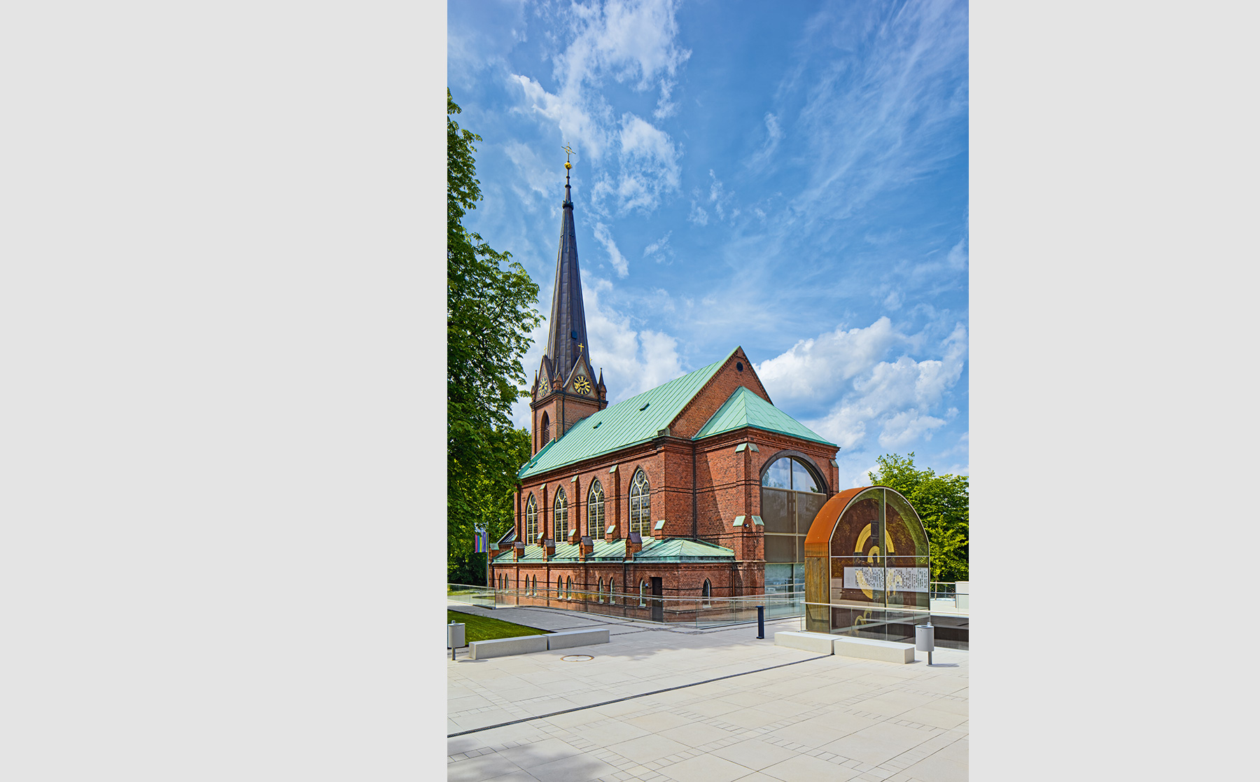 Die Profilteilung der neuen, mehrschichtigen gläsernen Chorwand greift die aufsteigende Schichtung der Zierstreifen und Gesimse in der alten Backsteinfassade auf und deutet durch die unterschiedliche Profiltiefe ein Kreuz an. Die Glasfassadenfelder sind handwerklich in unterschiedlicher Intensität mattiert: über und unter einem Klarglas-Sichtstreifen in Augenhöhe transluzent-opak, nach oben hin transparenter werdend. Die Wolken der Mattierung sind ein biblisches Symbol der verhüllten Gegenwart Gottes und stehen für die Bewegtheit des Himmels.