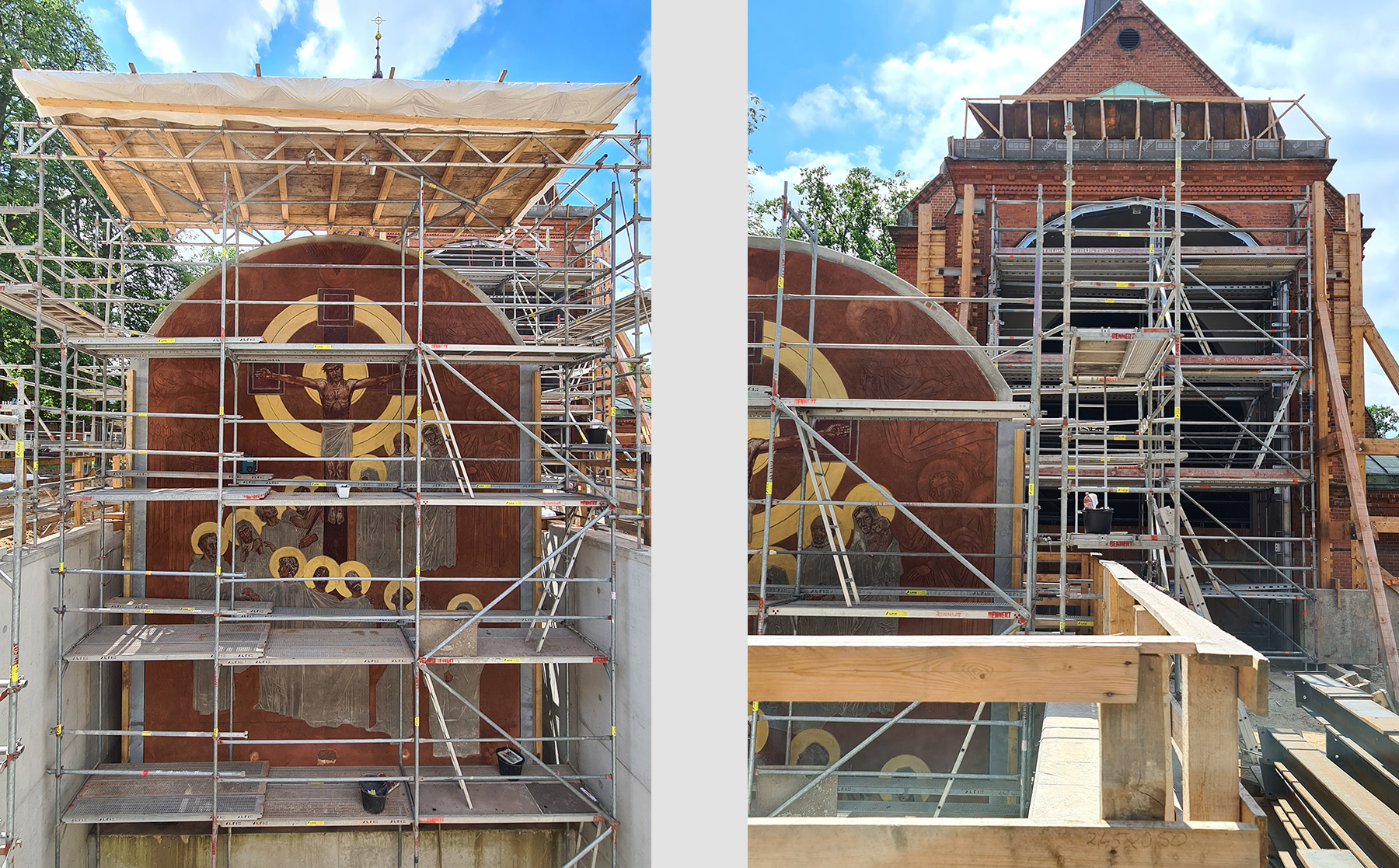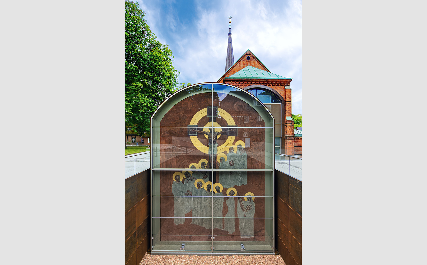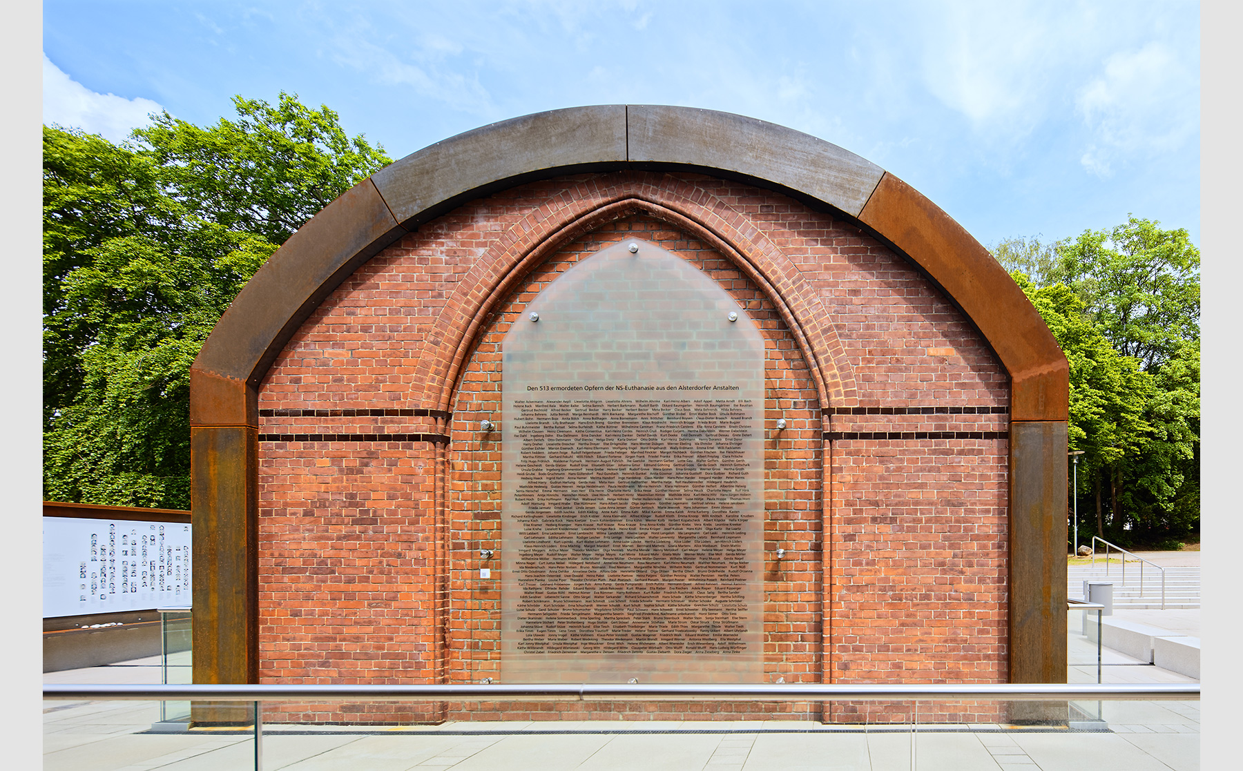 Um den Kirchenraum wieder zum östlichen Tageslicht auszurichten und von der Last des Bildes zu befreien, dieses aber gleichzeitig als ein Dokument der Täterkunst aus dem Spannungsfeld Kirche und Nationalsozialismus zu erhalten, wurde es in den Kontext eines Lern- und Gedenkortes in den Außenraum transloziert. Im Ganzen mit der bauzeitlichen Chorwand versetzt, gedreht und auf einer tieferen Ebene positioniert bleibt der unmittelbare Bezug zum Kirchengebäude weiterhin bestehen. Auf der Rückseite der sichtbar belassenen Backsteinwand – der Kirche zugewandt – sind die Namen der Alsterdorfer Opfer der „Euthanasie“ zu lesen: zwischen 1940 und 1943 wurden 630 Bewohner und Bewohnerinnen der Alsterdorfer Anstalten in nationalsozialistische Tötungsanstalten deportiert, 513 von ihnen nachweislich ermordet.