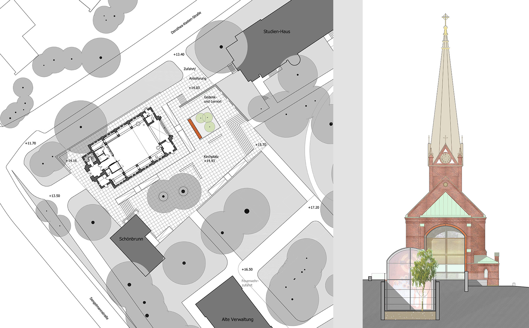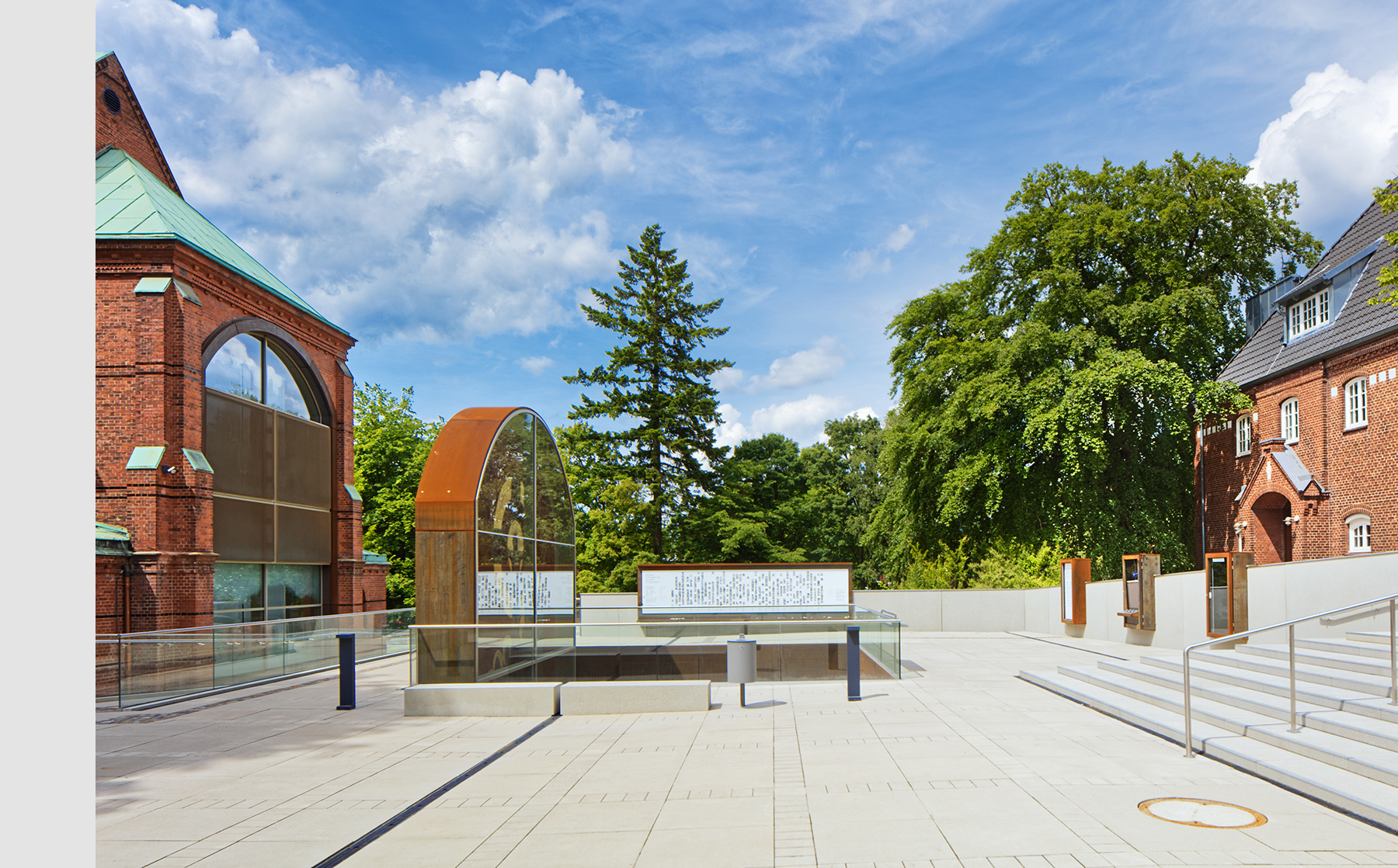 Der Gedenkort ist Teil des neu gestalteten Kirchplatzes, der in drei Niveaus terrassiert ist und so die unterschiedlichen Höhen des vorhandenen Geländes anbindet und zwischen der tief gelegenen Sengelmannstraße und dem höher gelegenen Stiftungsgelände vermittelt.