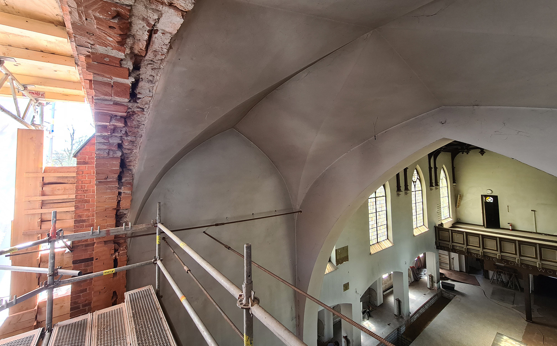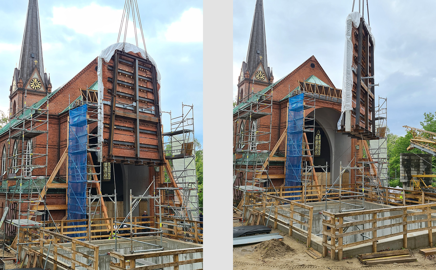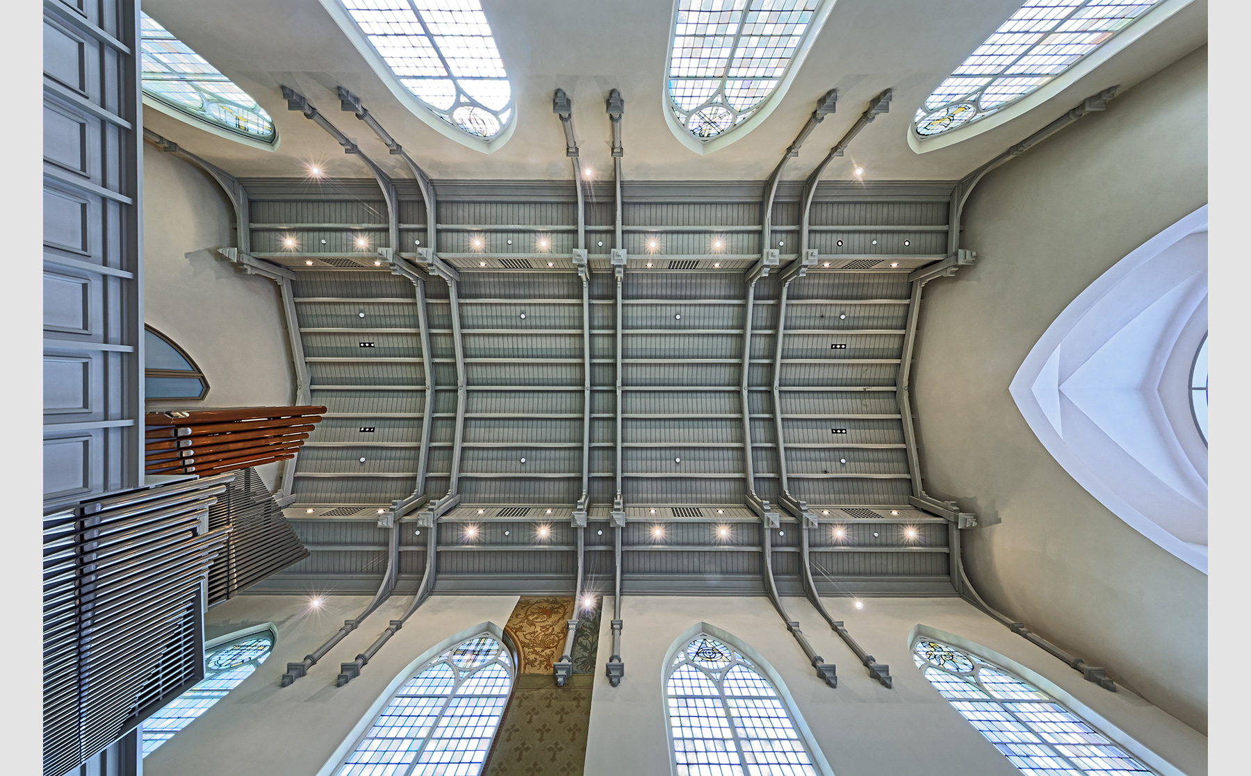 Die Translozierung der Chorwand war technisch höchst anspruchsvoll und stellte sicherlich einen radikalen Eingriff in das Baudenkmal St. Nicolaus dar. Im langen und intensiven denkmalrechtlichen Abstimmungsprozess haben wir jedoch deutlich machen können, dass die zerstörerische Überformung des Denkmals bereits 1938 stattgefunden hat. Das Versetzen des hermetisch-massiven Raumabschlusses, der erst durch die Zerstörung und das Schließen des ursprünglichen, großen Chorfensters entstanden ist, baute lediglich diese Verwundung zurück undrevitalisiert und verstärkt den bauzeitlich intendierten Raumeindruck. Es war eine große Chance, den nach Osten ausgerichteten Abschluss des Chorraumes jetzt wieder aus Glas realisieren und so lichtvoll öffnen zu können. Selbstverständlich wurden die bauzeitlichen bleiverglasten Obergaden- und Seitenschifffenster an der Nord- und Südwand erhalten und umfangreich saniert und gereinigt.