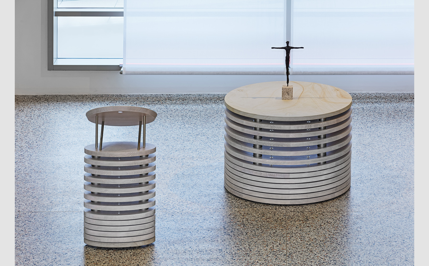 Im Chor wurden die vorhandenen Podeststufen ausgebaut - niveaugleich und ohne feste Einbauten symbolisiert der leere Raum der Apsis die Gegenwart Gottes. Lediglich der hellere Boden markiert hier eine Schwelle zum lichten Raum der Auferstehung. Die ebenfalls von uns entworfenen Prinzipalstücke Altar und Ambo sind nicht fest installiert, sondern können je nach Art der liturgischen Feier oder Veranstaltung mobil im Raum angeordnet werden. Sie sind zudem höhenverstellbar und von Rollstuhlnutzer*innen unterfahrbar. Die Kanzel von 1938 wurde zurückgebaut, der bauzeitliche Backsteinsockel ist jedoch erhalten geblieben. Eine kreisrunde Sandsteinplatte dient als Aufbewahrungsort für die aufgeschlagene Bibel und lädt zum „Lesen auf Augenhöhe“ ein.