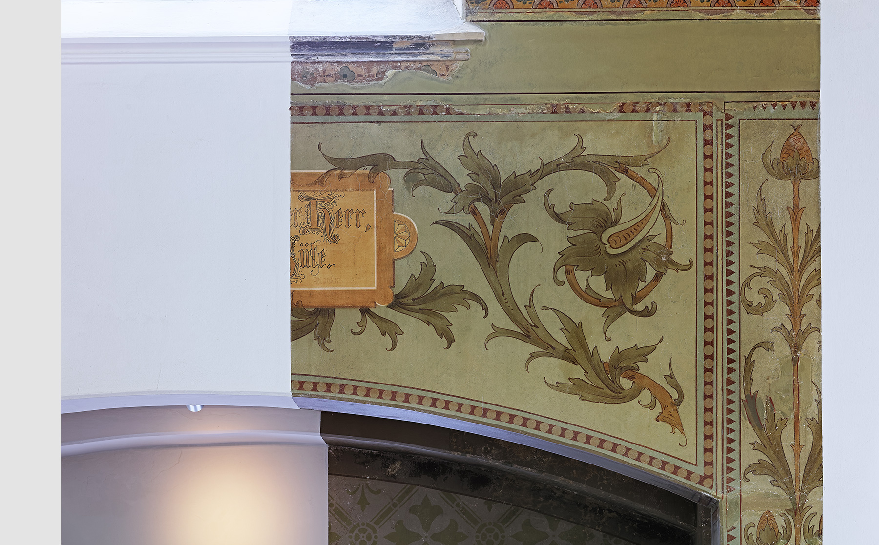 Unter der neuen hell-ockerfarbenen Sichtfassung der Wandflächen sind zwei polychrom gestaltete Fassungen aus der Bauzeit bzw. aus der frühen Nutzungszeit erhalten. In einem raumhohen Sichtfeld wurde diese florale und geometrische Schablonenmalerei freigelegt und als Zeitschicht erfahrbar gemacht. Wichtig für die helle und freundliche Gesamtwirkung des Raumes ist die farbliche Neufassung der Holzdecke und der Empore. Der ebenfalls bauzeitliche Terrazzoboden konnte auf einer großen Fläche erhalten und aufgearbeitet werden, für die neuen Flächen auf Fußbodenheizung wurden die gleichen Gesteinskörnungen verwendet, jedoch durch ein hellgraues Bindemittel vom alten Belag unterschieden.