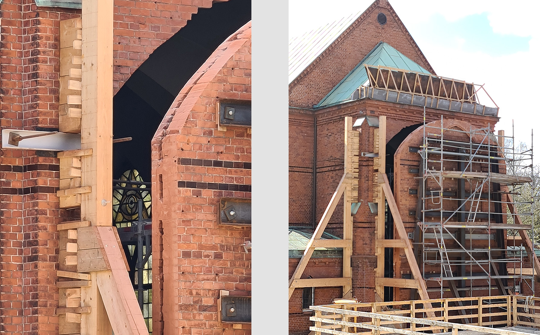 Gefasst ist die Chorwand durch ein Gewände aus rostroten Cortenstahl-Platten, die die tragende und aussteifende Stahlprofil-Konstruktion umhüllen und sich farblich der Backsteinwand angleichen.