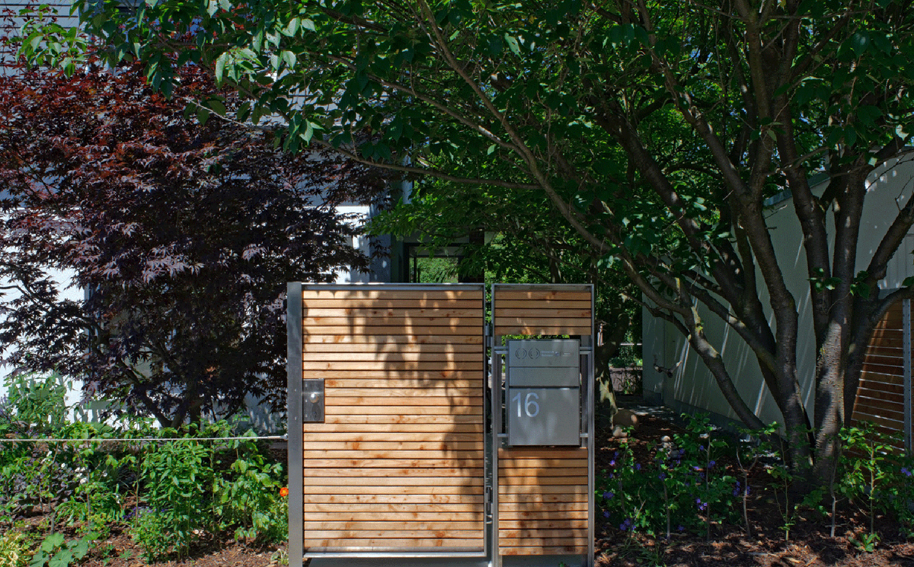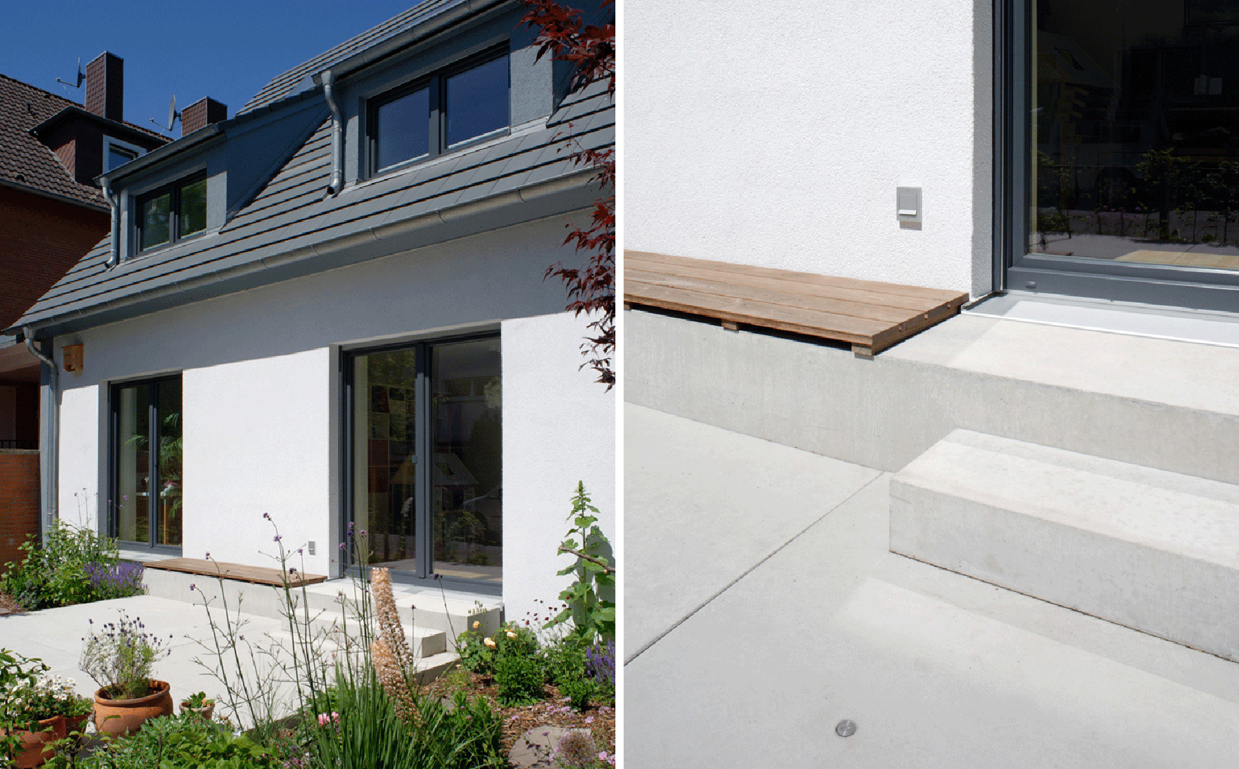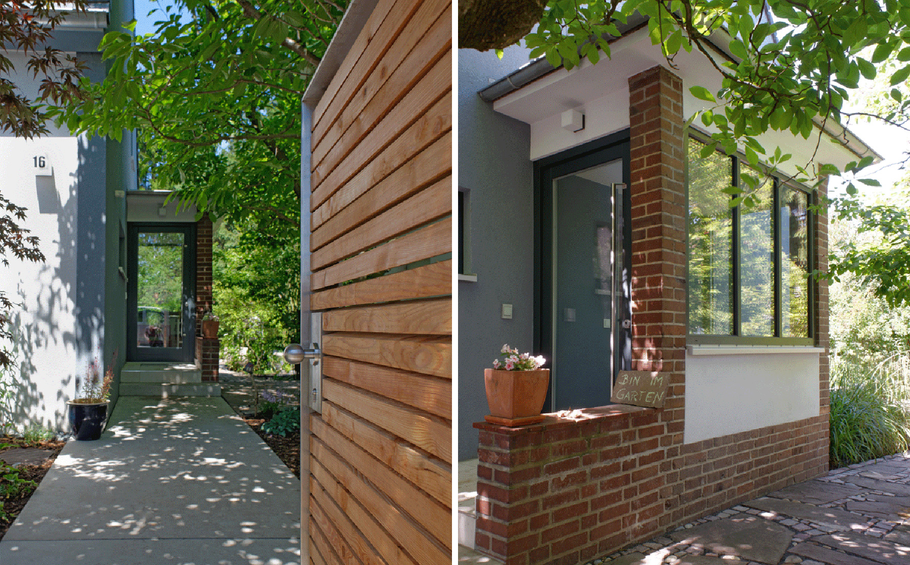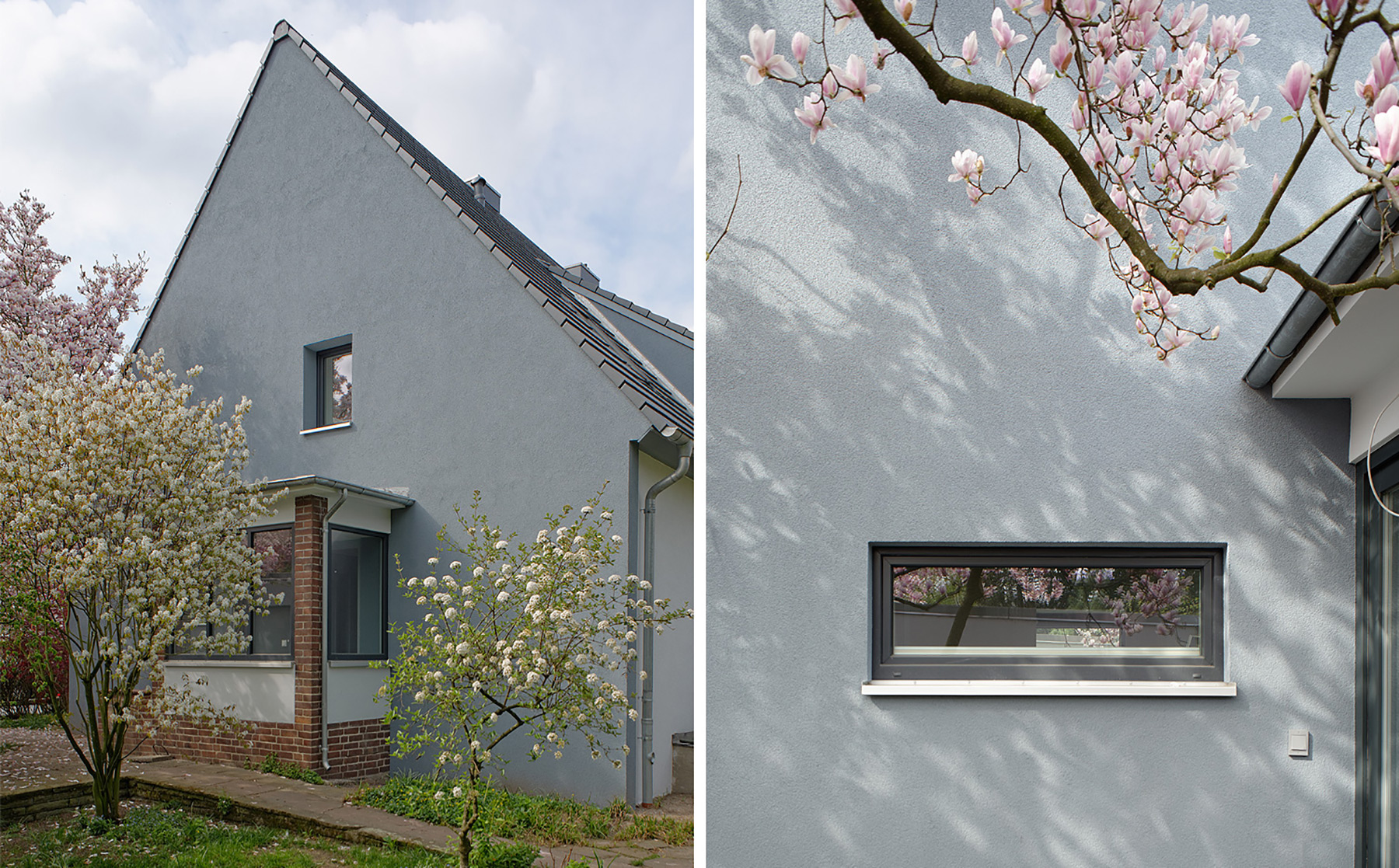 Die dunkel verputzten Giebelwände fassen das Volumen des schlichten Steildachhauses mit seinen drei straßenseitigen Gauben; der alte Sichtmauerwerk-Windfang wurde sorgfältig saniert und als Eingang erhalten.