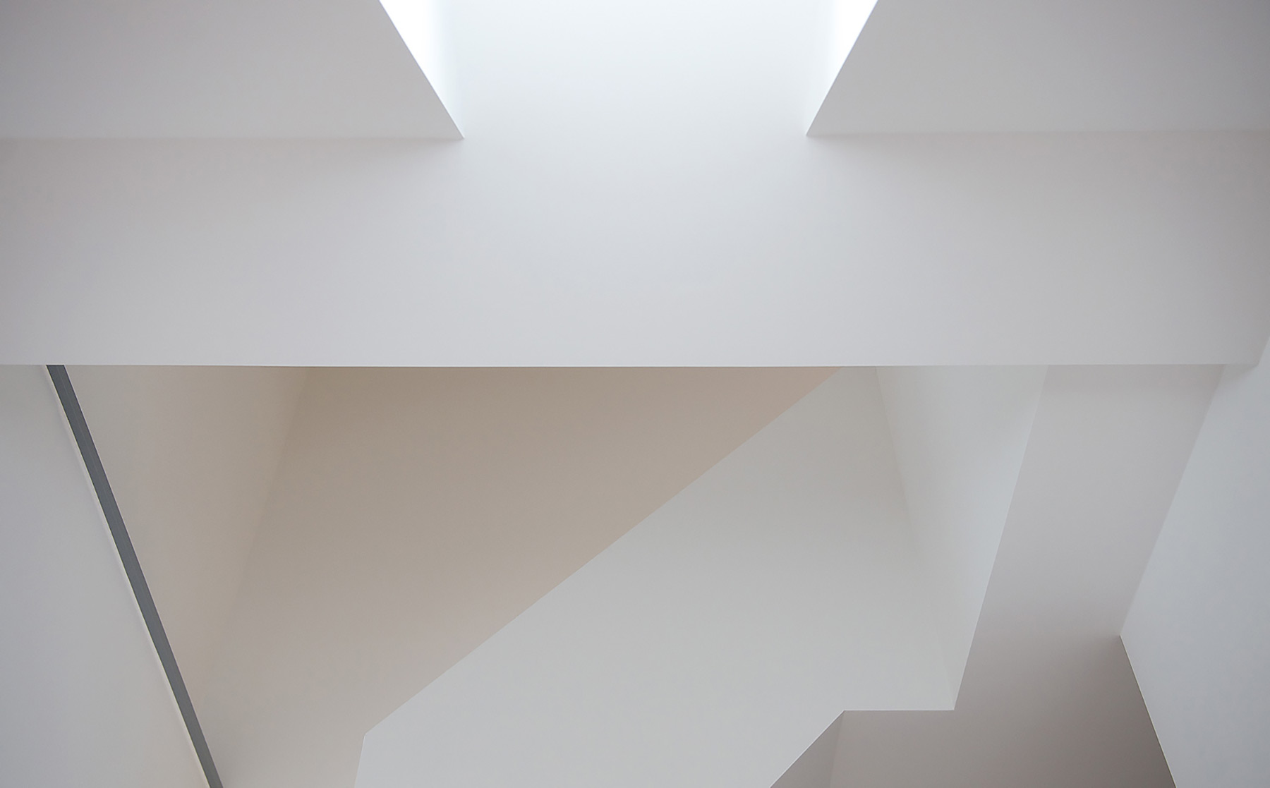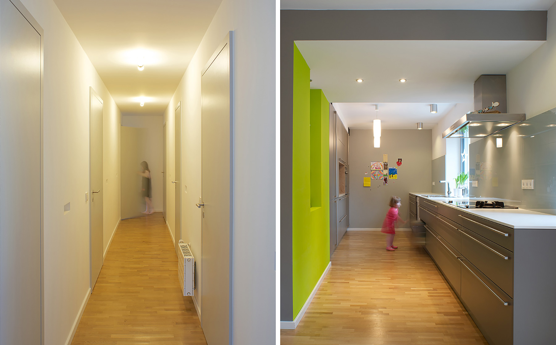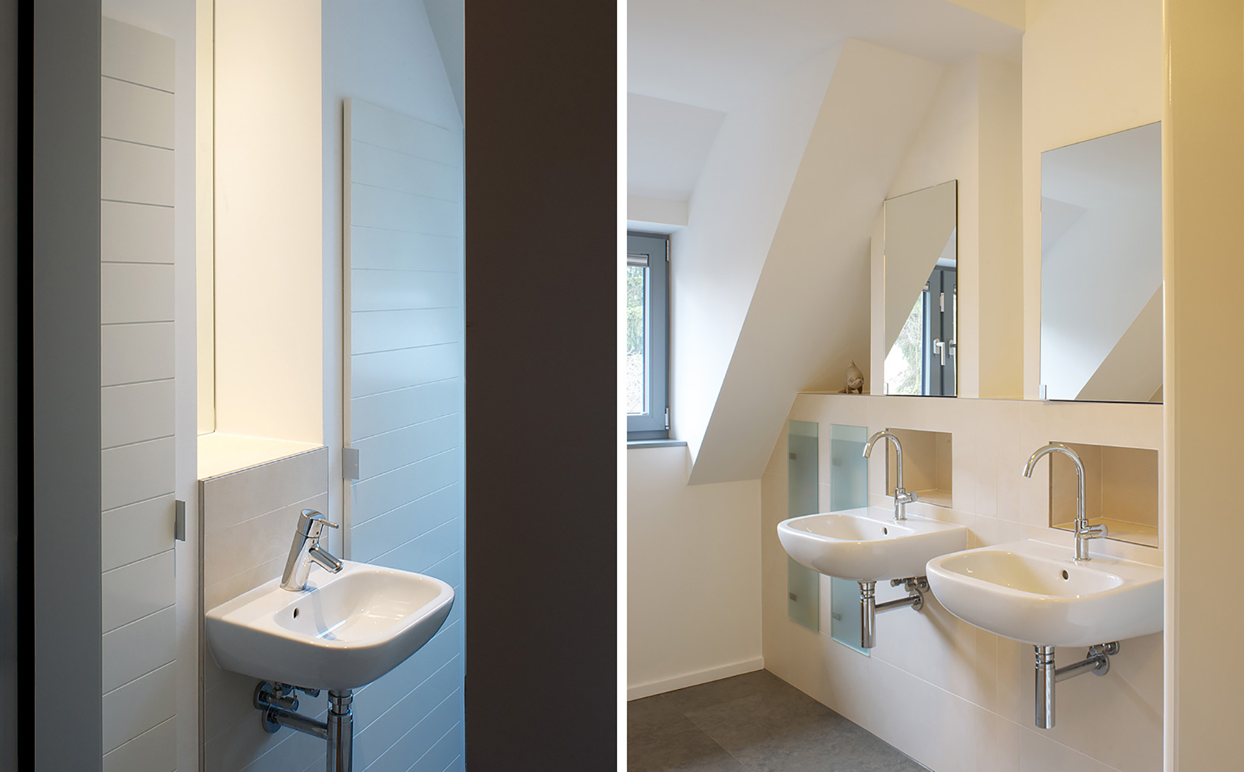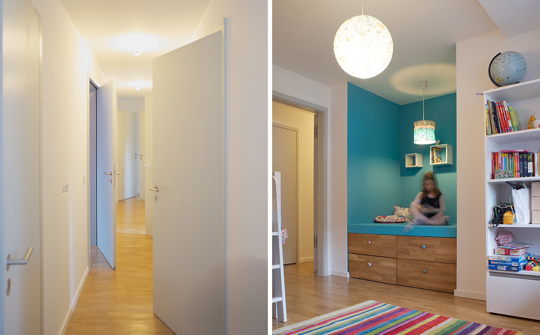 Im Dachgeschoss wurde die vorgefundene Raumstruktur mit entlang des Flures aneinandergereihten Individualräumen weitgehend beibehalten. Eine Besonderheit sind die in den Flur aufschlagenden Türen, die sich – 180° geöffnet – bündig in die Wände einfügen lassen.