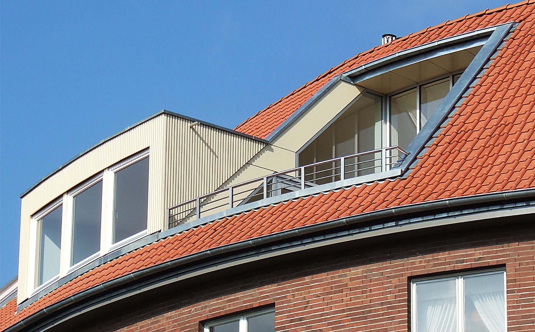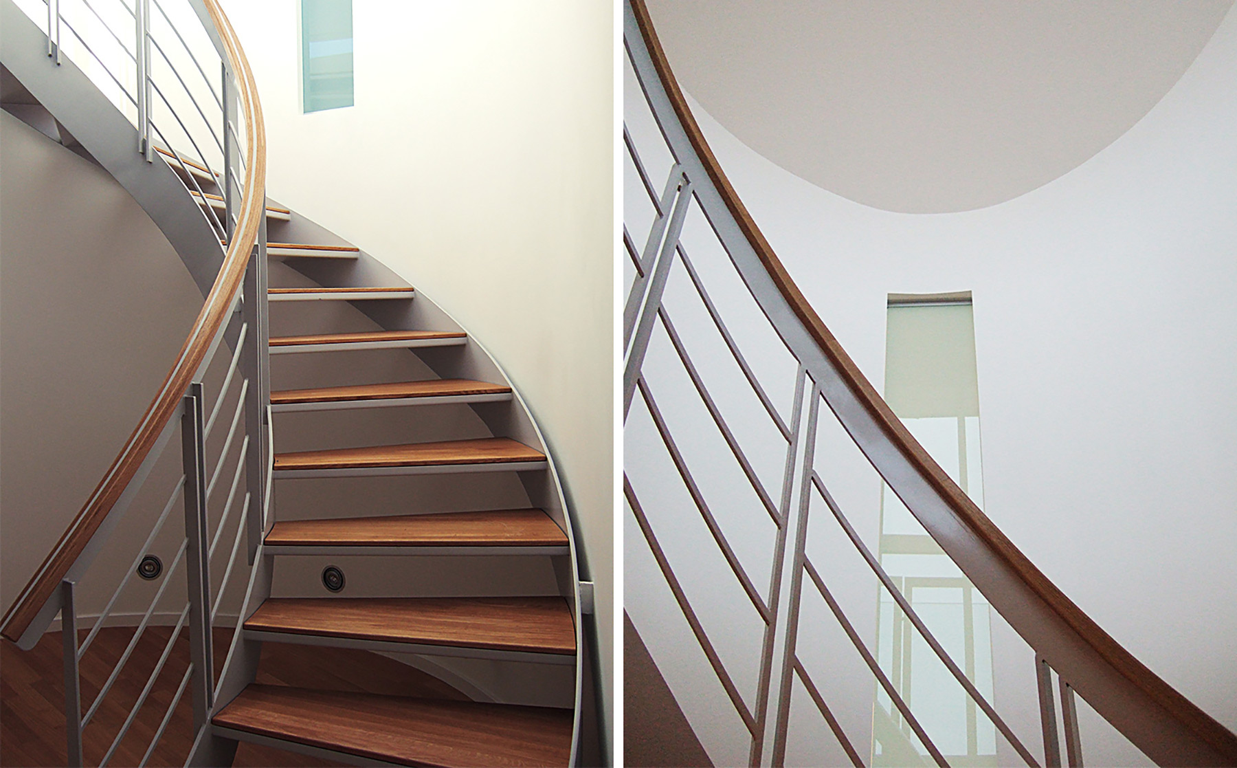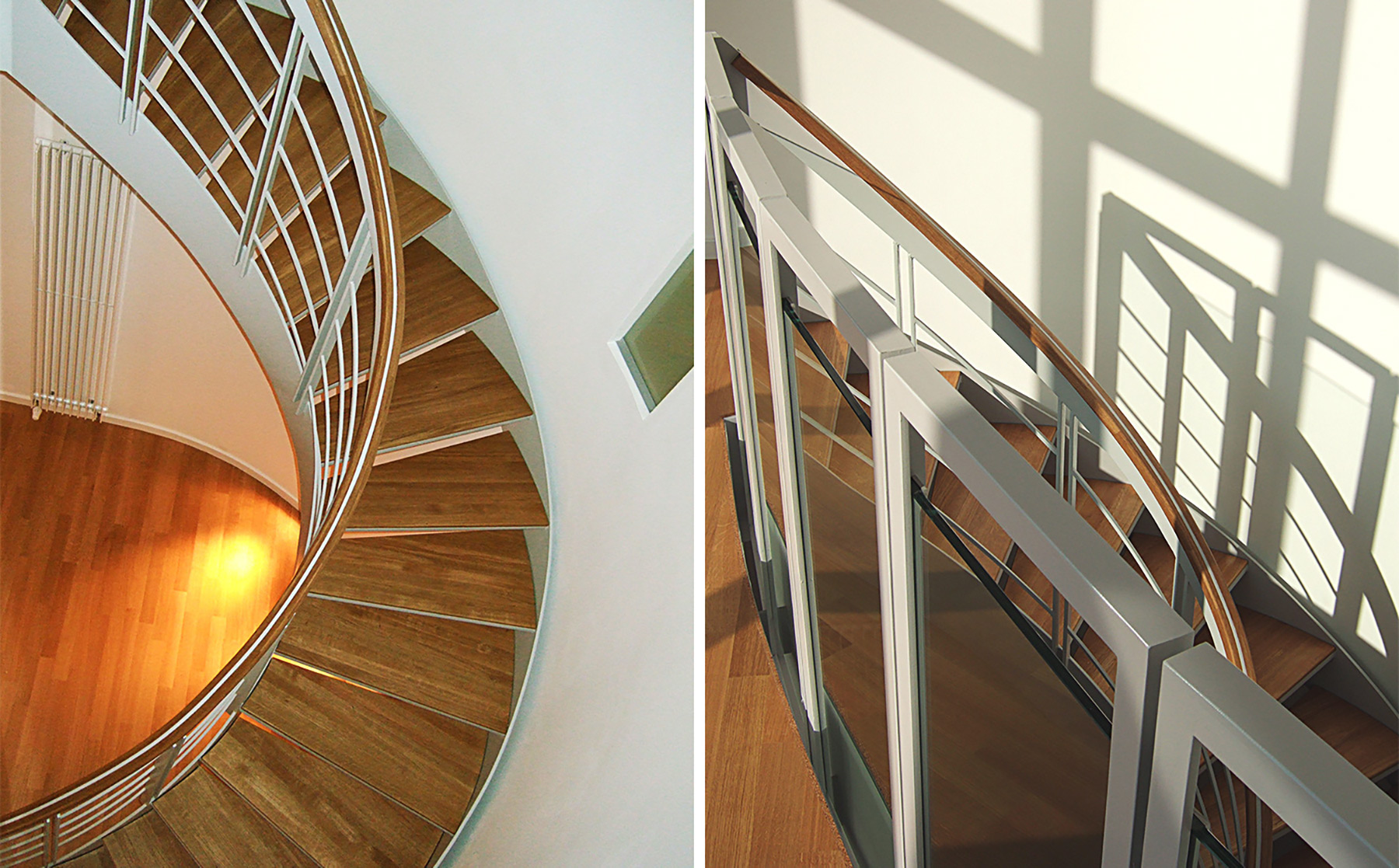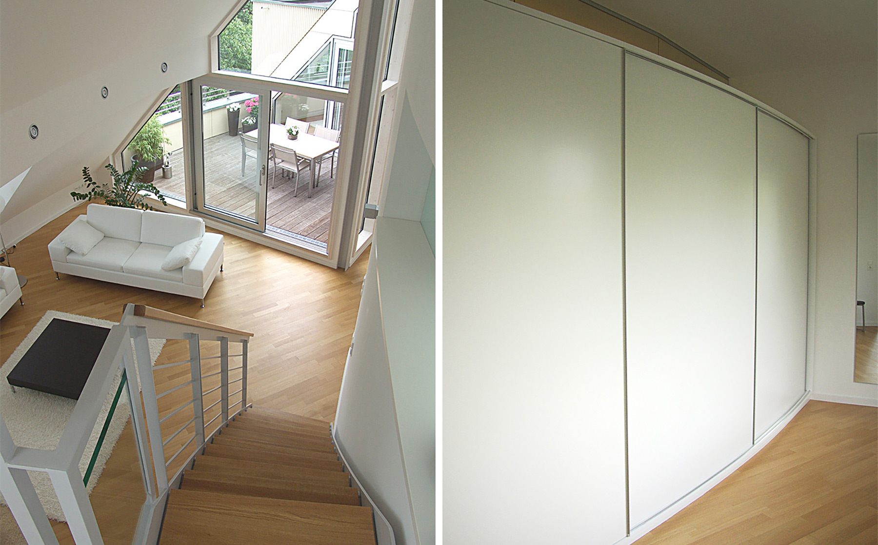 In einem "runden Eckhaus" aus den 1920er Jahren ist in Dach- und drittem Obergeschoss eine hochwertige, ca. 250 m² große Maisonettewohnung entstanden. Raumprägend ist die vorgefundene Grundrissgeometrie konzentrischer Kreisbögen, die sich in der Dachhaut zu Kegel- bzw. Trichterflächen ausformt. Eine freitragende, elliptisch gewendelte Stahltreppe verbindet die beiden Ebenen, zwei eingeschnittene Dachloggien und drei Flachdachgauben ergänzen und gliedern das spannungsreiche, großzügige Raumvolumen.
