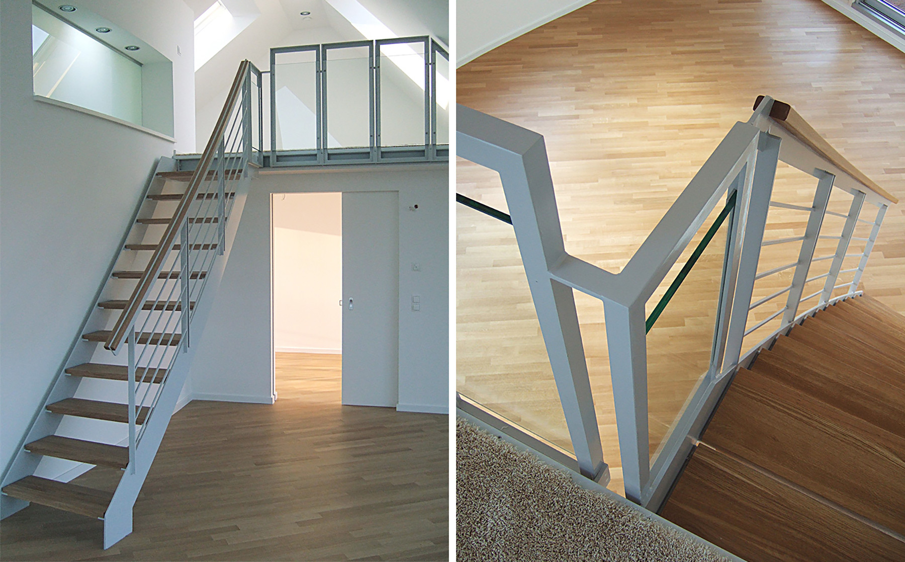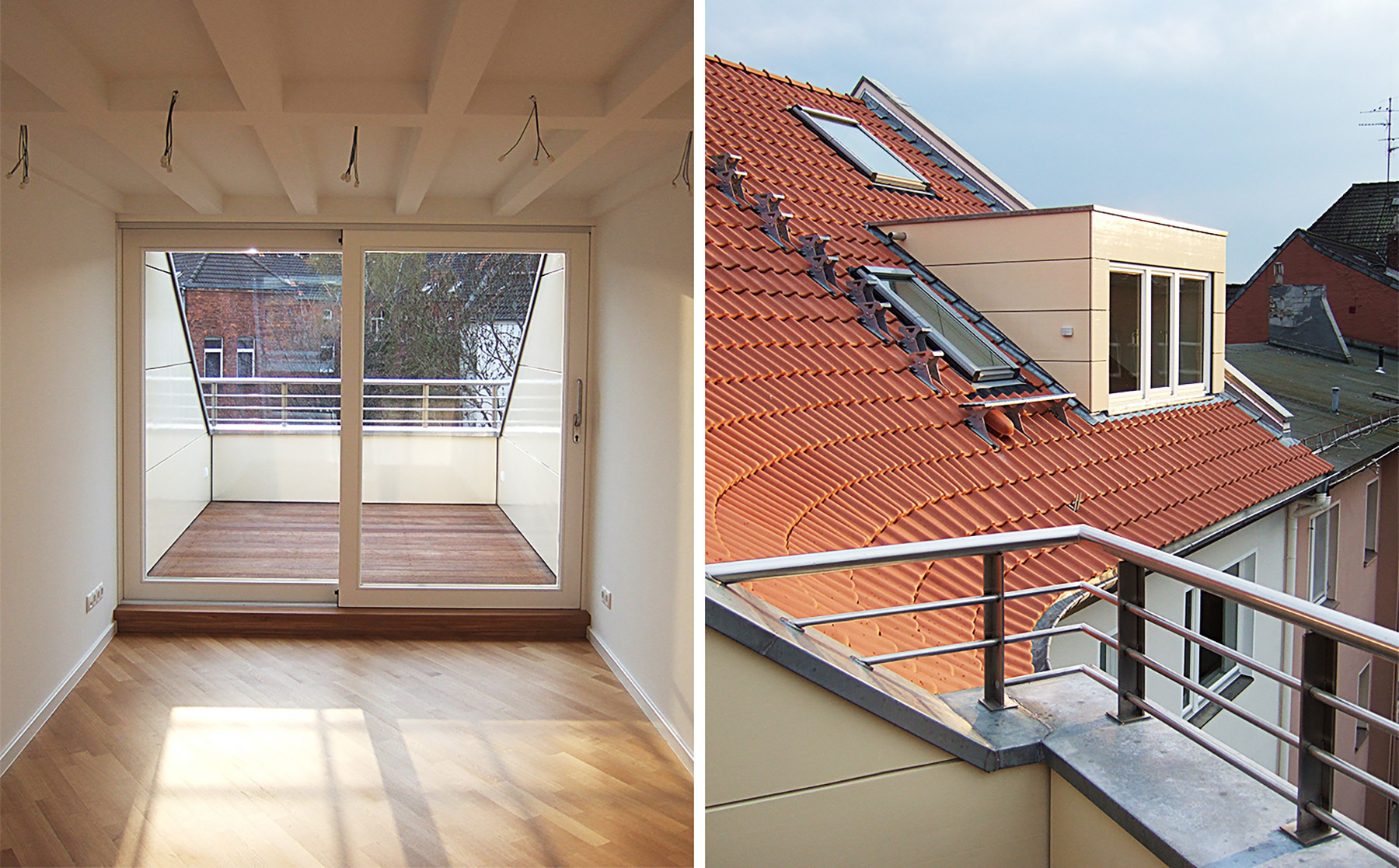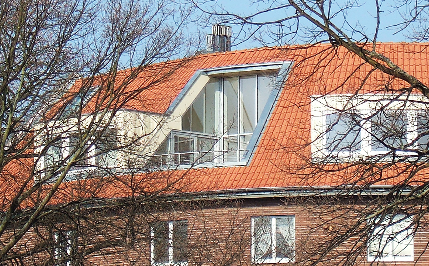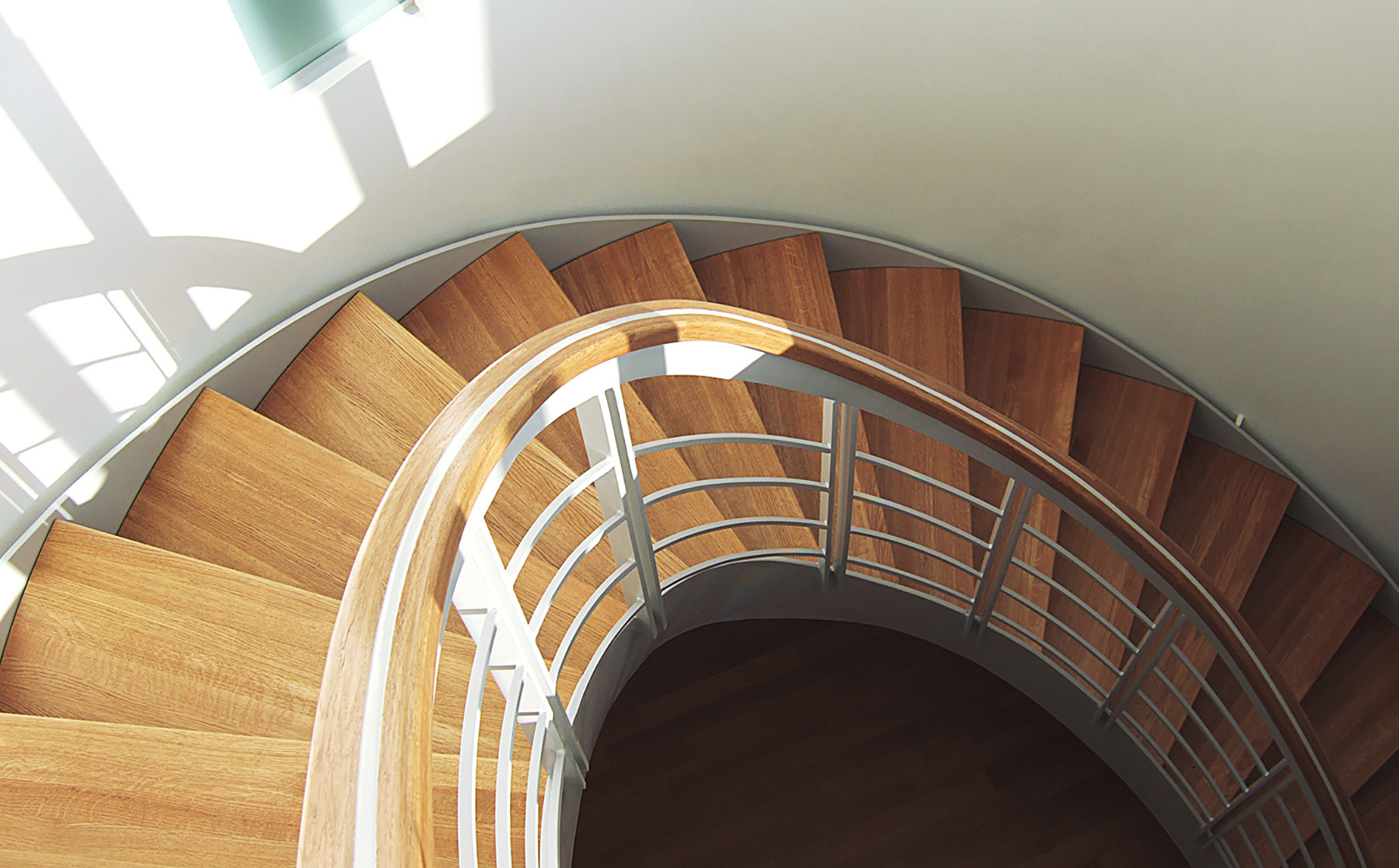 In einem "runden Eckhaus" aus den 1920er Jahren ist in Dach- und drittem Obergeschoss eine hochwertige, ca. 250 m² große Maisonettewohnung entstanden. Raumprägend ist die vorgefundene Grundrissgeometrie konzentrischer Kreisbögen, die sich in der Dachhaut zu Kegel- bzw. Trichterflächen ausformt. Eine freitragende, elliptisch gewendelte Stahltreppe verbindet die beiden Ebenen, zwei eingeschnittene Dachloggien und drei Flachdachgauben ergänzen und gliedern das spannungsreiche, großzügige Raumvolumen.