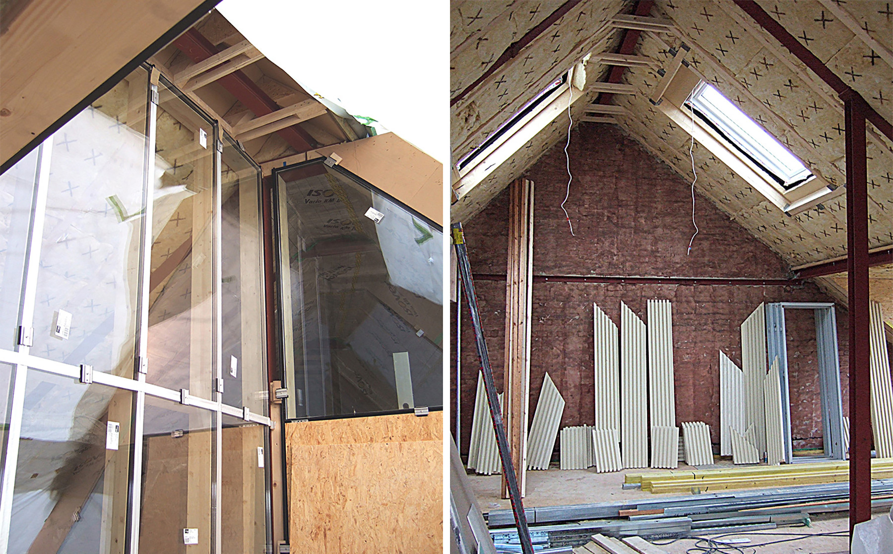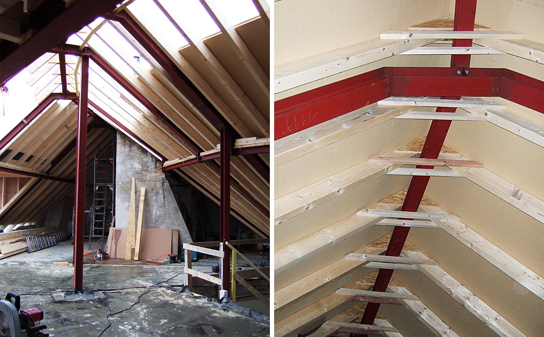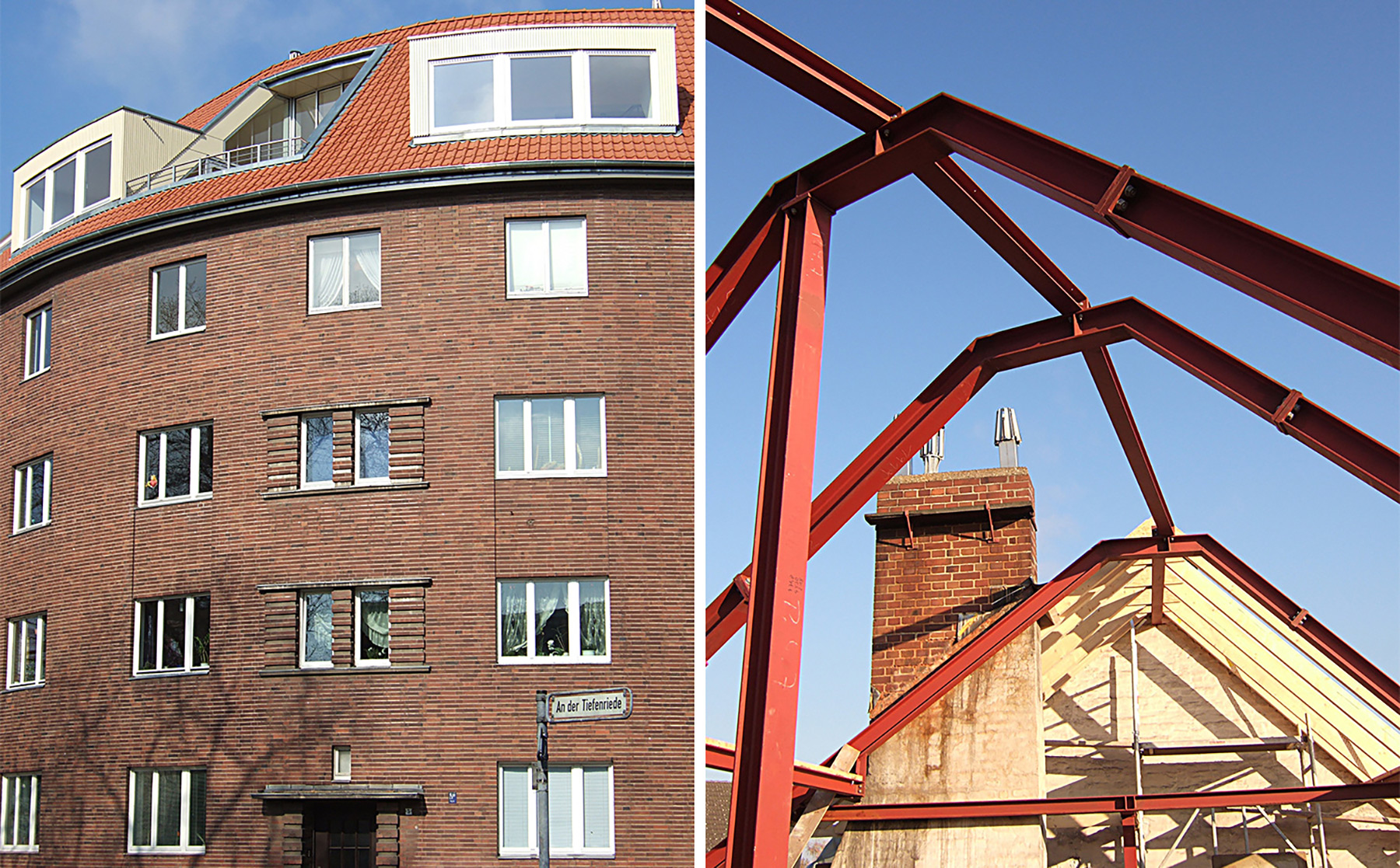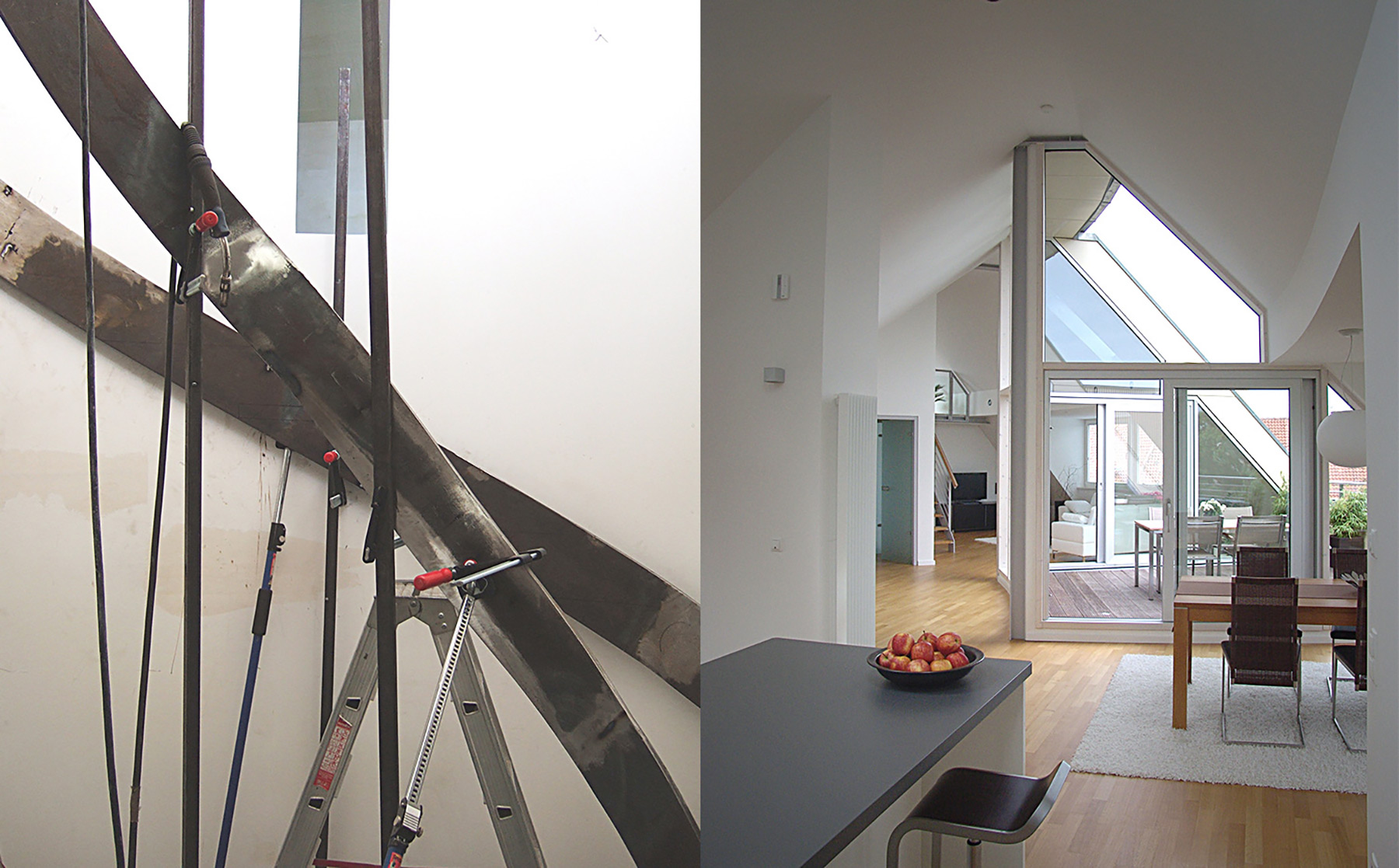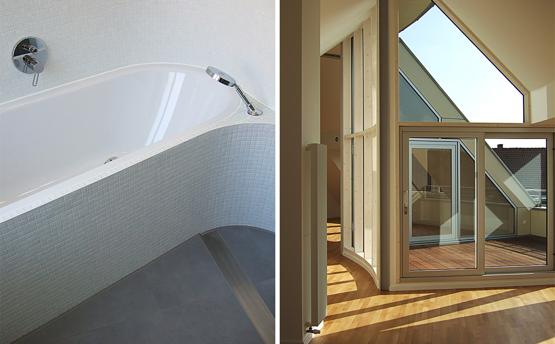 Die runde Geometrie war für alle am Bau Beteiligten eine große Herausforderung, die in hoher Ausführungs- und Detailqualität kostenbewusst realisiert werden konnte. Da der vorgefundene Dachstuhl für den vorgesehenen Ausbau als nicht mehr tragfähig eingeschätzt und daher vollständig abgetragen werden musste, wurde das Dachgeschoss von Anfang an als "Neubau auf dem Altbau" konzipiert.