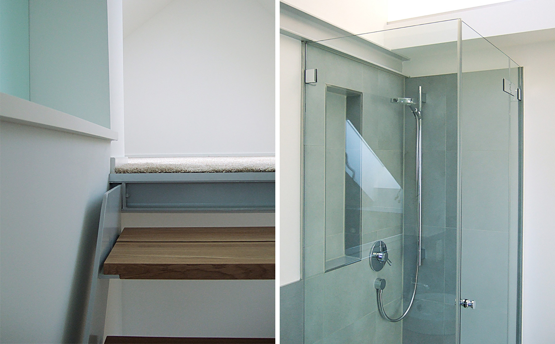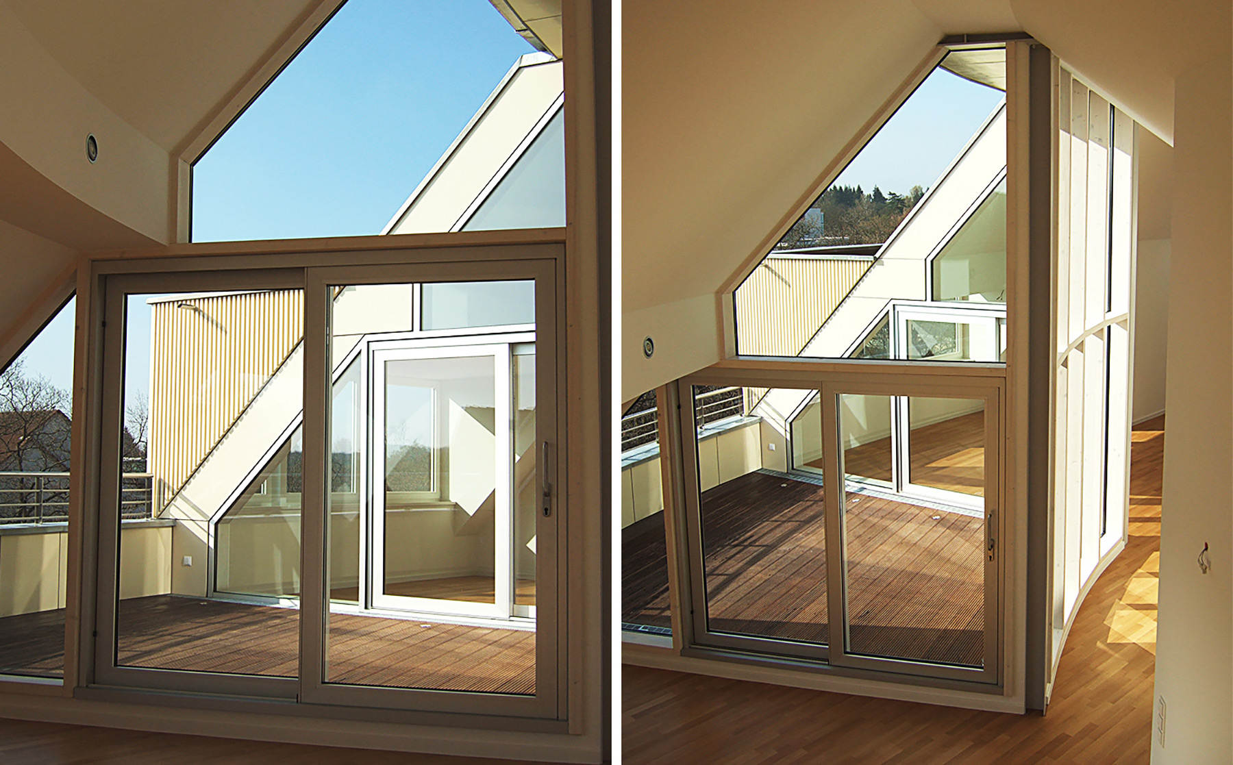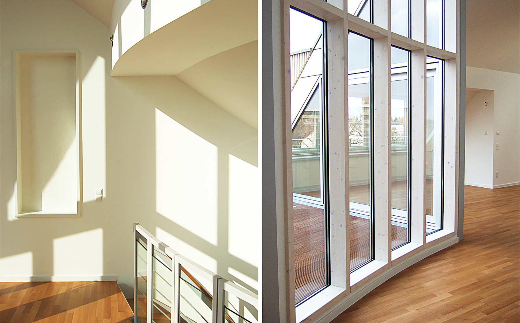 Die Raumaufteilung folgt dem Prinzip des "umgedrehten Einfamilienhauses": In der unteren Ebene schließen sich an den von oben belichteten Eingangsbereich vier Individualräume und das unkonventionelle, von der Rundung der elliptischen Treppenwand geprägte Bad mit bodengleicher Dusche an. Den Mittelpunkt der oberen Wohnebene bildet der firsthohe Einschnitt der großen, verglasten Südterrasse, der den Koch-/Essbereich sowie den Arbeitsbereich einerseits und den Wohnbereich mit Lesegalerie sowie den Gästebereich mit Gästebad und Westterrasse andererseits voneinander trennt.