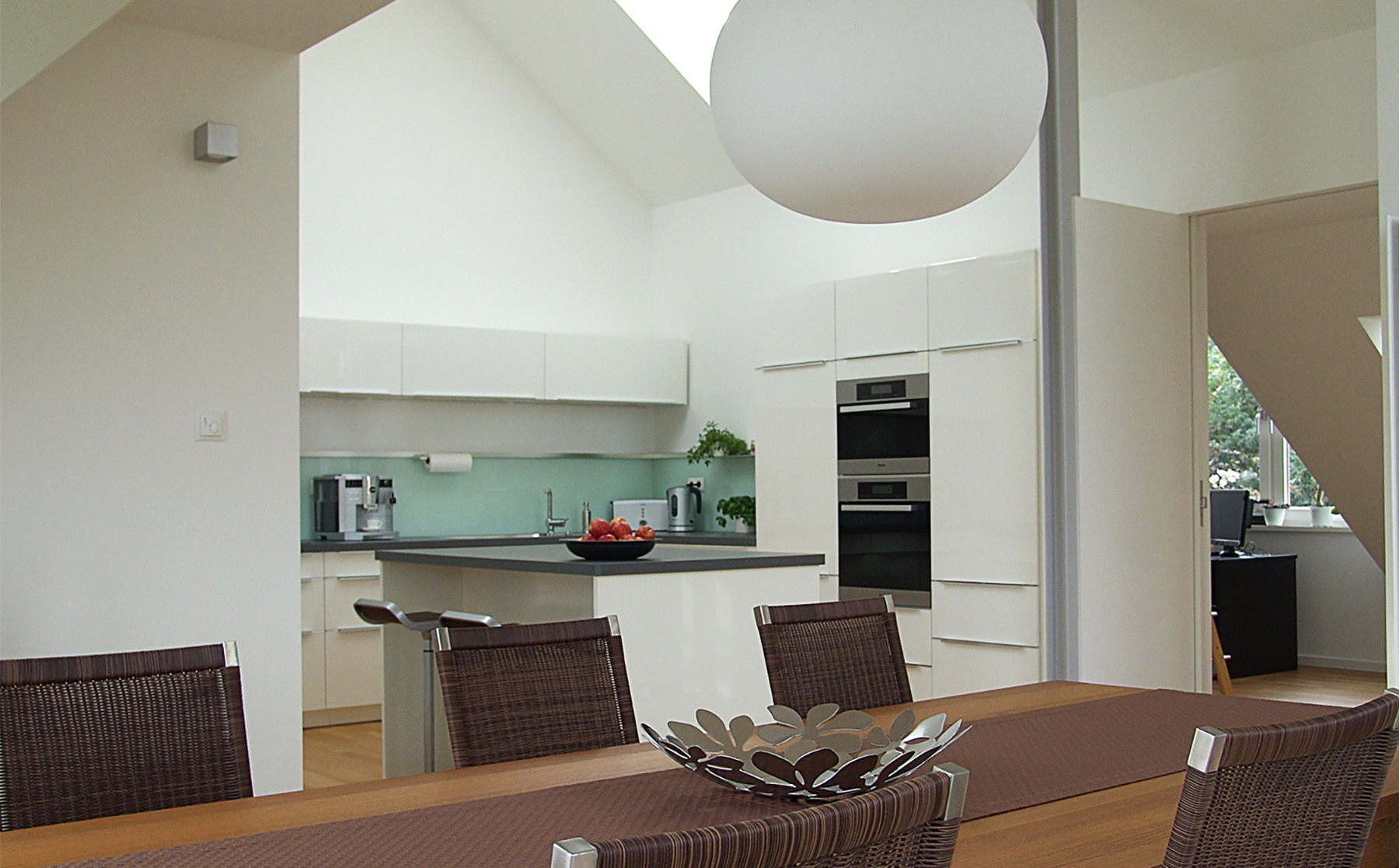 Dach- und Innenfenster, Schiebeelemente und Einbauleuchten inszenieren den Raum durch unterschiedlichste Tages- und Kunstlichtwirkungen.