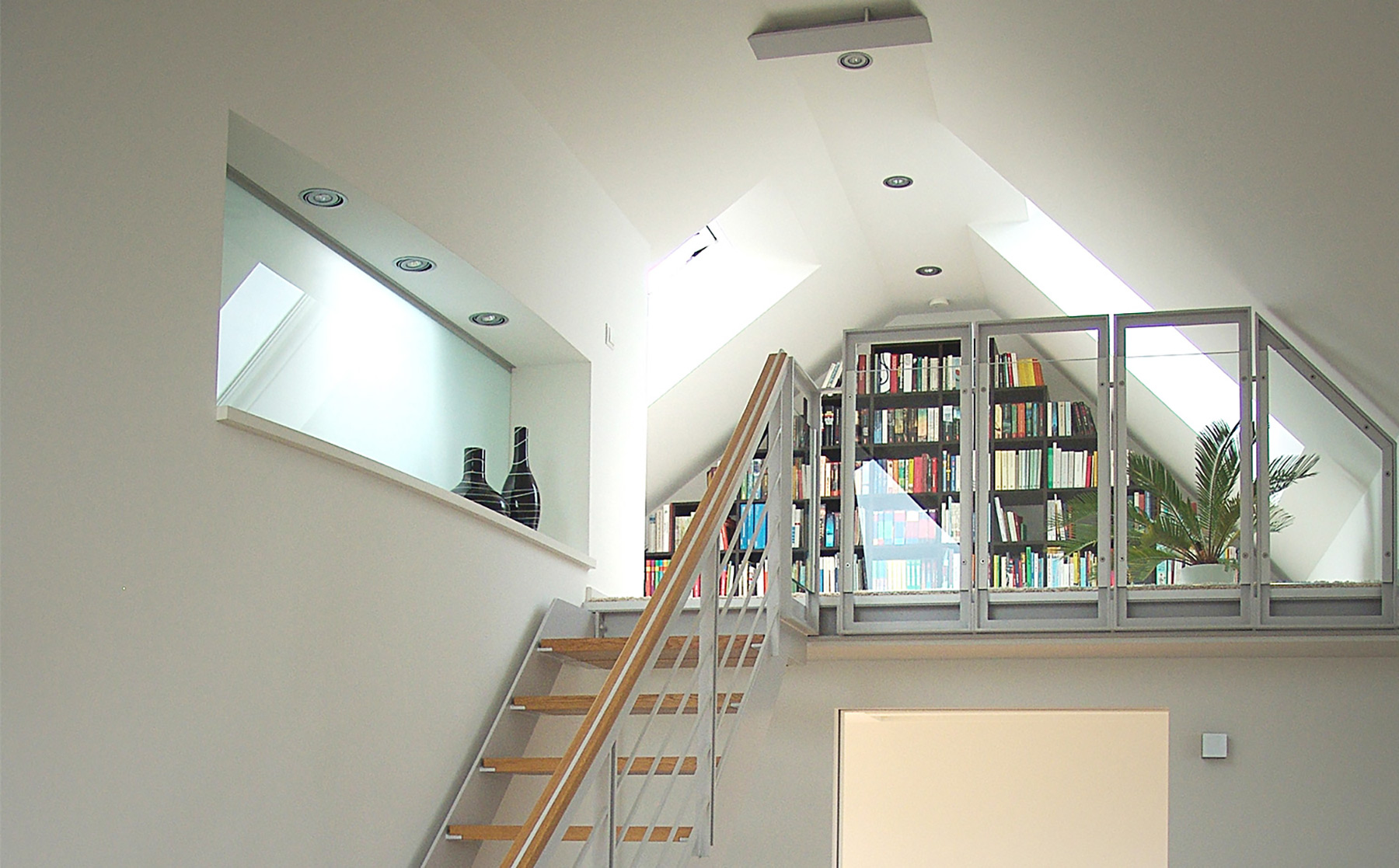 Bei diesem Objekt hatten wir auch die Gelegenheit, beratend bei der Konzeption von Einrichtung und Beleuchtung mitzuwirken. Einige Möbel wurden nach unseren Entwürfen gefertigt – so der gebogene Kleiderschrank in der Ankleide, die Garderobenschränke oder das Bücherregal auf der Lesegalerie.