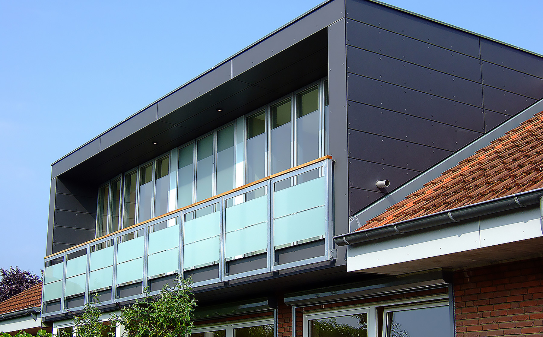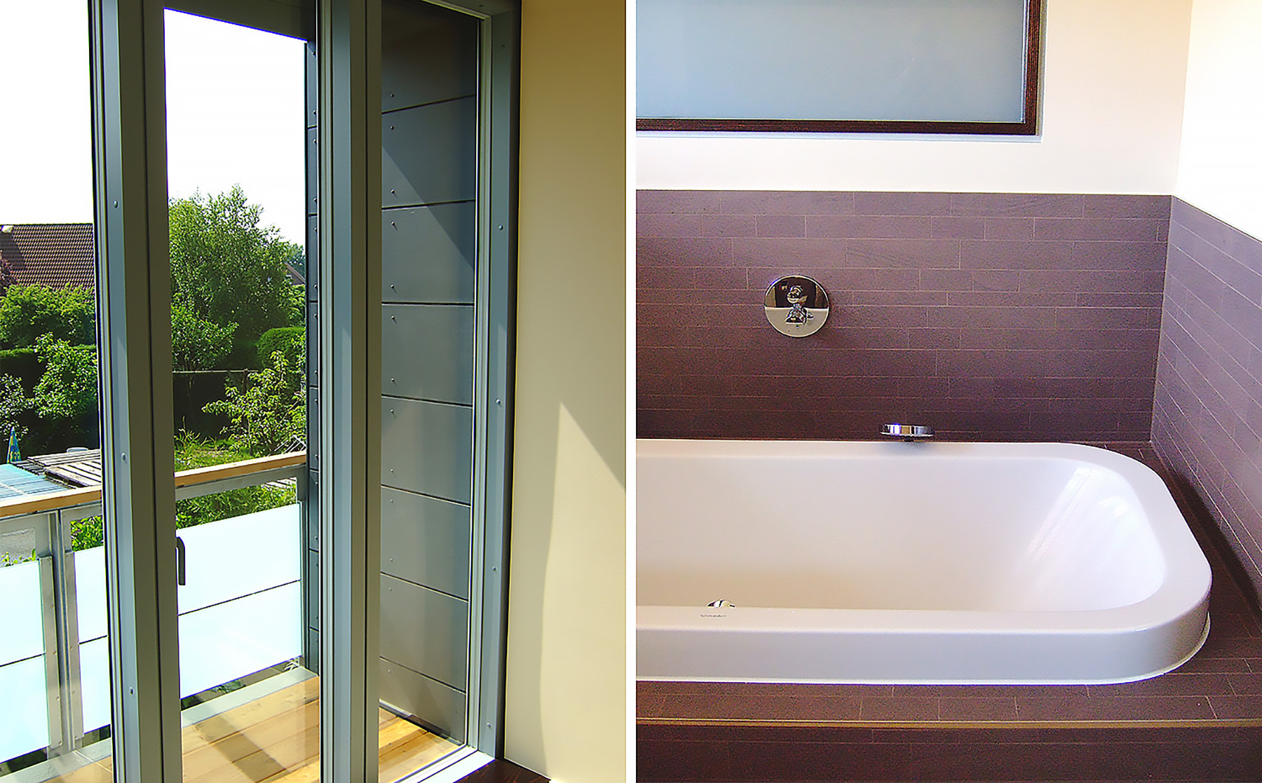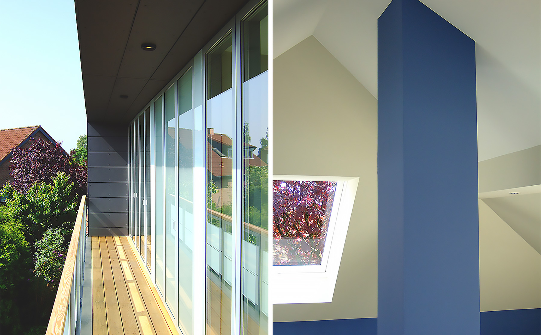 Durch die Vergrößerung der Wohnfläche und der Raumhöhen im Dachgeschoss konnte neben einem neuen Gästezimmer mit Bad den vergrößerten Kinderzimmern ein offener Spielflur zugeordnet werden. Der vorgelagerte, stegartige Balkon betont zusammen mit der einheitlichen Bekleidung aus dunklen Faserzementtafeln und den raumhohen Glaselementen die eingeschobene, rahmenartige Form des Dachaufbaus.