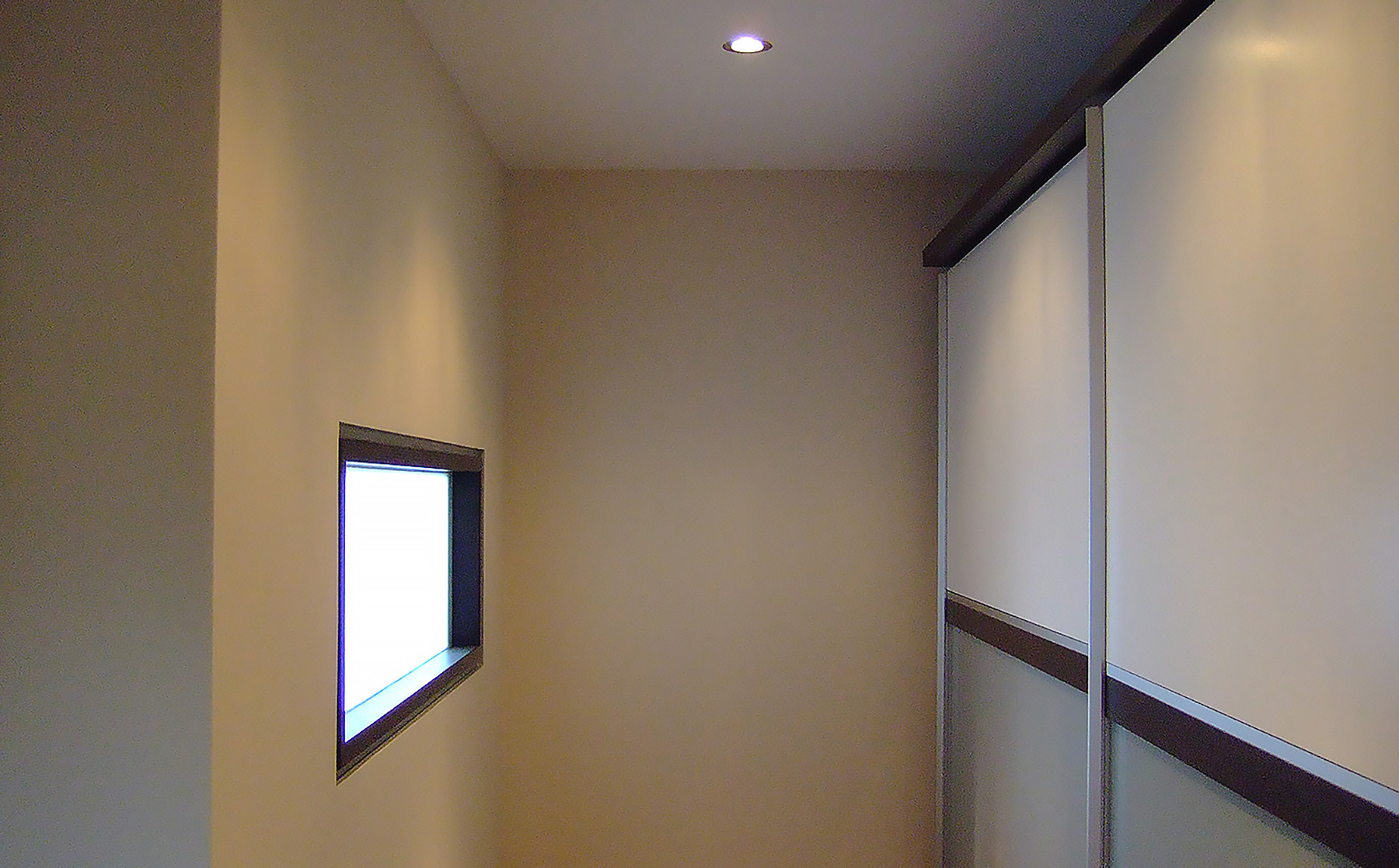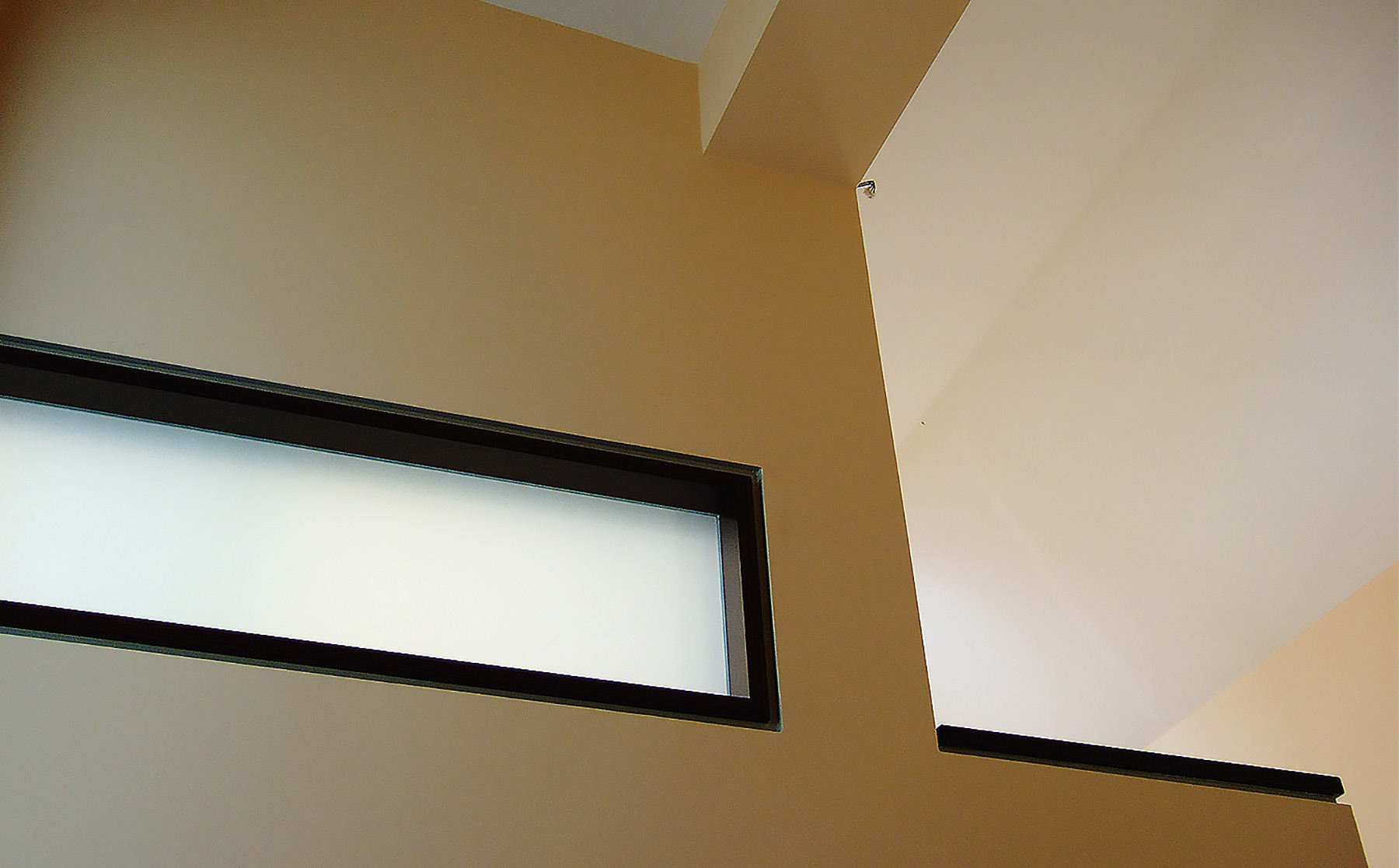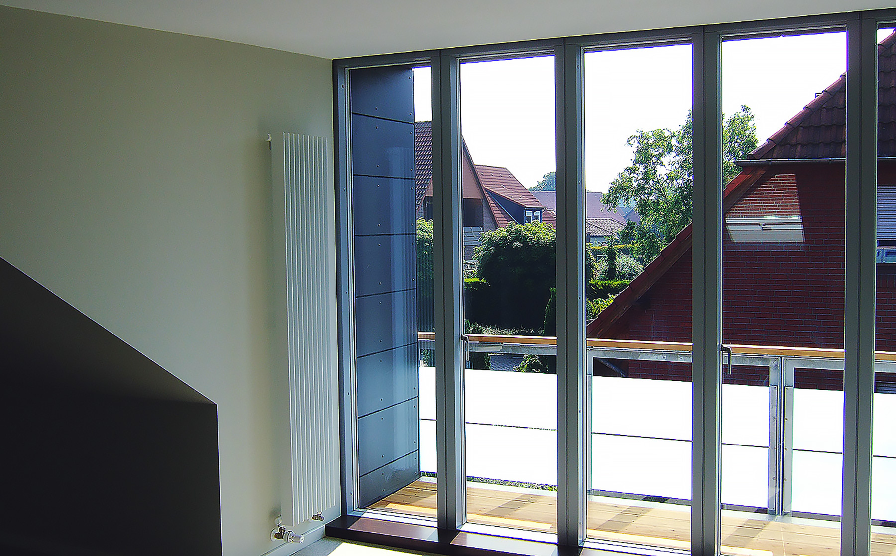 Durch die Vergrößerung der Wohnfläche und der Raumhöhen im Dachgeschoss konnte neben einem neuen Gästezimmer mit Bad den vergrößerten Kinderzimmern ein offener Spielflur zugeordnet werden. Der vorgelagerte, stegartige Balkon betont zusammen mit der einheitlichen Bekleidung aus dunklen Faserzementtafeln und den raumhohen Glaselementen die eingeschobene, rahmenartige Form des Dachaufbaus.