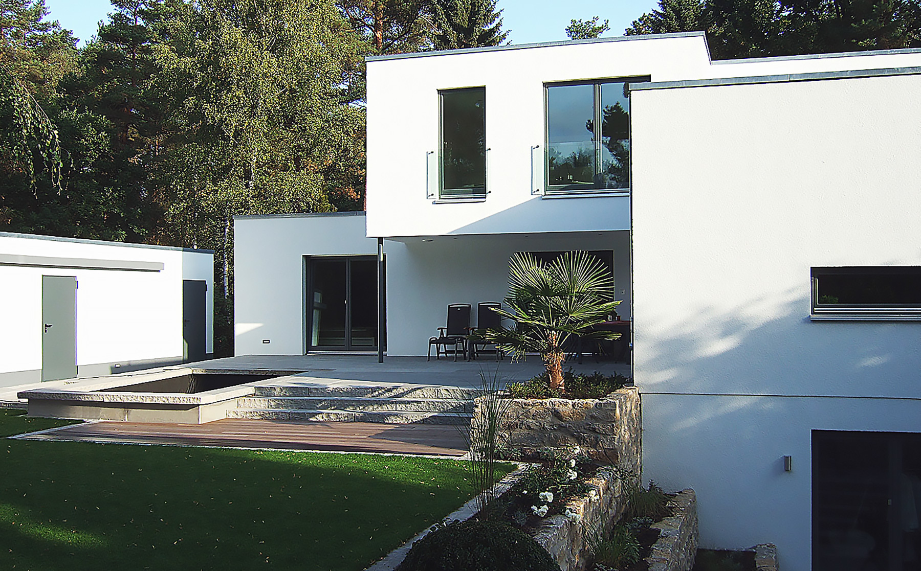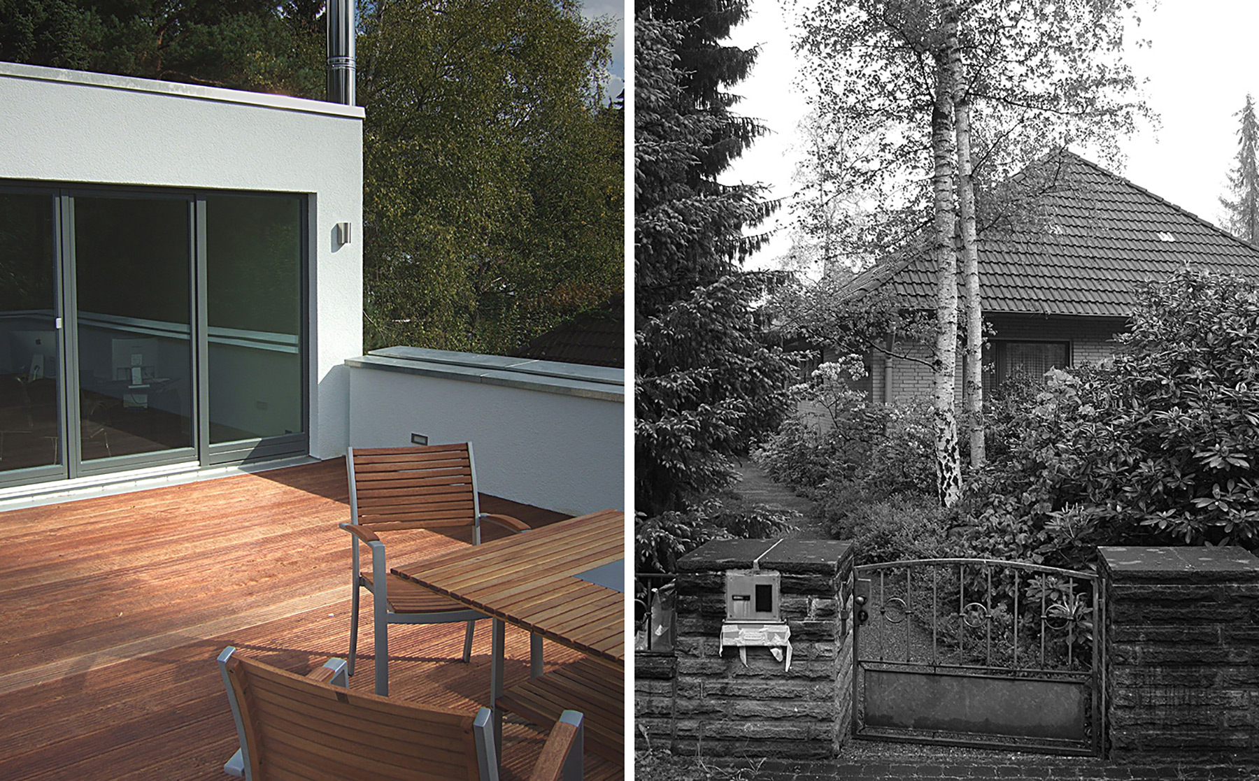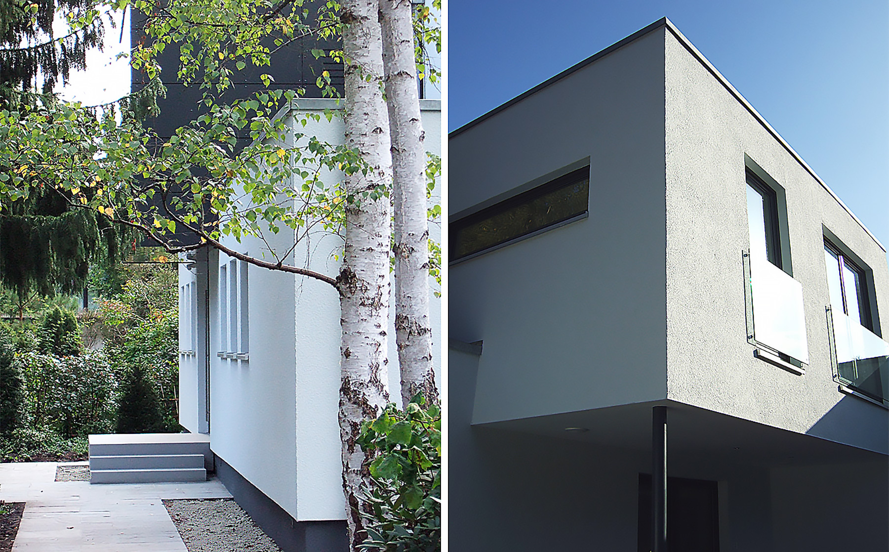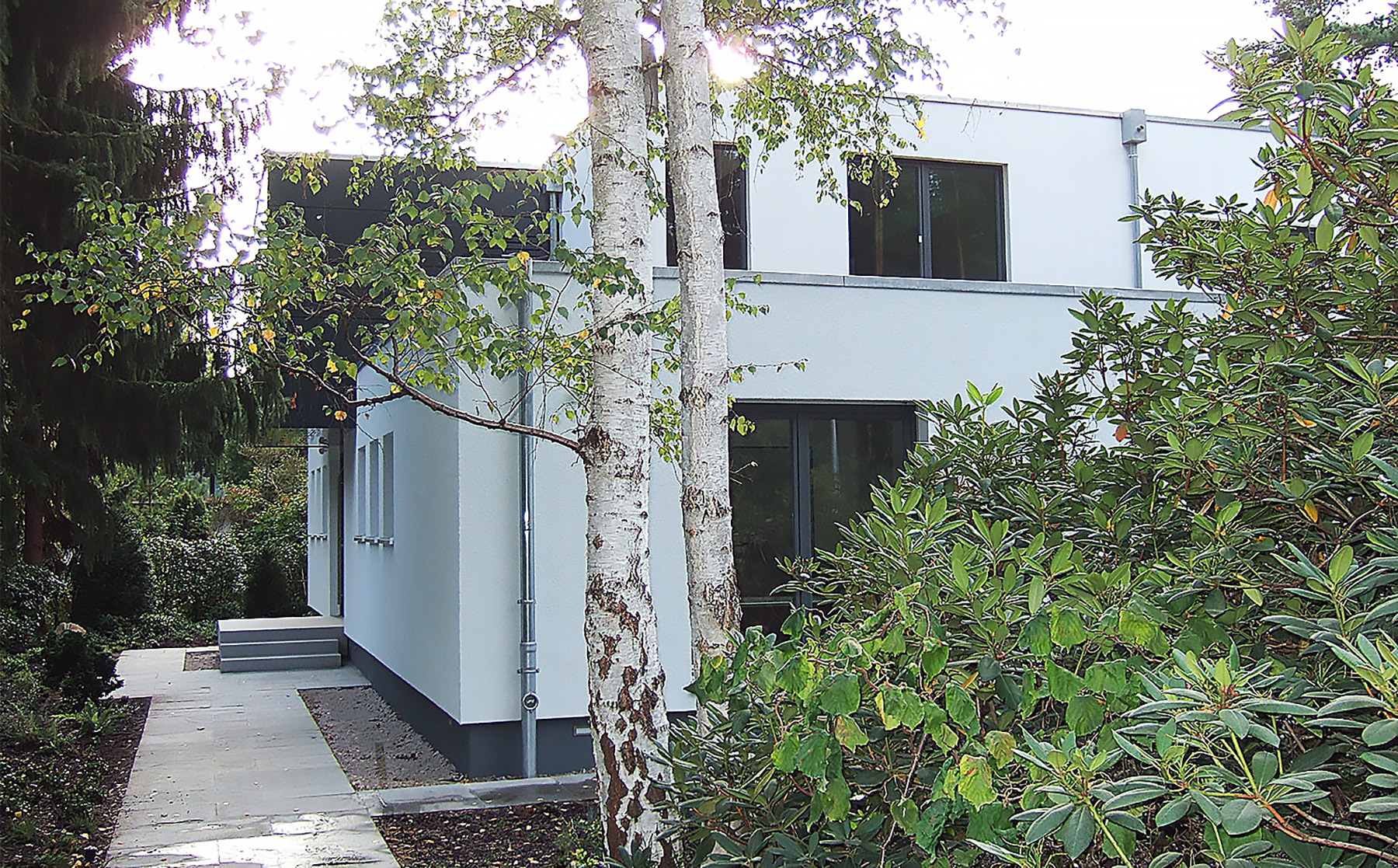 Das verklinkerte Erdgeschoss wurde gedämmt und wie das Obergeschoss mit einer hellen Putzhaut überzogen, die Flachdächer sind begrünt.