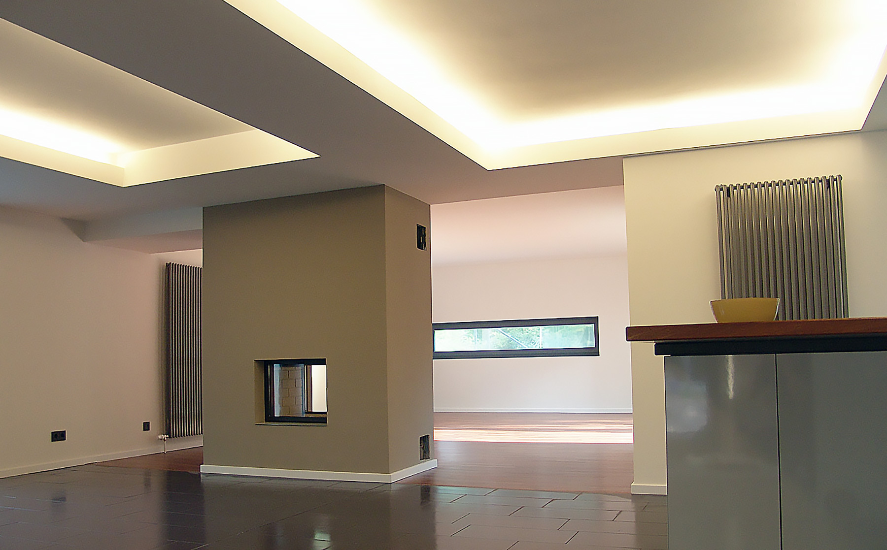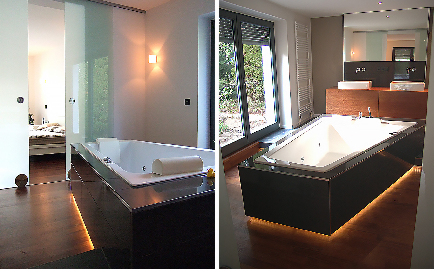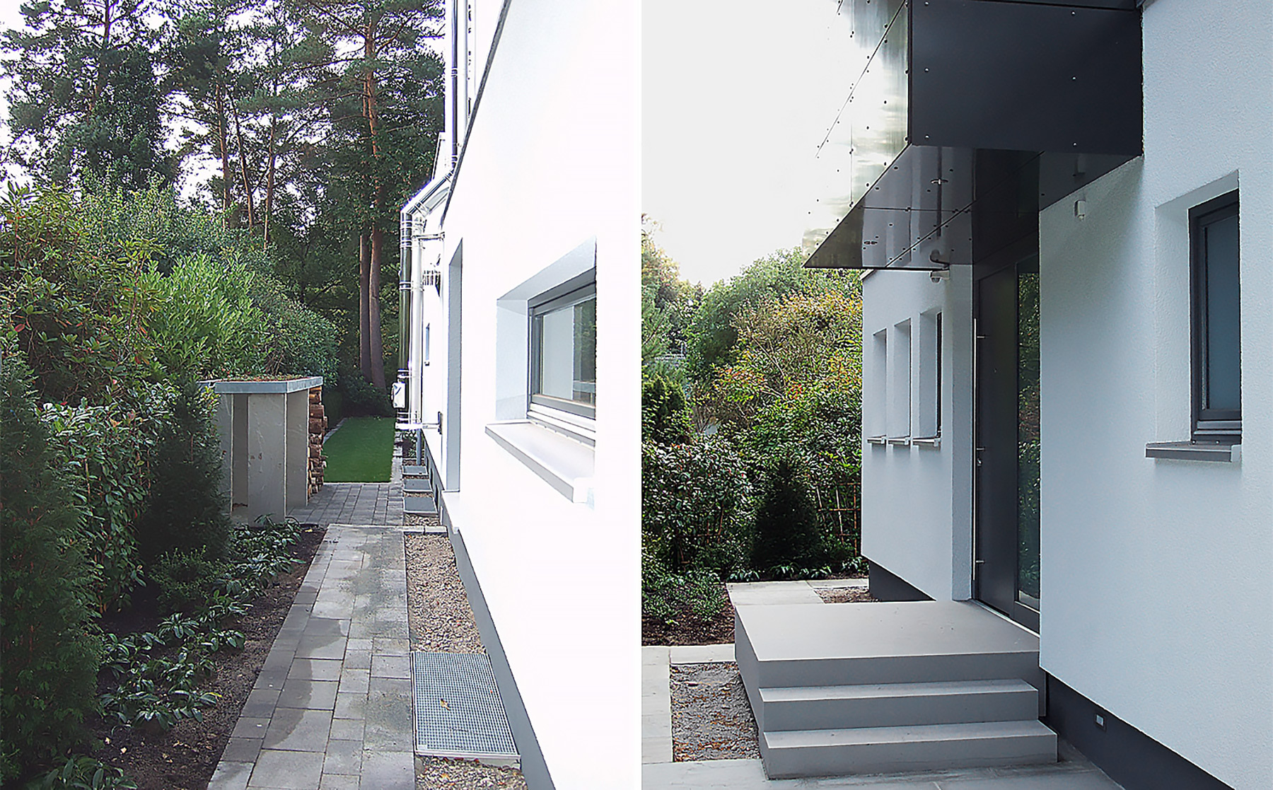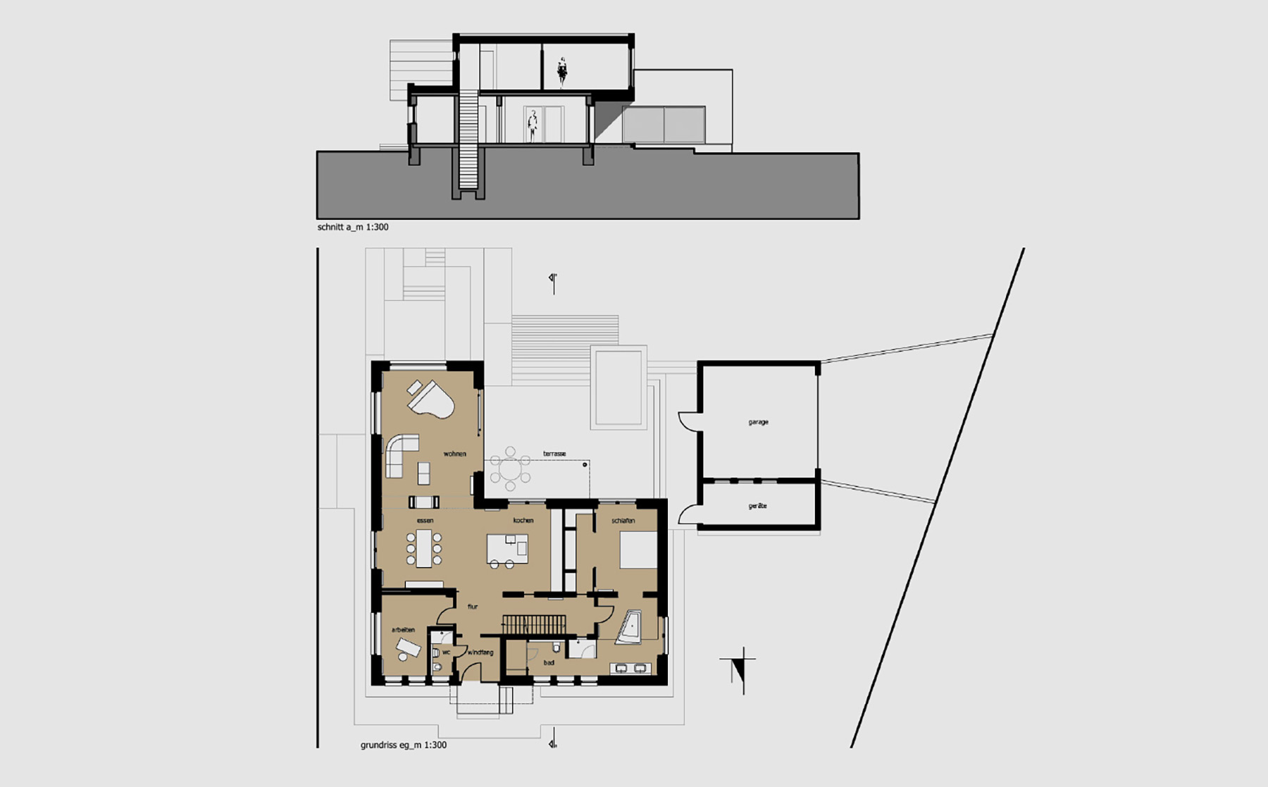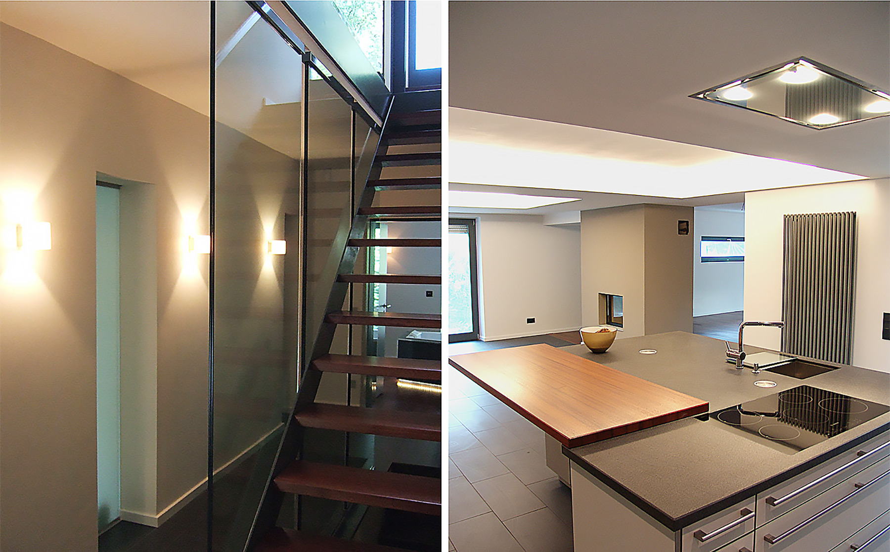 Flur, Wohn-, Ess- und Kochbereich gehen fließend ineinander über, gegliedert durch einen frei stehenden Kaminofen und eine große Glasschiebetür, über große Glasflächen mit dem Außenbereich verbunden. Das großzügige Bad mit mittig angeordneter Badewanne öffnet sich zusammen mit Schlaf- und Ankleidebereich ebenfalls zum Garten mit seinen abgestuften Grün- und Aufenthaltsflächen. Die am tiefsten gelegene Terrasse belichtet den im Keller neu entstandenen Gästebereich.