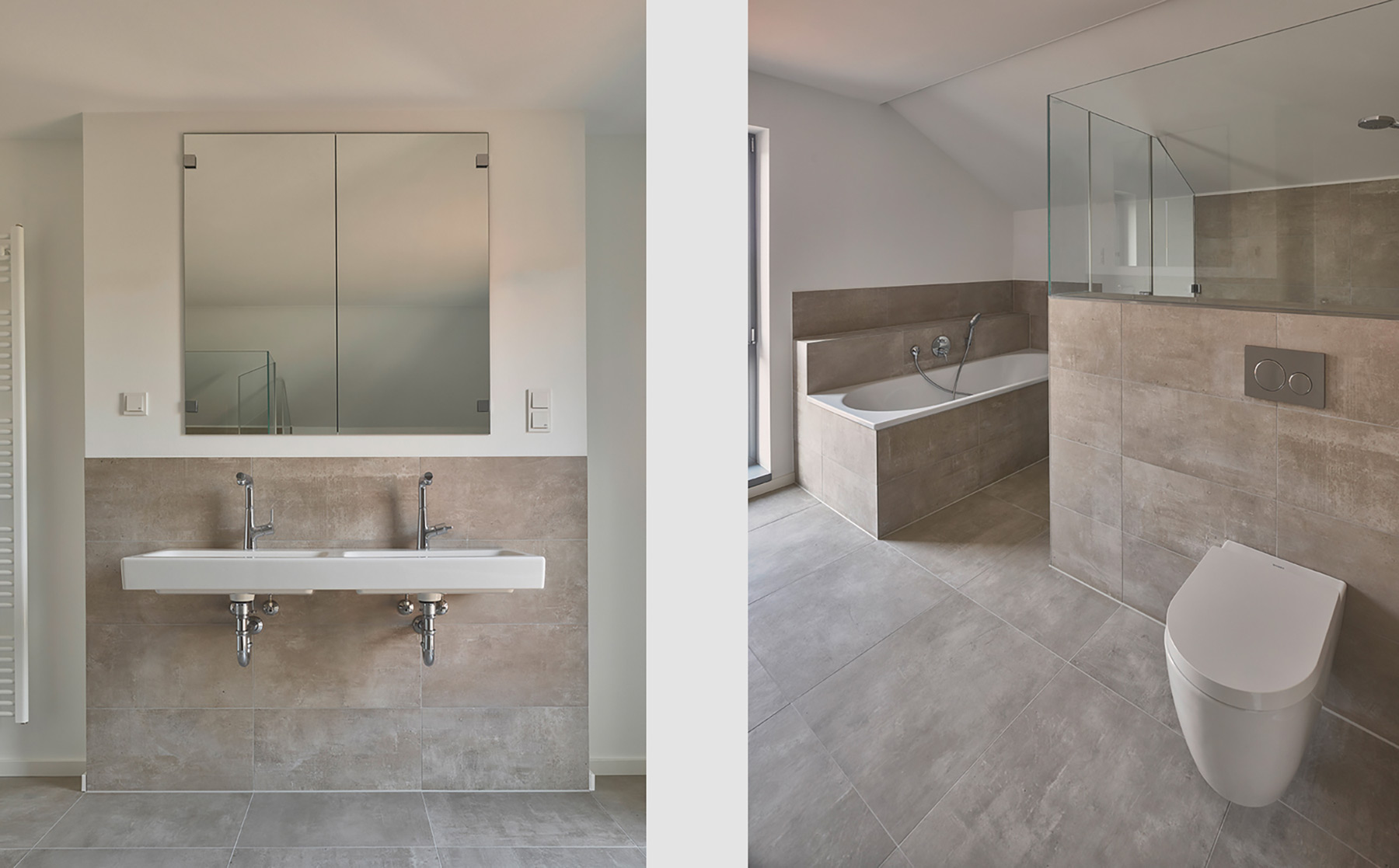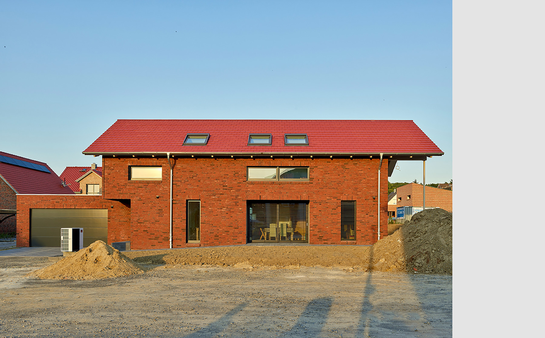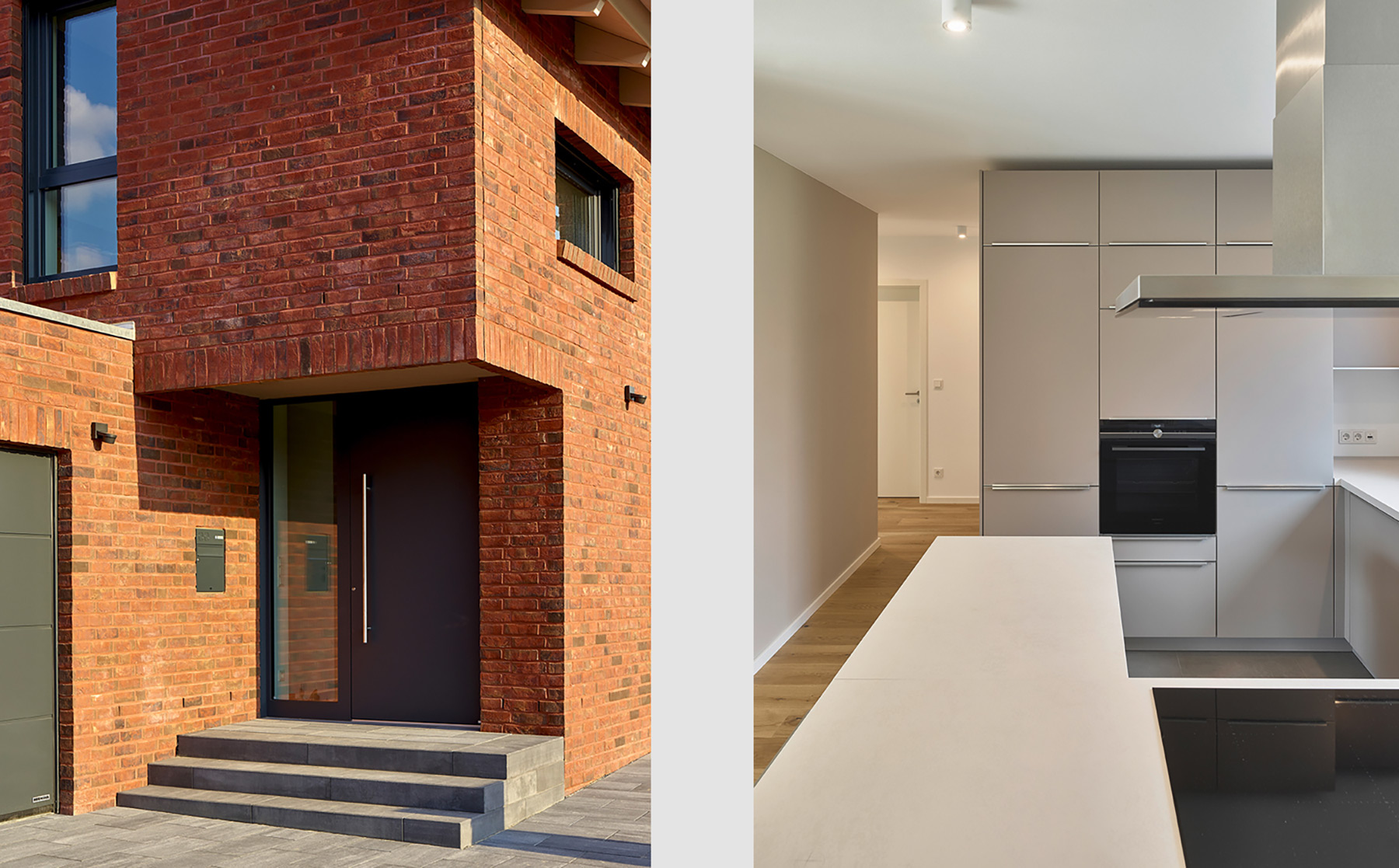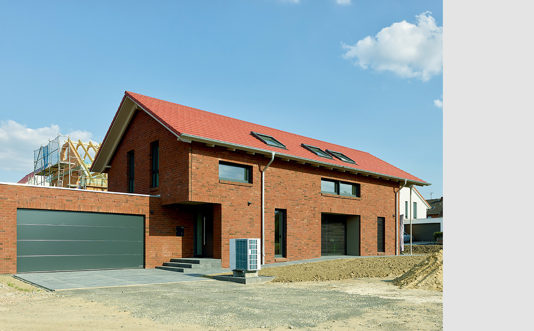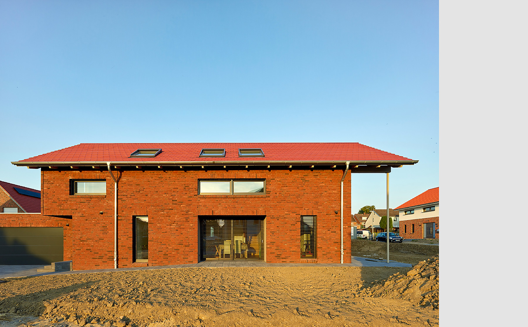 Zwei erdgeschossige Einschnitte in den Baukörper schaffen weitere geschützte Vorzonen am Gebäude: die dem Essplatz vorgelagerte Westterrasse und den nordwestseitigen Eingangsbereich. Hier wird die Flucht der Garagenaußenwand wegbegleitend im Haupthaus fortgesetzt – Garage und Wohnhaus werden so optisch verbunden. Diese Verbindung wird durch die Materialität der Fassaden unterstrichen: Die Westseite der Garage ist ebenso wie drei Seiten des Haupthauses mit Klinkermauerwerk in dunklem rotbraunen Farbton bekleidet. Für den Einschnitt an der Westseite und die südliche Giebelseite des Haupthauses wurde in Ergänzung der großflächigen Verglasungen ein Wärmedämmverbundsystem in warmgrauem Putzton gewählt.