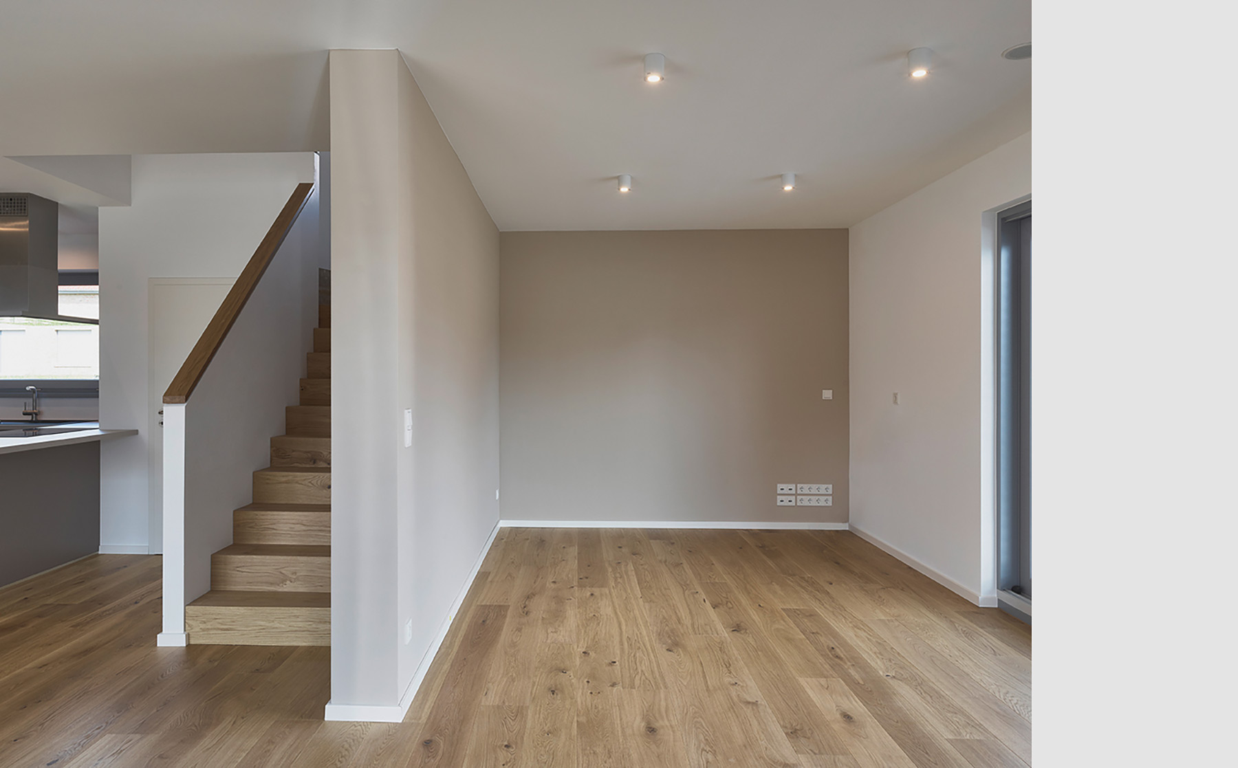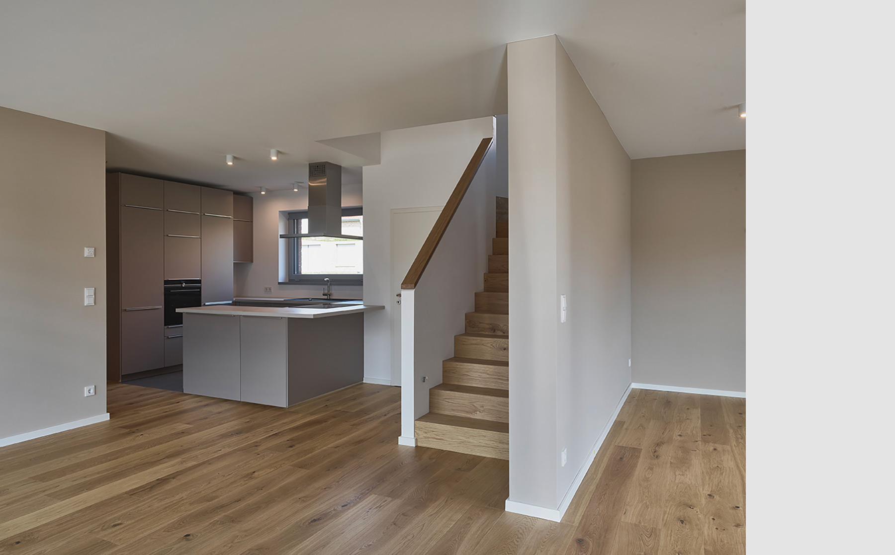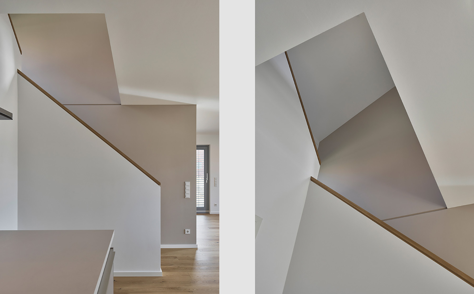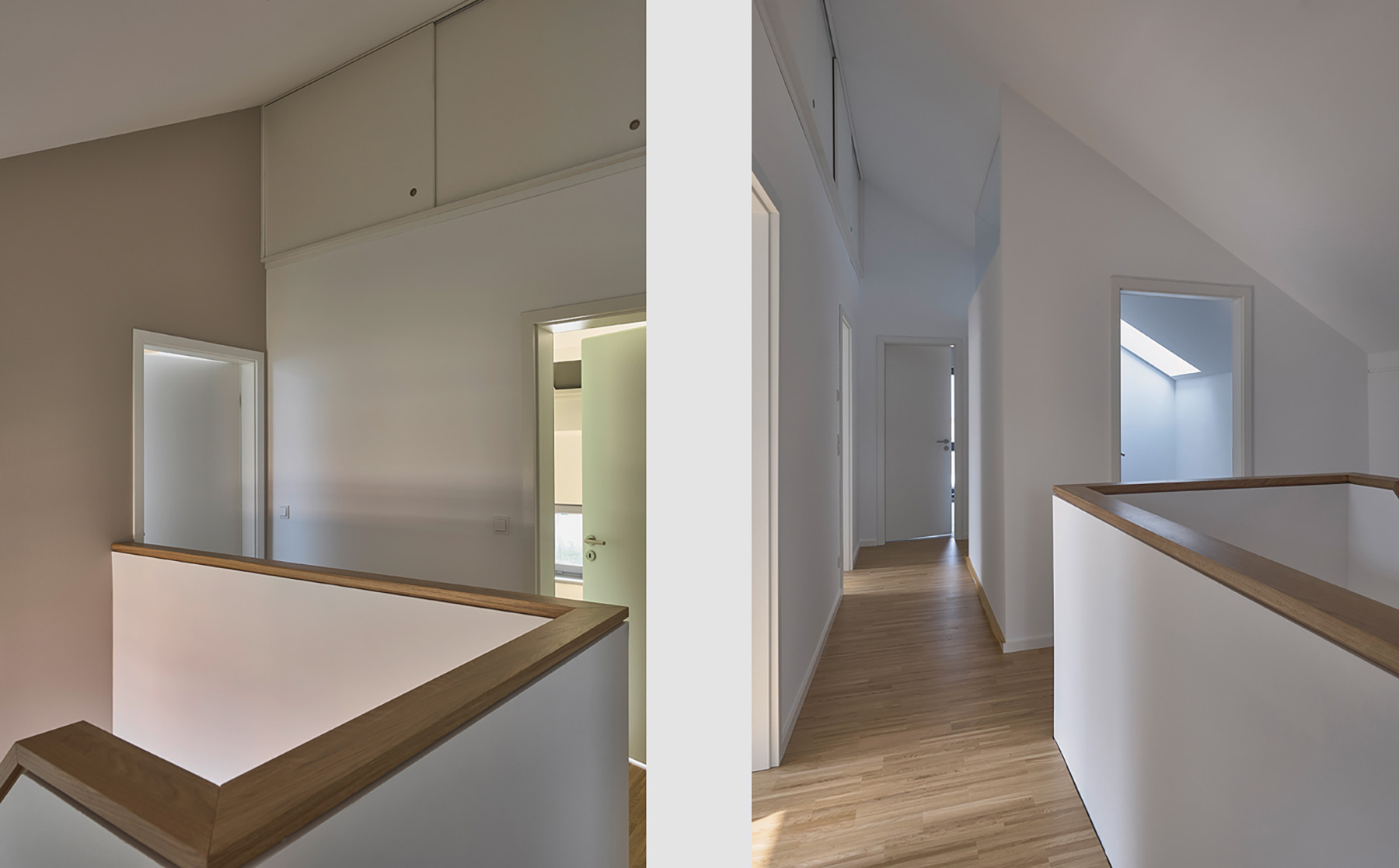 Der Hauseingang führt in eine quadratische Diele mit Garderobennische und ausreichender Bewegungsfläche. Der sich anschließende verschwenkte Flurbereich erschließt den Gästebereich mit Schlafraum und Bad sowie den Nebenraum – von diesem kombinierten Hausanschluss-, Haustechnik-, Hauswirtschafts- und Vorratsraum sind auch die Garage, der Abstellraum und der „Wirtschaftshof“ im Osten erreichbar. Die Verschwenkung des Flurs separiert den Eingangs- vom Wohnbereich und macht eine windfangartige Abtrennung überflüssig. Die Geschosstreppe und ihre begleitende Wandscheibe zonieren den großen Wohnraum in einen zentralen, L-förmigen Ess-Koch-Bereich und einen rechteckigen Sitzbereich als südlichen Abschluss des Hauses. Die Küche ist als langgestrecktes U mit Koch-„Halbinsel“ und Frühstückstresen organisiert. Im Zentrum des Raumbereichs und des gesamten Hauses befindet sich der Essplatz. Von drei Seiten kann hier Tageslicht einfallen: Das große Schiebeelement öffnet den Raum zur Westterrasse, die östlichen Fassadenöffnungen bringen die Belichtung aus unterschiedlichen Ebenen in den Raum und zum Süden öffnet sich der Wohnbereich mit einem weiteren großen Schiebeelement zur vorgelagerten Südterrasse. Das Dachgeschoss besitzt durch die Drempelhöhe von 1.80 m und die Dachneigung von 30° angenehme Raumproportionen und bis zu den Traufseiten gut nutzbare Flächen. Die Treppe mündet in den offenen Flurbereich mit anschließendem Arbeitsraum, welcher durch eine großzügige Glasfuge den weiteren Flurbereich belichtet. Hiervon werden die beiden Kinderzimmer an der Süd- und Westseite sowie das Schlafzimmer mit Ankleide und das Familienbad an der nördlichen Giebelseite erschlossen. In den Kinderzimmern sind in den Drempelflächen niedrige Lichtbänder angeordnet, die (kindgerechte) Ausblicke in den Garten bieten. Dachflächen- und ein Giebelfenster sorgen zusätzlich für ausreichende und spannungsreiche Belichtung.