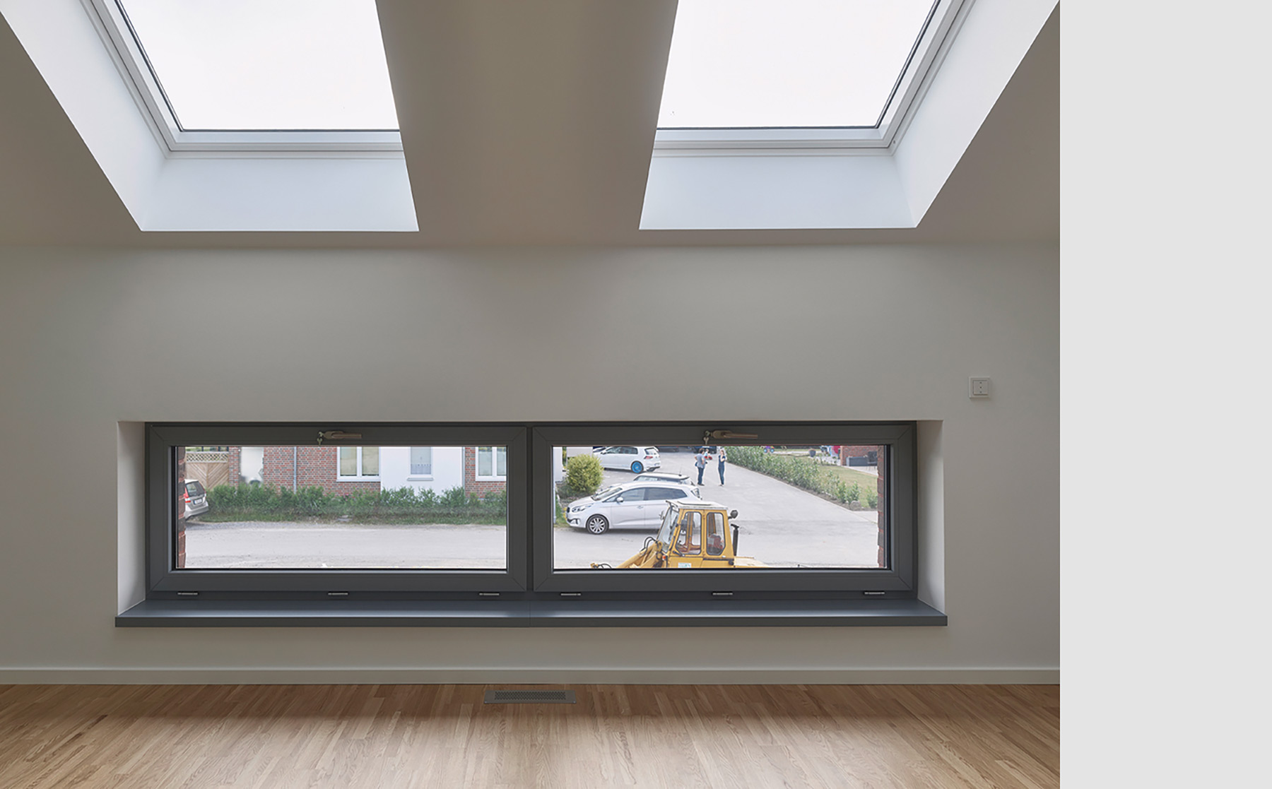 Neben den Schiebeverglasungen zum erdgeschossigen Ess- und Wohnbereich beschränken sich die Fassadenöffnungen auf zwei Formate: stehende, bodentiefe Fenstertüren und liegende, lichtbandartige Klappfenster. Im Erdgeschoss und im Dachgeschoss sind die dunkelgrauen, dreifach verglasten Kunststofffenster mit Raffstoren bzw. Rollläden ausgestattet. Die Dachfläche ist mit Flachziegeln in rot-braunem Farbton gedeckt; Dachflächenfenster mit Sonnenschutz ergänzen die Belichtung der Dachgeschossräume.