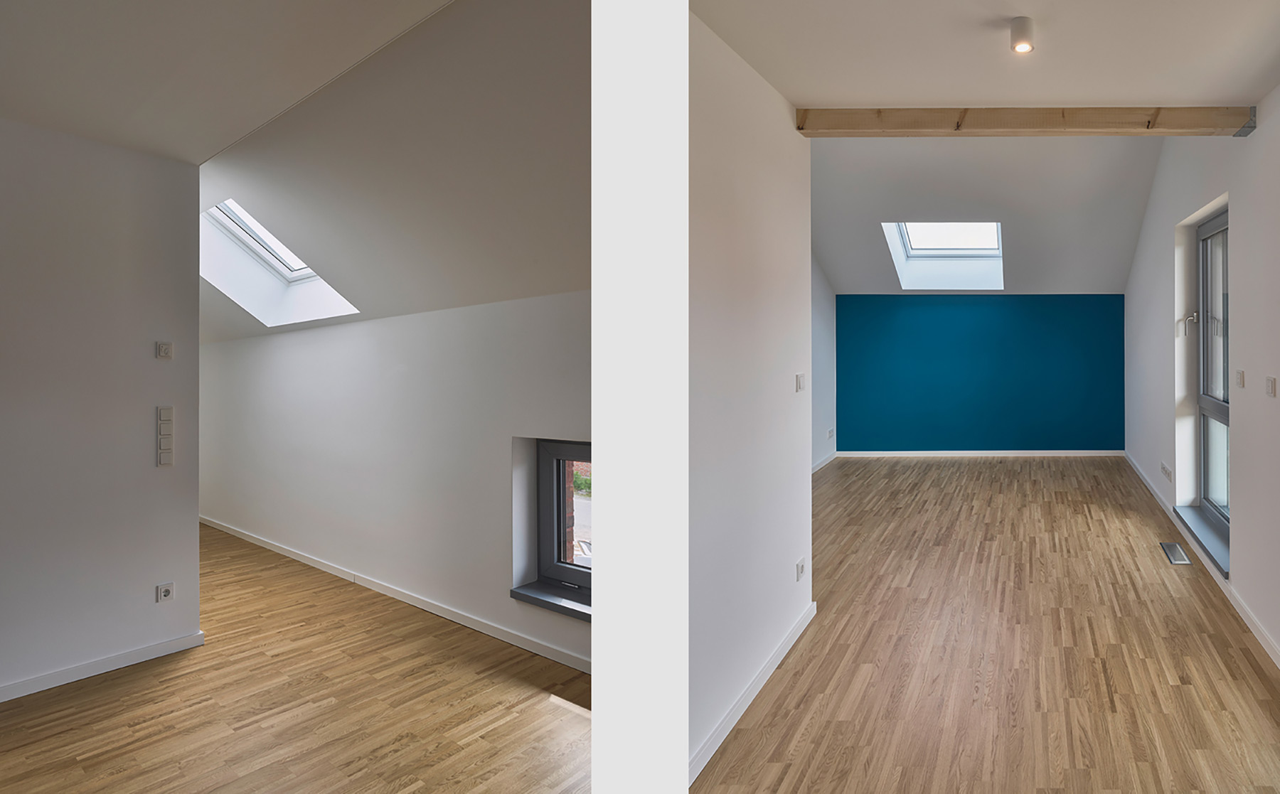 Den nordwestlichen Bereich des Dachgeschosses nimmt der Elternbereich mit der Ankleide als Durchgangsraum und dem Schlafzimmer ein. Dieser Bereich ist zusätzlich zu den Fassadenöffnungen durch Dachfenster belichtet.