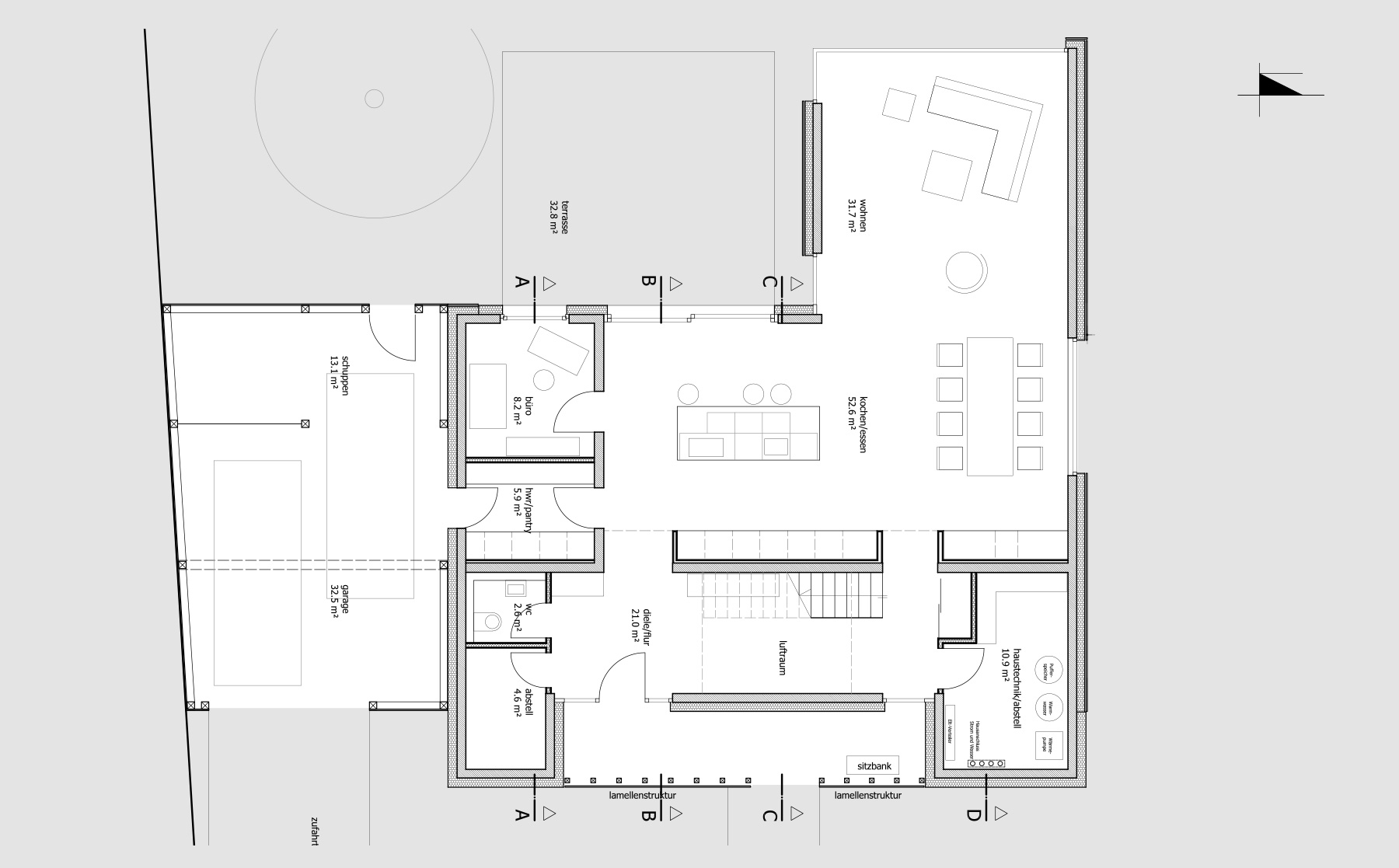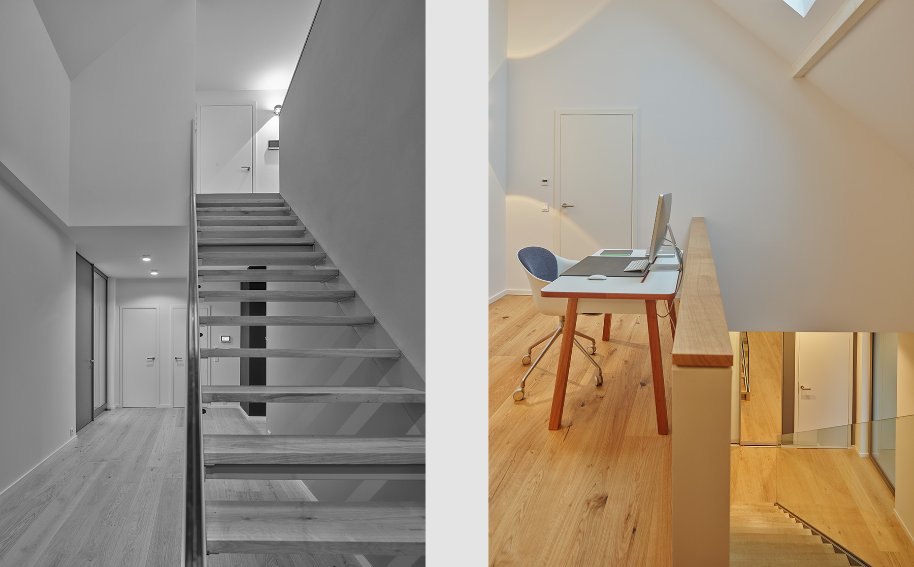 Im Inneren fungiert eine offene Diele mit Garderobenbereich, angrenzendem Gästebad und Abstellräumen als zentraler Verteiler. Die Diele ist geprägt durch ihren Luftraum ins Dach und eine querstehende Wandscheibe mit einläufiger Treppe. Die trennende Funktion der Wandscheibe wird geschickt durch zwei breite Öffnungen unterbrochen und eröffnet damit vielfältige Durchblicke durch das gesamte Haus. Hinter der Wandscheibe liegt der offene Kochbereich, daneben eine separate Pantryküche und ein Büroraum. An der anderen Seite des Kochbereichs schließen Ess- und Wohnbereich an, durch großformatige Fenster öffnet sich der großzügige L-förmige Raum zum Garten und zu der zweiseitig geschützten Terrasse.
