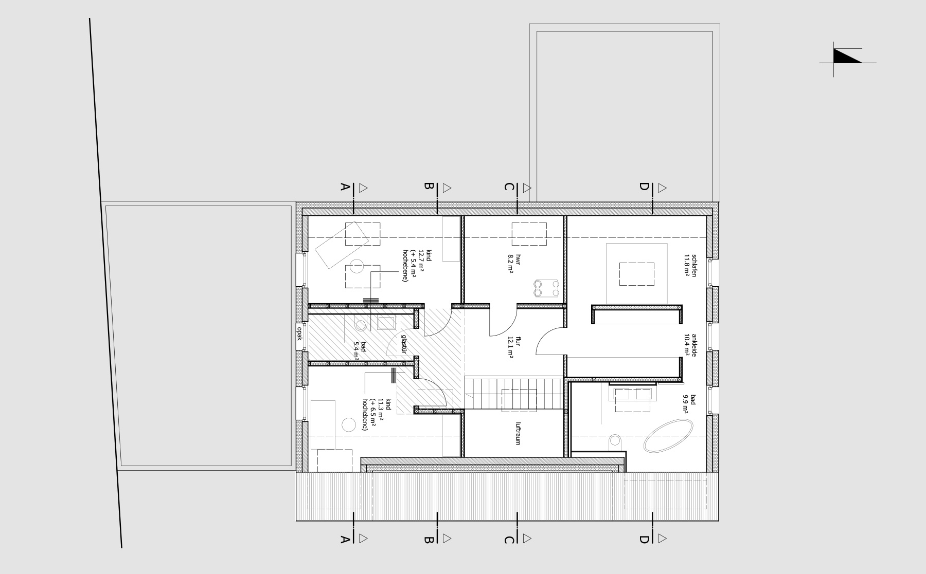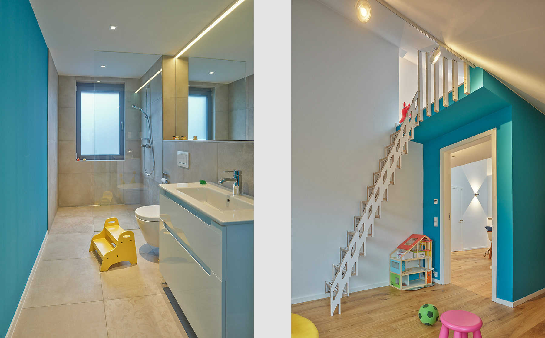 Im Dachgeschoss befindet sich an der Nordseite der Elternbereich mit Schlafzimmer, Ankleide und einem Ensuite-Bad. An der Südseite sind zwei Kinderzimmer mit über Treppen erreichbaren Hochebenen und das Kinderbad untergebracht. Ein Hauswirtschaftsraum ist zentral zwischen diesen Bereichen angeordnet.