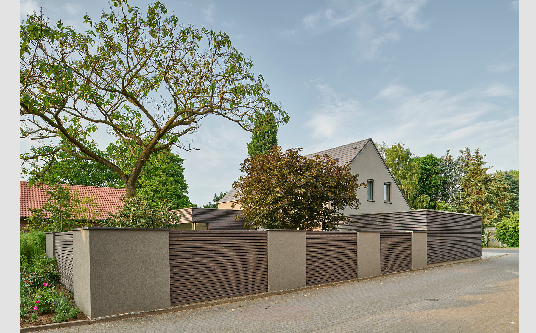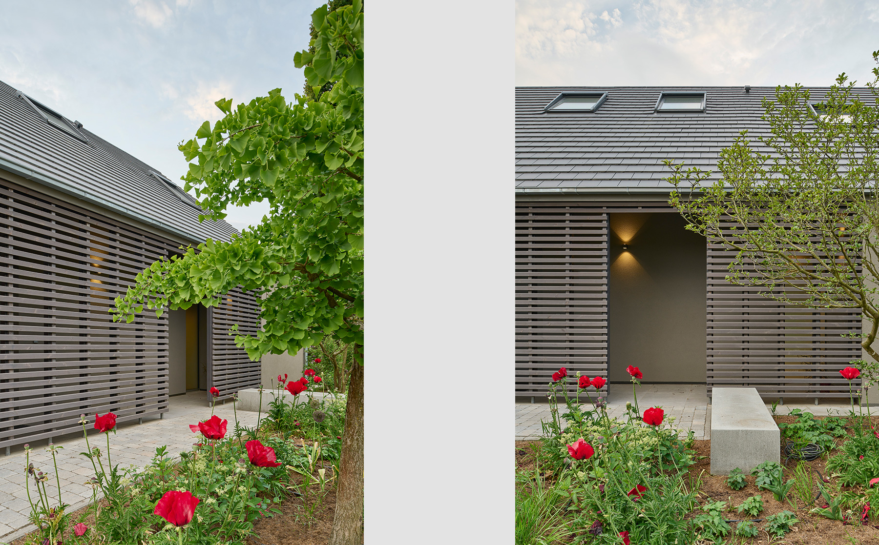 Das traufständige Satteldachhaus erhielt einen beigegrauen Putz und eine Deckung aus mittelgrauen Flachdachziegeln. Es wird durch zwei eingeschobene, eingeschossige Kuben ergänzt, die mit Holzlamellen bekleidet sind. Der straßenseitige, eingeschossige Baukörper nimmt Garage und Schuppen auf, mit dem zweiten schiebt sich der Wohnbereich hinein in den Garten. Durch ihre Positionierung rahmen die Kuben das Grundstück und schaffen Privatheit. Der Eingangsbereich auf der Ostseite des Wohnhauses ist ein wenig zurückgesetzt, seine raumhohen Glaselemente werden durch eine vorgelagerte Holzlamellenstruktur vor direkten Einblicken geschützt. Dadurch erhält der Empfangsbereich den Charakter eines Vestibüls.