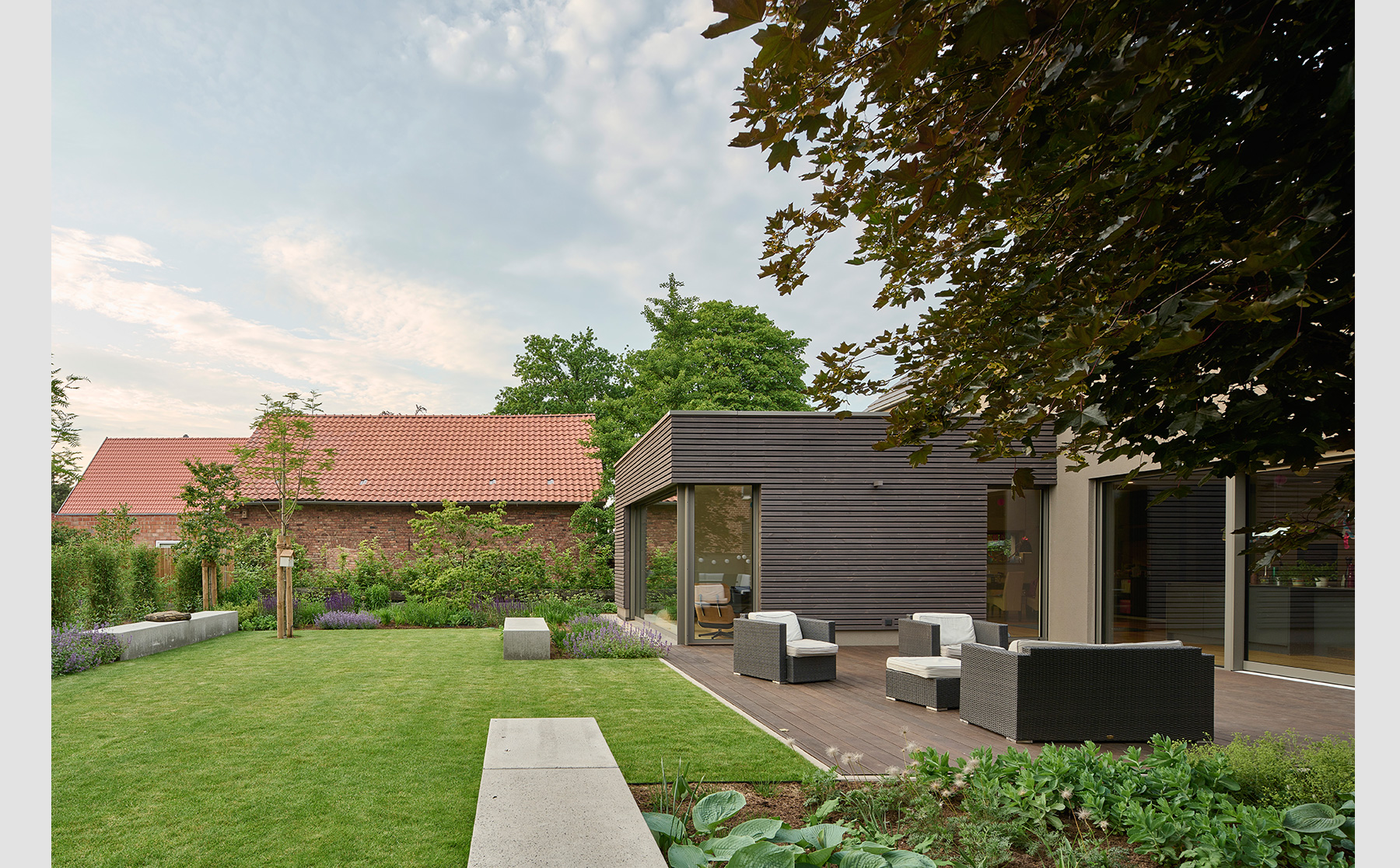 Das Einfamilienhaus wurde auf einem unbebauten Grundstück im Ortskern von Osterwald errichtet und behutsam in die bestehende Bebauung eingefügt. Die Platzierung des Gebäudes im Nordosten des Baugrundstücks fasst den Straßenraum, gleichzeitig entsteht ein großzügiger Gartenbereich.