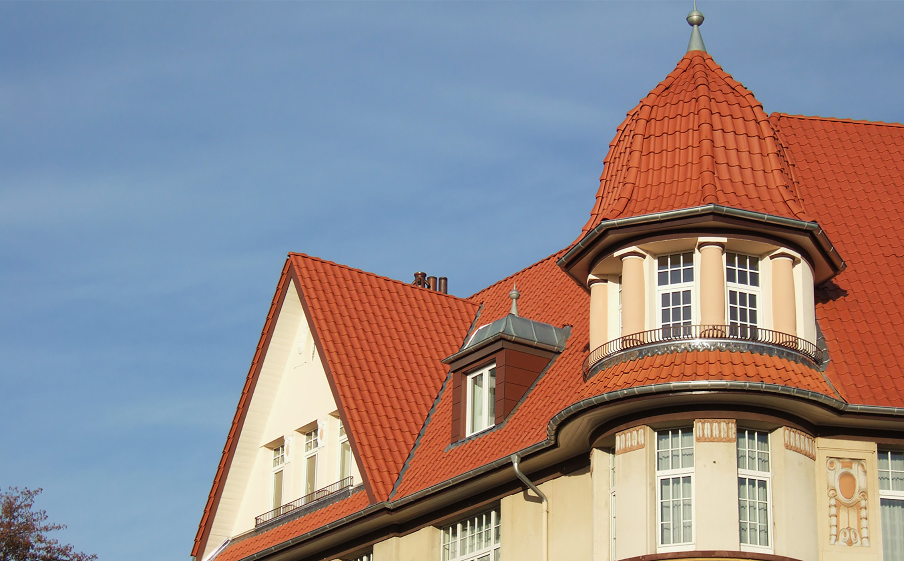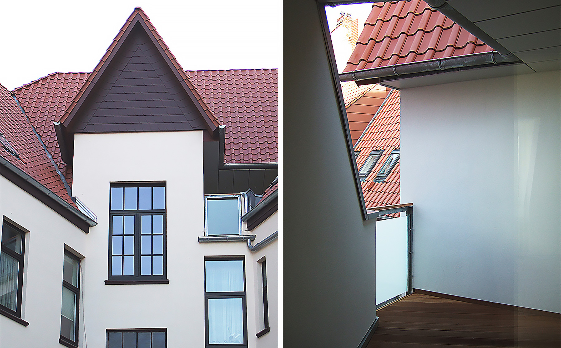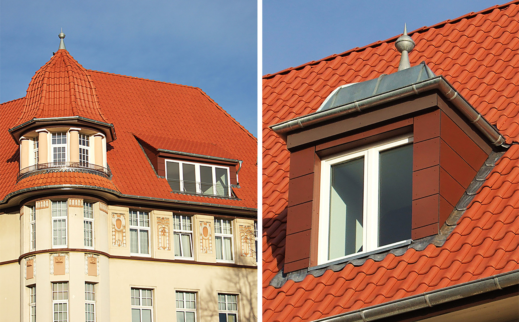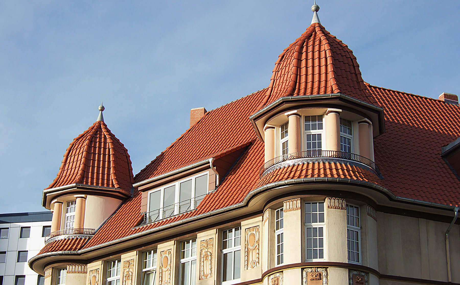 Das mehrfach gewalmte Dach des Mehrfamilienhauses aus dem Jahr 1912 mit seinen Türmen und Gauben wurde 2007 gedämmt und vollständig neu gedeckt.
